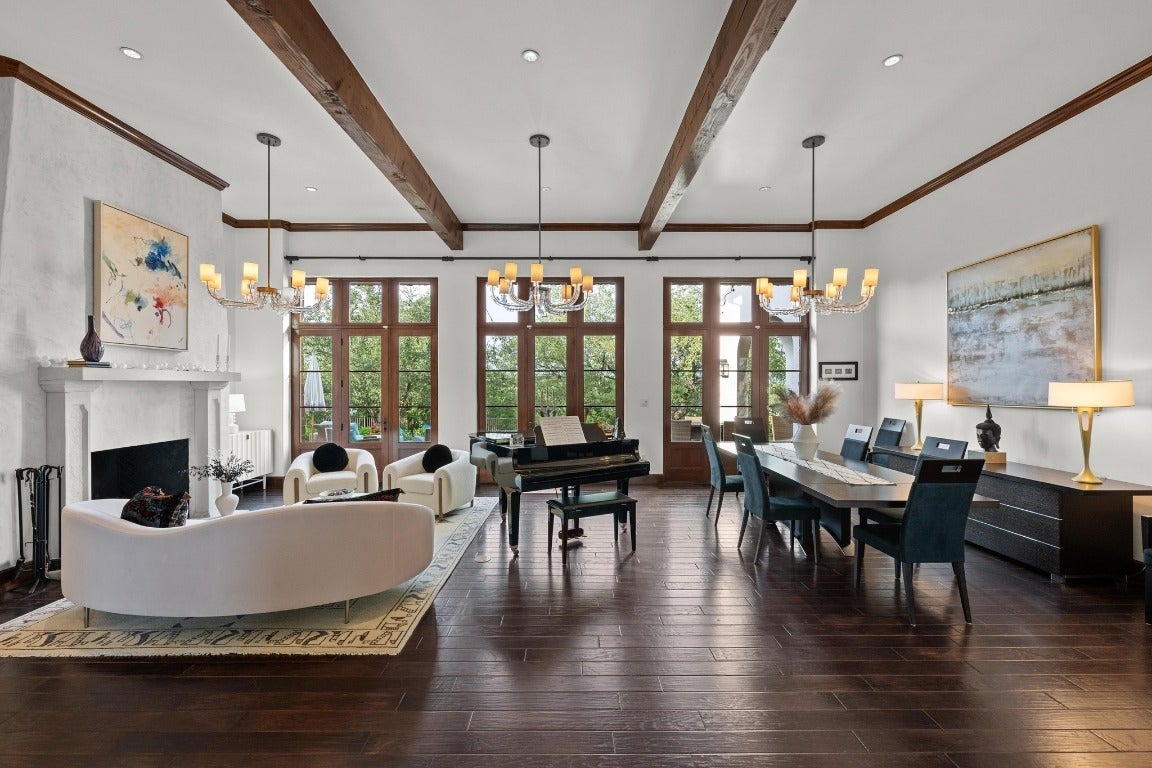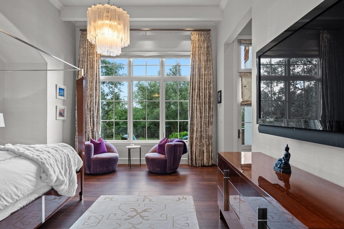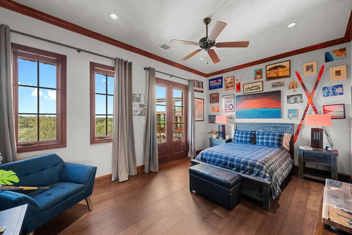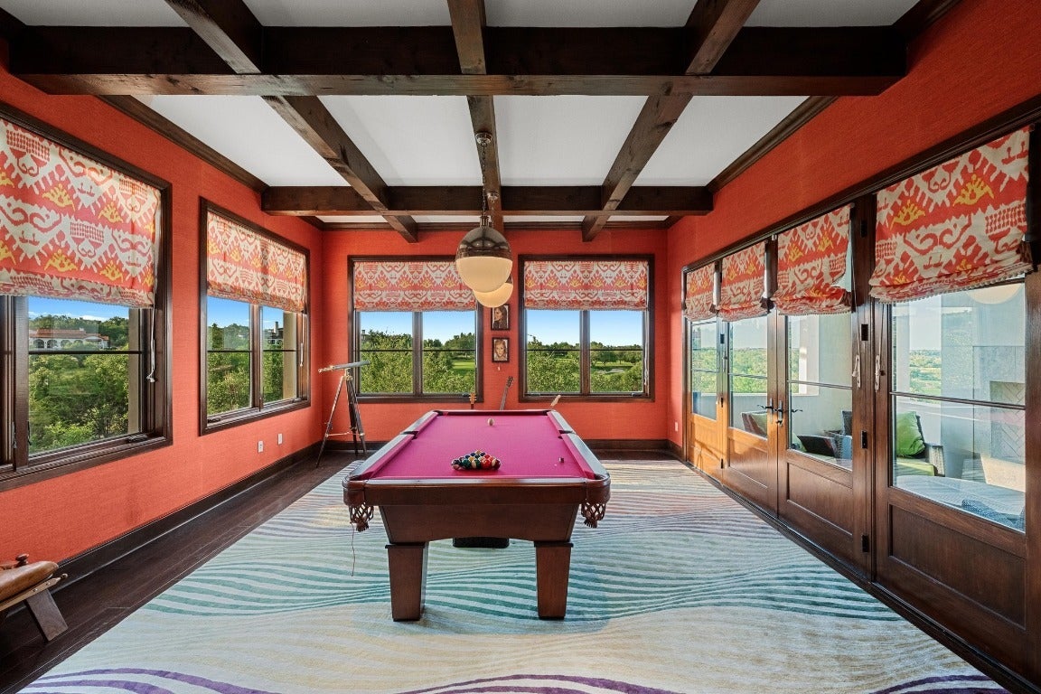 Perched gracefully on the 4th hole of the prestigious Spanish Oaks golf course, the Little Blue Stem Estate embodies luxury and sophistication. A charming courtyard entry, adorned with a blooming rose garden and meticulously curated landscaping, welcomes you. Towering floor-to-ceiling windows and seamlessly interconnected living spaces elevate the home’s grandeur and warmth. The first-floor primary suite is a haven, boasting separate vanities, an expansive custom-designed closet, a lavish soaking tub, a spacious walk-in shower, and huge windows offering captivating views of the infinity-edge pool and covered veranda. A gracious guest suite on the main level features a refined coffee bar and an exquisite en-suite bath with a sleek standing shower. The grand Ann Saks tiled kitchen, a culinary masterpiece, flows effortlessly into an elegant den with airy, vaulted ceilings and sweeping vistas of the enchanting Texas Hill Country. Steps away, an outdoor kitchen and covered dining area provide stunning views for miles, perfect for entertaining. The second level unveils three sumptuous bedrooms, each with en-suite baths, and an oversized game room with a billiard table, offering panoramic views and a private patio with a roaring fireplace for cozy evenings. Outdoor sanctuaries include a resplendent infinity-edge pool and fireplace on the veranda, ideal for lavish gatherings or serene retreats. The estate also features a sprawling 3-car garage, a meticulously appointed mud room, and a laundry suite. Moments from shopping, restaurants, Austin Tennis Academy, outdoor activities, and the esteemed Lake Travis School District, this palatial abode stands as a testament to timeless elegance and modern luxury.