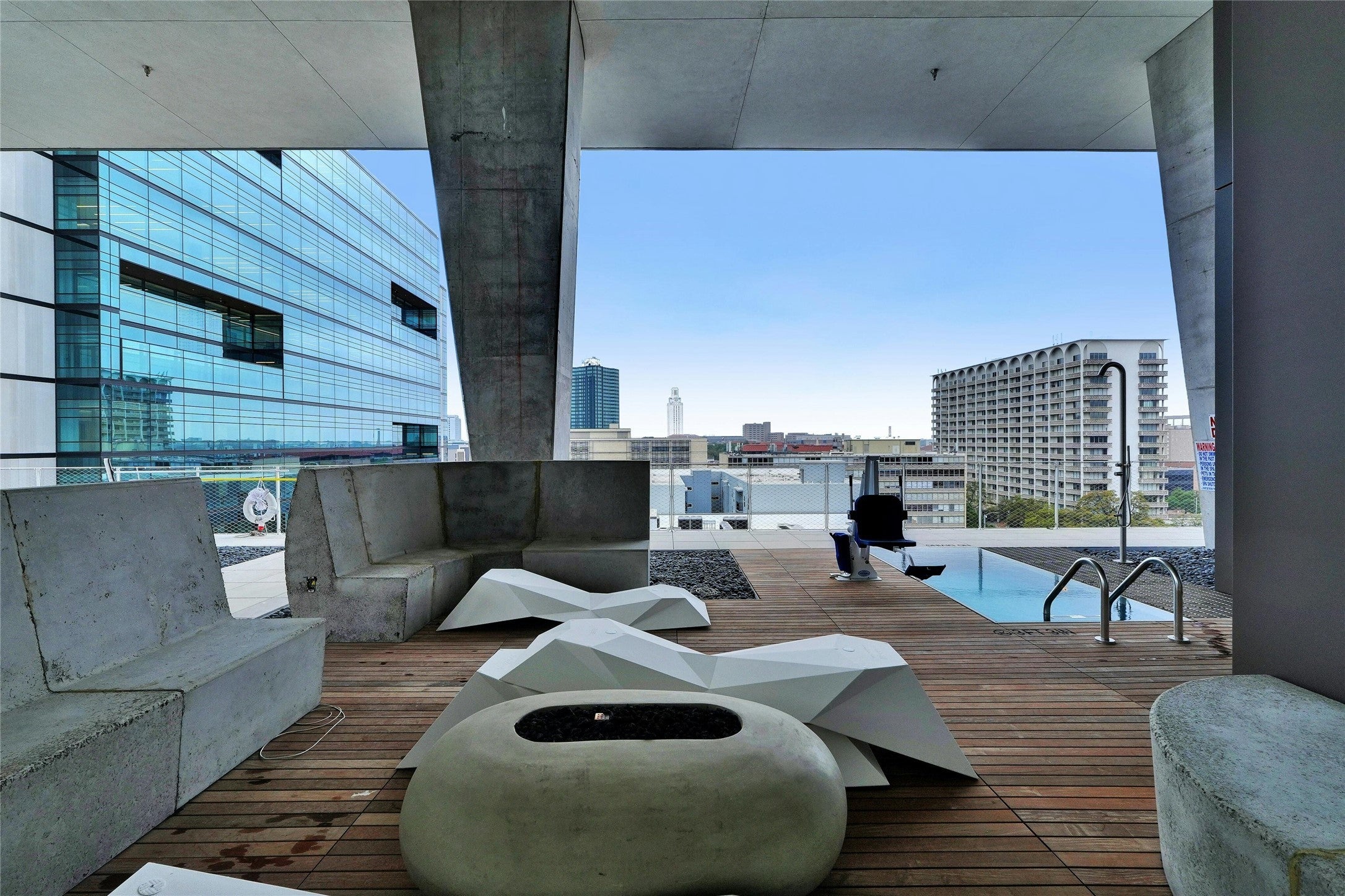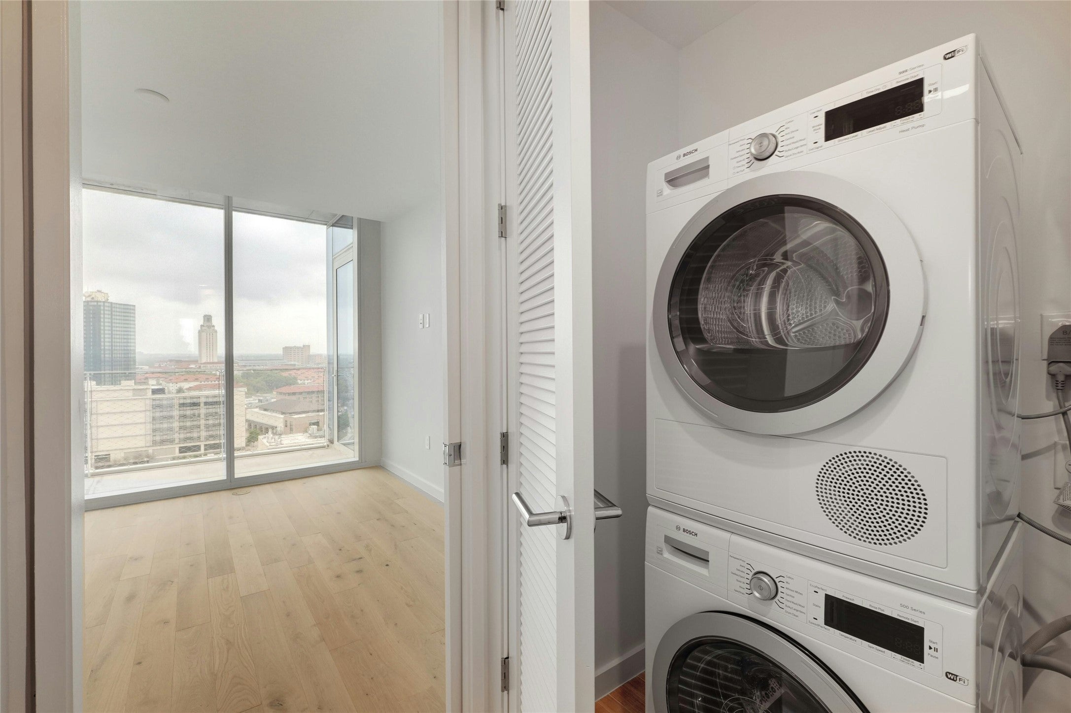 Condo comes with a storage unit of 72 sqft and one parking spot and is the largest 1 bedroom 1 bathroom plan at Linden. Investor permit convey with the sale! Fans and modern light fixtures installed with motorized shades throughout the condo. Experience upscale urban living in this beautifully designed 1-bedroom condo perched high above the city in a sleek, modern high-rise located in the historic heart of downtown Austin. Floor-to-ceiling windows flood the space with natural light and frame stunning, unobstructed views of the iconic UT Tower and surrounding skyline. Step into the open-concept kitchen with custom cabinetry, built-in refrigerator, island with built-in gas cooktop. The spacious bedroom features panoramic views through full-height glass walls, offering a serene and light-filled retreat. Enjoy your morning coffee or evening wine on the expansive private balcony, perfect for soaking in views of the Capitol, Texas Mall, and the buzz of downtown life. A separate coat closet, Bosch washer and dryer, and spa-inspired bathroom add everyday convenience. Unbeatable location—just steps away from the Texas State Capitol, Texas Mall, University of Texas, and the Medical District, this condo places you at the heart of Austin's cultural, educational, and professional hubs. Additional features include state of the art amenities, and 24 hr. concierge