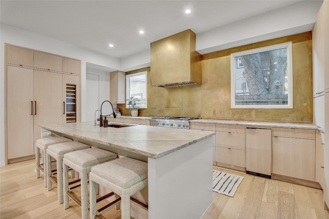 Welcome to your urban sanctuary in the heart of Austin’s coveted Zilker neighborhood. Built in 2021 by renowned South Austin builder McCabe Development, this thoughtfully designed 4-bedroom, 4-bathroom home spans over 2,800 square feet of eclectic charm. Step inside to discover bold wallpaper selections and curated accents that add personality and style throughout—creating spaces not just to live, but to thrive. Designed for entertaining, the open layout flows seamlessly from the kitchen to the dining and living areas. The kitchen comes equipped with a built-in refrigerator and wine fridge, complemented by matte gray quartz countertops, warm light wood cabinetry, and a stylish pop of the metallic gold finish that gives it an edgy yet sophisticated feel. Expansive multi-panel sliding doors open to a backyard framed by majestic magnolia trees, offering privacy and serenity. The backyard features a large covered patio, fully equipped outdoor kitchen, and pool with waterfall, creating a true entertainer’s oasis. The primary suite, located on the main level, features a spacious walk-in closet and a luxurious ensuite bathroom with a double vanity and massive steam shower. A private door leads directly from the primary bath to a secluded patio with a hot tub, offering the ultimate in relaxation. The location couldn’t be better—this home is walking distance to Zilker Elementary and just around the corner from the endless dining, shopping, and entertainment options of South Lamar, all nestled within a vibrant, family-friendly neighborhood. This is more than just a home—it’s a space built to inspire, where comfort meets creativity in the heart of Austin, TX.