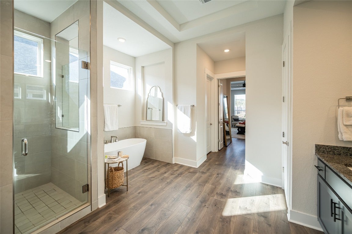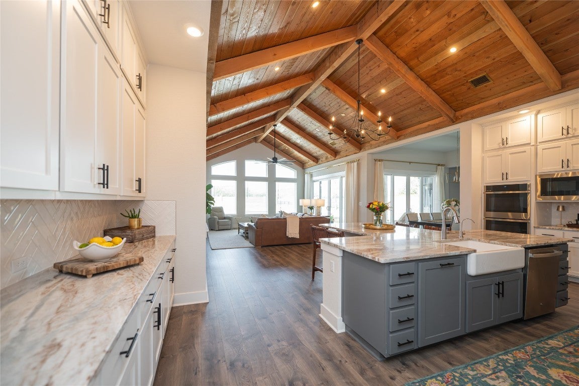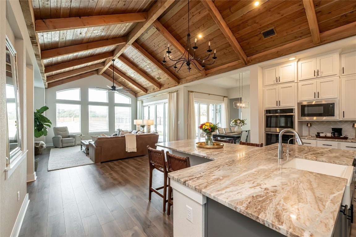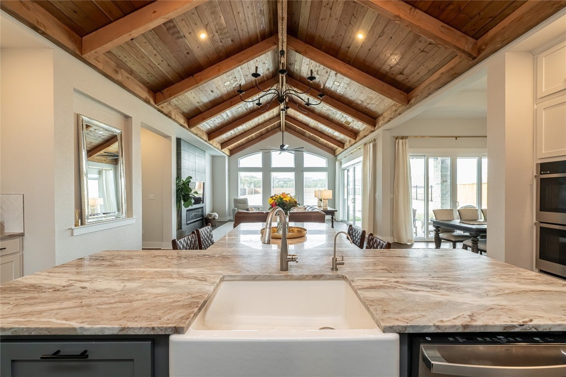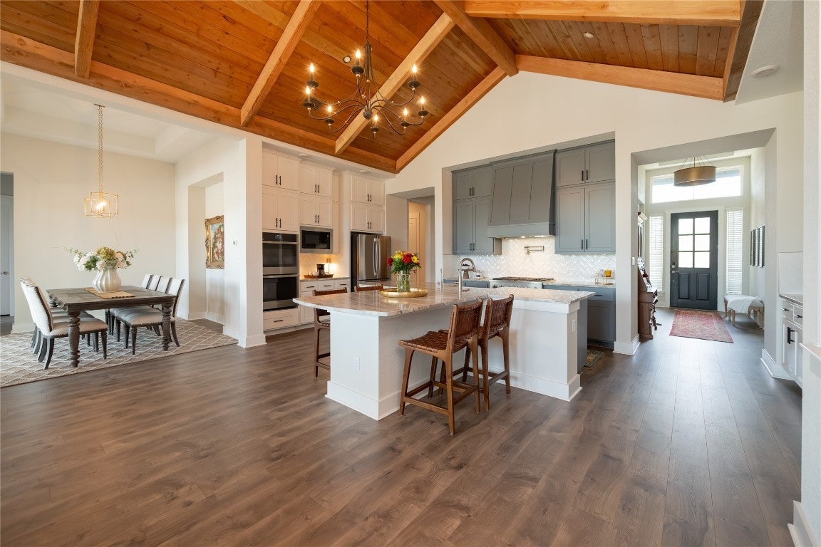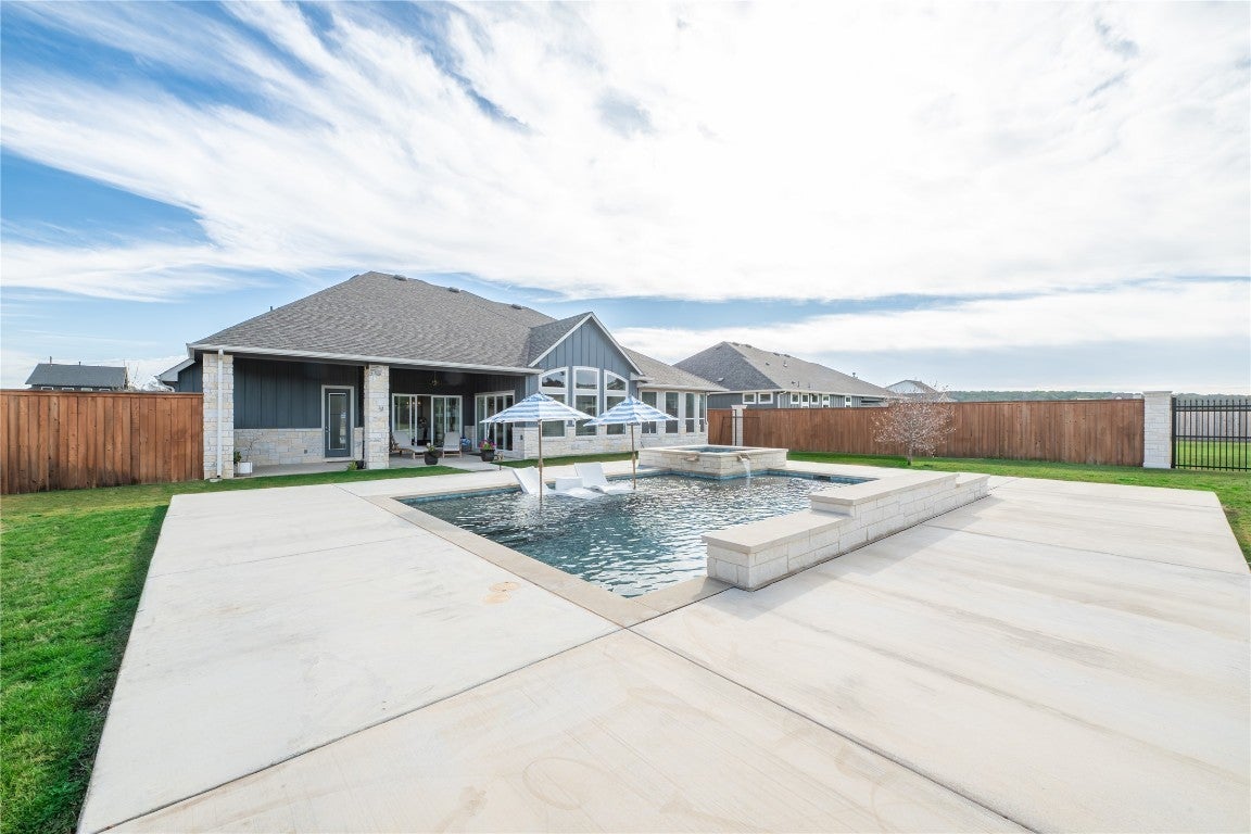 Welcome to an exquisite testament to architectural beauty and functional design. This stunning Chesmar home spans 3,285 square feet on a generous one-acre lot in the prestigious Northfork community. Upon entry, you are greeted by breathtaking double-vaulted, tongue-and-groove wood ceilings that grace the open-concept family room and gourmet kitchen. The chef’s kitchen is a culinary masterpiece, boasting ceiling-height cabinetry, a massive social island, a 6-burner cooktop, and a charming farmhouse sink. The living space flows seamlessly through sliding glass doors to your private backyard oasis, featuring a covered patio, an in-ground heated pool, and a spa. Additional highlights include a dedicated study, a 3-car garage with newly applied epoxy floors, and an existing slab ready to be finished into your dream sport court. Located within the top-tier Liberty Hill ISD, this residence perfectly blends modern innovation with Hill Country elegance to create your forever sanctuary.