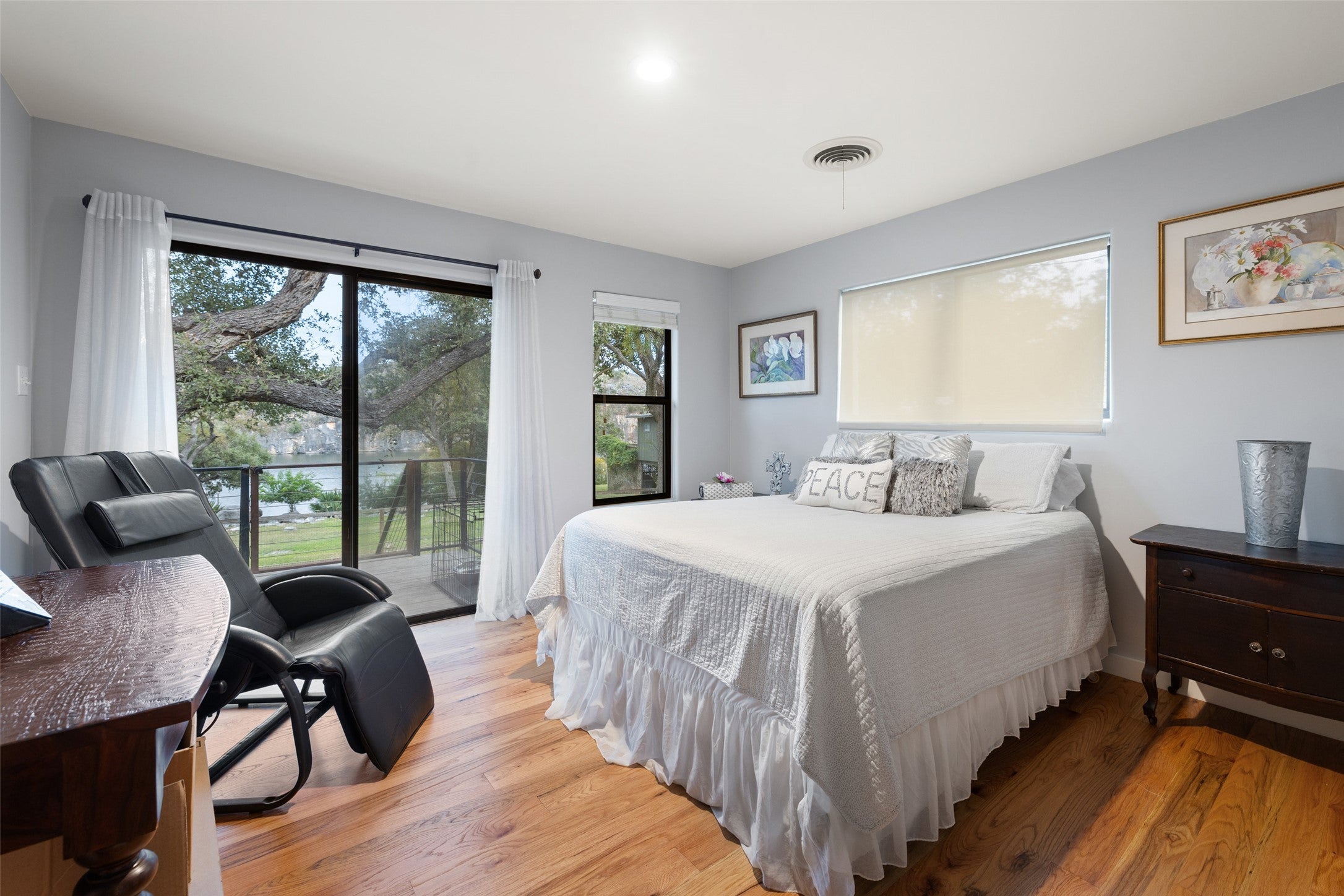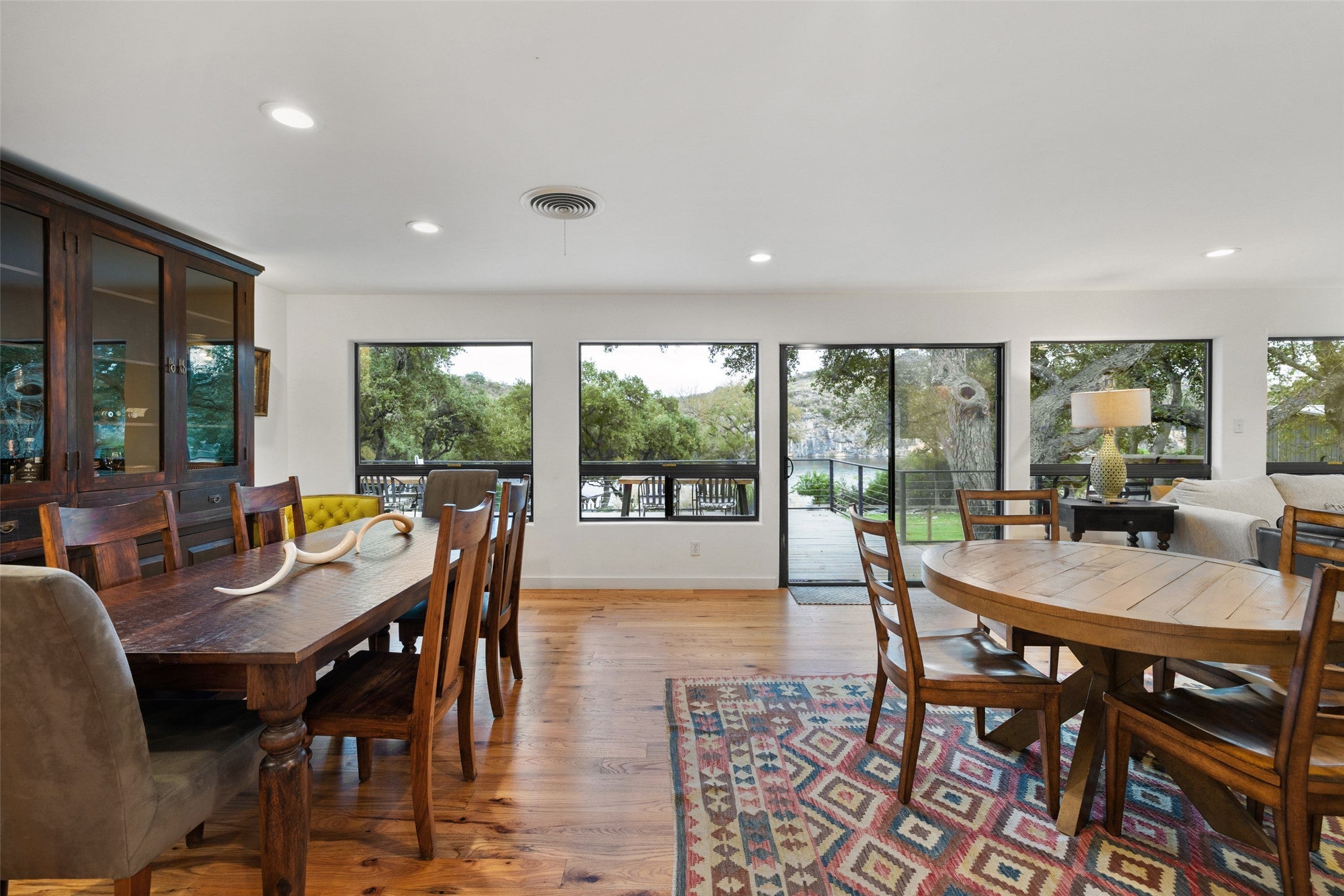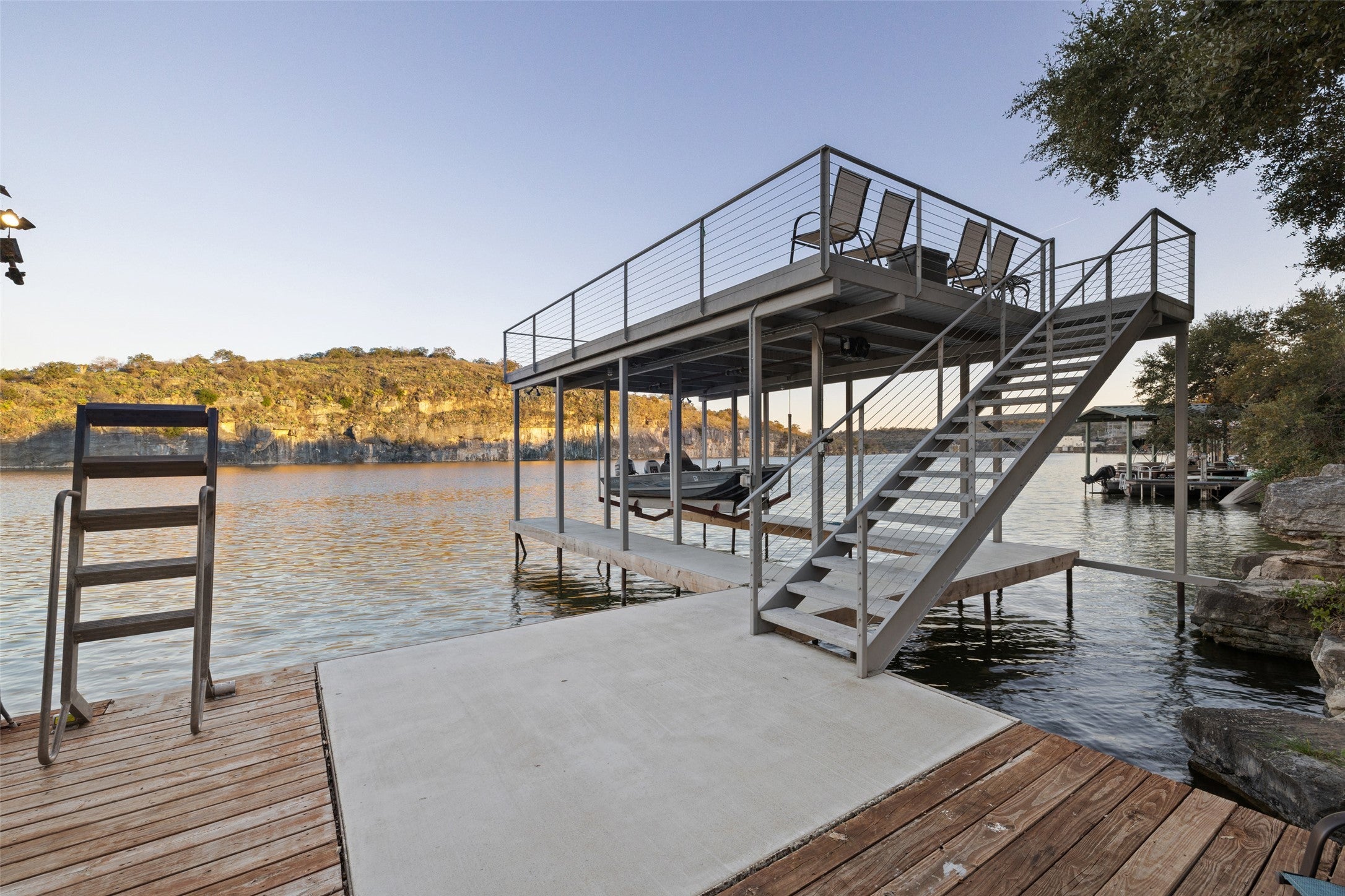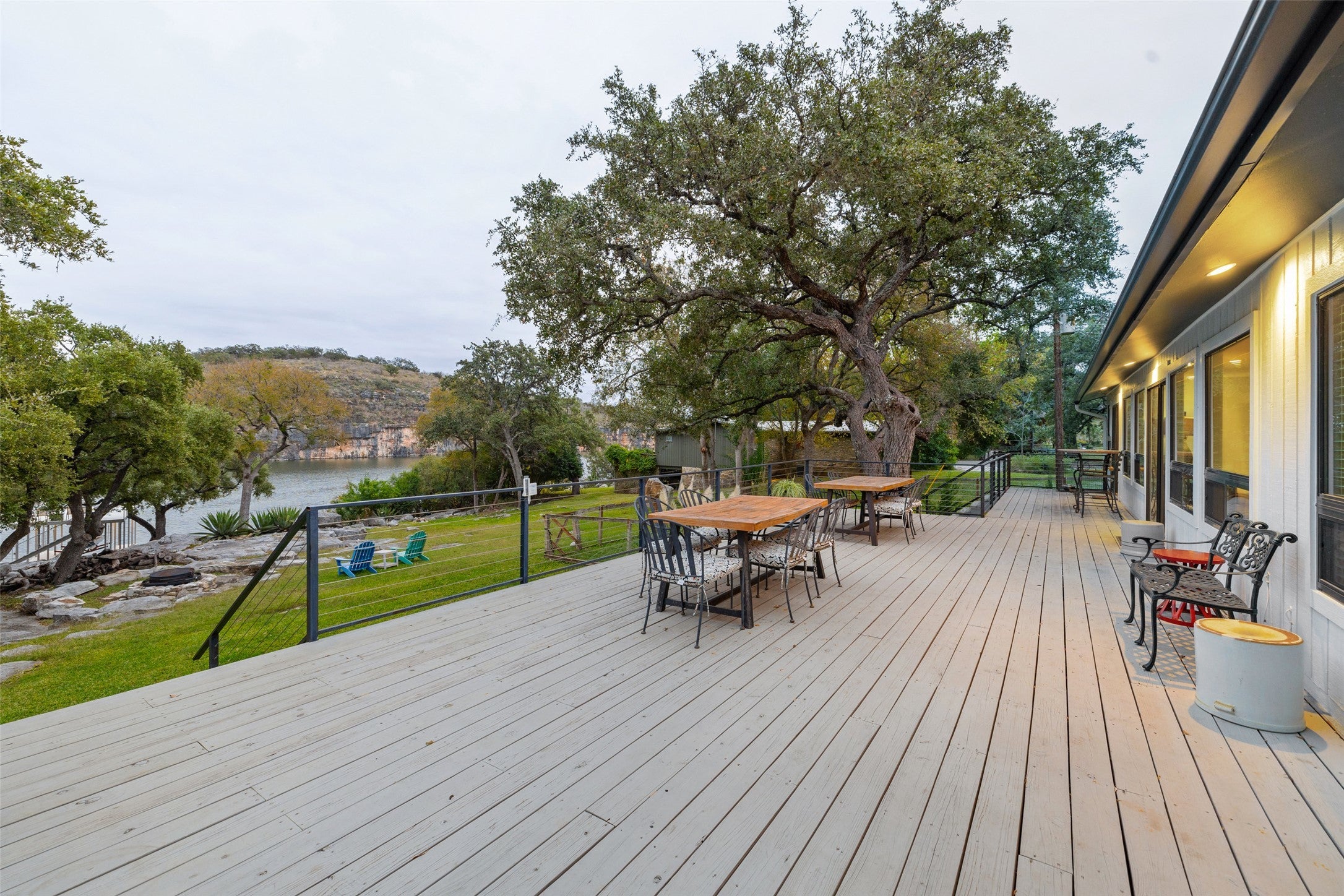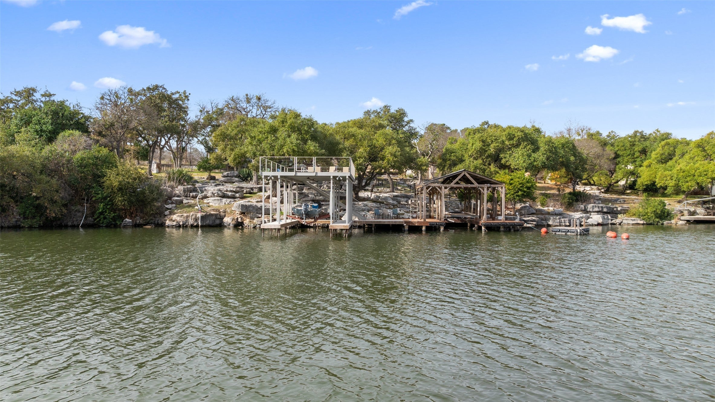 1204 Los Escondidos is a private lakeside retreat with over 125’ of waterfront on .76 acres located on the east end of Lake Marble Falls. The property offers an updated 3-bedroom, 2-bathroom lakeside home, with an attached 2-car garage, two private boat docks with upper deck, a fenced yard, outdoor firepit, and gentle guided access to the water. The views of the lake and bluffs, along with the gentle slope to the lake, offer one of the best living spaces on Lake Marble Falls. With 2 private docks and 2 boat lifts, you can enjoy easy access to boating, surfing, fishing, or simply relaxing by the water. Large windows frame panoramic views of the lake, bringing the beauty of nature into the home. The home includes a stone wood burning fireplace and open flow between the dining area, living room, and kitchen. The home's three bedrooms provide plenty of space, with the primary suite separate from the guestrooms, offering a peaceful place to end your day with views of the lake. The primary bathroom includes a walk-in shower, and the secondary bath has a shower tub. The newly refinished deck and grass yard, along with a stunning backdrop, are ideal for hosting to any event. The fenced yard creates a dog friendly space.
