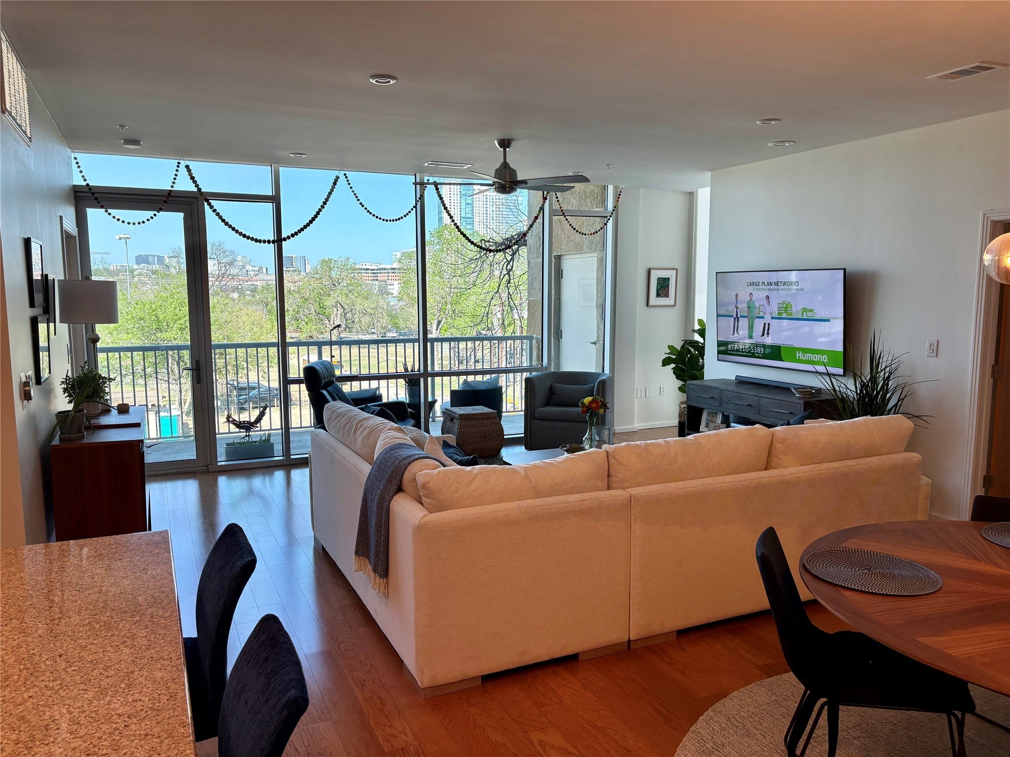Immaculate BartonPlace residence in private, end-cap location, showcasing impressive downtown skyline views. This well-designed floor plan offers over 1,700 SF of modern living, spacious bedrooms and three full baths - the only one of its kind! Stunning floor to ceiling windows allow for generous natural light. Beautiful pecan wood flooring stretches throughout - no carpet! Guest bedrooms offer privacy overlooking the Zen interior courtyard. Spacious private terrace offers outdoor living, downtown views and bonus storage closet. Premium full-size parking spaces across from the elevator.