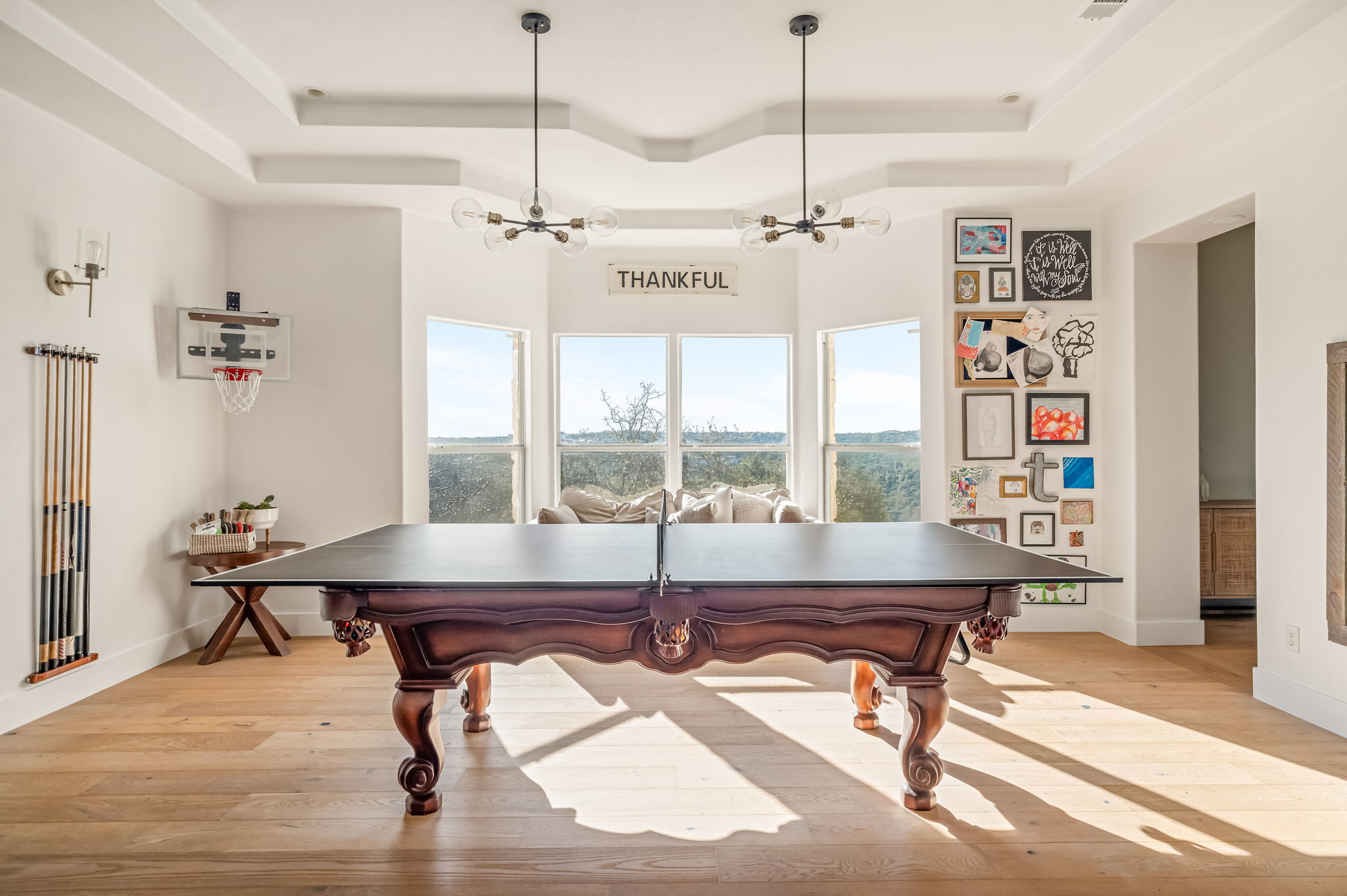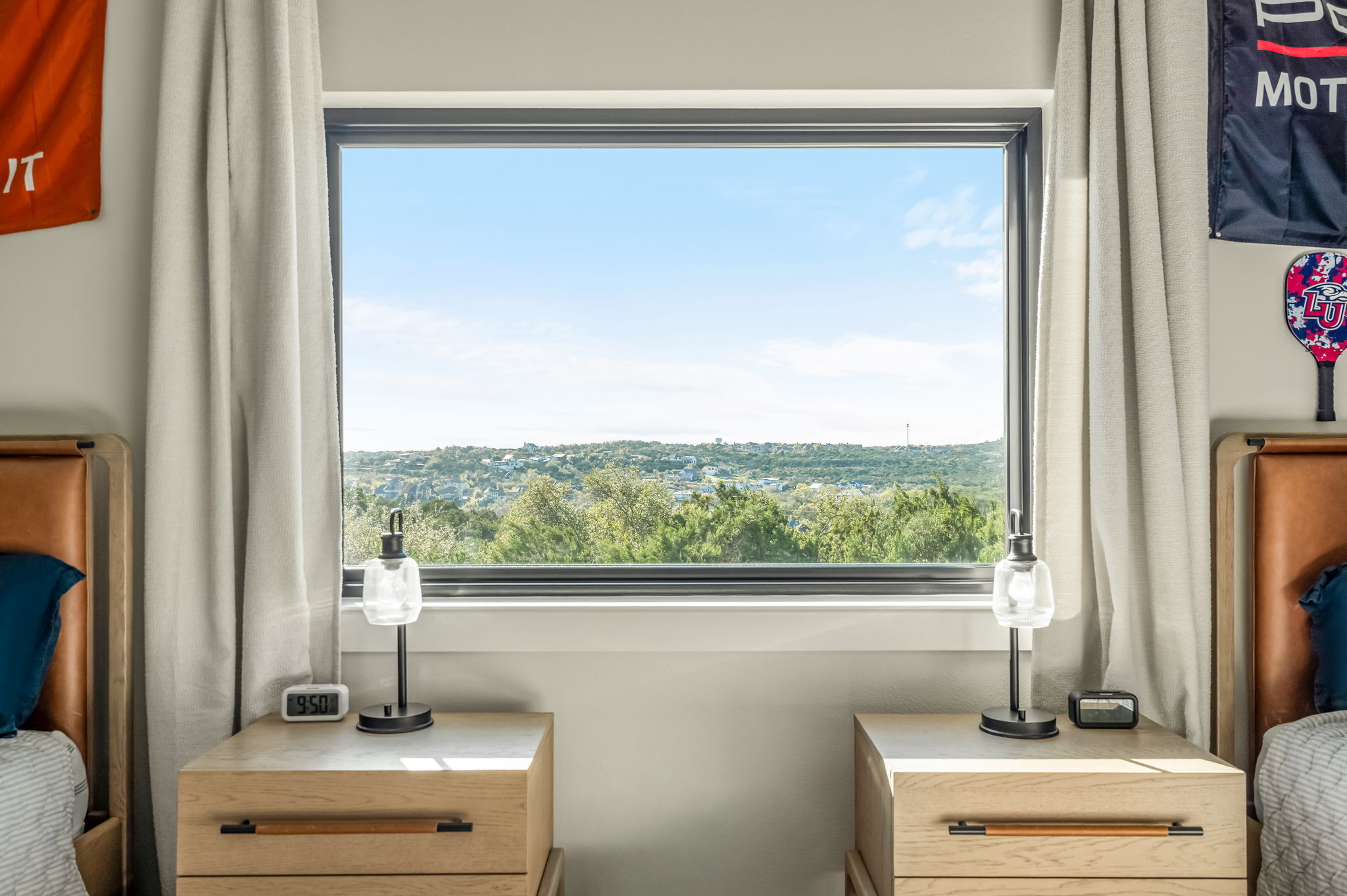 Nestled behind a gated entrance, this 1.69-acre property is surrounded by towering oak trees and offers sweeping Hill Country views. The 3,312-square-foot residence features 5 bedrooms, 3 bathrooms, and open-concept living, thoughtfully updated in 2019, with a 2023 addition enhancing the layout. The guest house is roughly an additional 400sqft. Highlights include a striking white oak kitchen island, quartzite countertops, high-end appliances, wood floors throughout, updated bathrooms with marble countertops, modern light fixtures, a sleek front door, HVAC unit, and a permitted septic system (2023). The 2023 addition adds two generously sized bedrooms with vaulted ceilings, walk-in closets, and a Jack-and-Jill bathroom. The home also features numerous built-in cabinets for additional storage. The private backyard is a true showstopper, with a covered patio overlooking the pool and sports court, offering spectacular views and an inviting space for relaxation or entertaining. A fully equipped guest house with electricity and plumbing, perfect for extended-stay guests. Located in the highly acclaimed Lake Travis ISD, the campuses offer strong academics, enrichment programs, and extracurricular opportunities. Conveniently just a 10-minute drive from Hill Country Galleria, Whole Foods, and dining. Opportunities are rare in this neighborhood. Schedule your tour today!