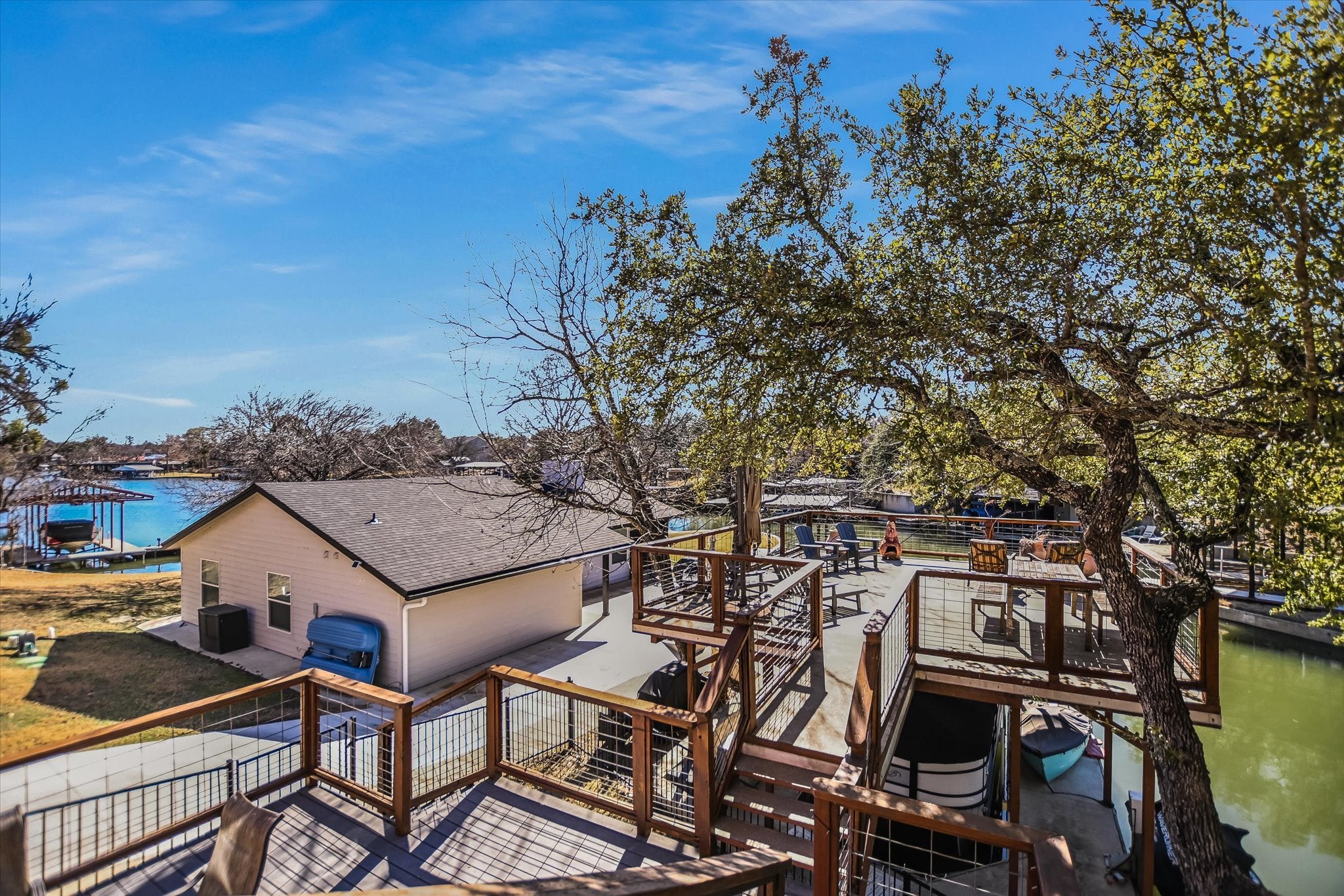 BERMUDA BUNGALOW IN SUNRISE BEACH! Tucked beneath a beautiful canopy of mature trees, this well-maintained waterfront home offers a peaceful setting and inviting lakefront lifestyle. This friendly lake community welcomes you immediately and feels like home--the cheerful/comfortable light filled home has very generous sized rooms and is the perfect lake house get away for family and friends to make lasting memories. A reminder--no short term rentals allowed. The home is tastefully furnished both inside and out and features numerous upgrades throughout, including genuine hardwood floors, leathered marble countertops in the kitchen and bathrooms, designer tile selections, and updated fixtures. Additional improvements include a water softener, tankless propane water heater, fresh interior and exterior paint, and attractive landscaping. The fenced backyard provides added privacy, while two spacious decks—one located above the boathouse—create wonderful spaces to relax, entertain, and take in the lake views. With 3 bedrooms and 2.5 baths, this comfortable lake home is ready for you to move in and start enjoying pulling out of your own personal boat slip onto Lake LBJ. TRULY A MUST SEE!