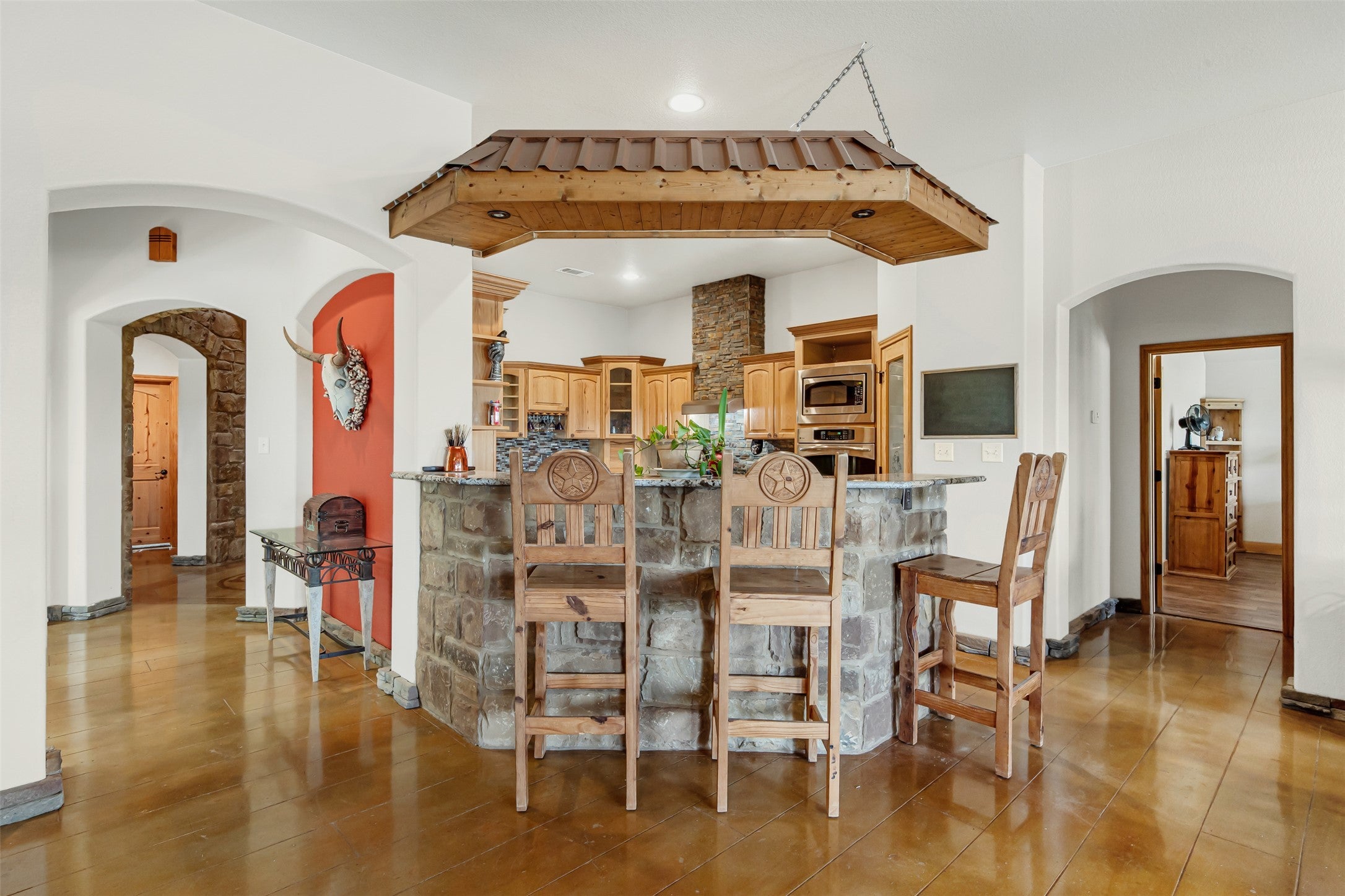 On more than 24 acres of wide-open Texas land, this estate is where luxury and peace come together. The views stretch for miles, and the only sounds you’ll hear are the ones you choose—laughter by the pool, the crackle of the firepit, or the soft trickle of the backyard water feature. Life here moves at your pace, surrounded by space and privacy that most only dream of. The enormous covered patio is built for living outdoors, with a stone fireplace and a kitchen ready for summer cookouts, quiet mornings with coffee, or evenings entertaining friends as the sun sets over your land. Step inside, and the sense of custom craftsmanship continues, from striking stone walls to fine details like the baseboards that ground every room in style. The kitchen is the kind of place that makes cooking a joy, with granite counters, stainless steel appliances, a built-in wine fridge, and more than enough space for gathering around the island or breakfast bar. Even dinner feels like an event in the dining room, where a built-in aquarium adds life and beauty to the setting. When it’s time to unwind, the theater room offers movie nights that rival the big screen, while the spacious owner’s suite promises rest and relaxation with a spa-like bath that features a corner jetted tub and dual shower heads in the separate walk-in shower. This property isn’t about checking boxes—it’s about creating a life. One filled with quiet mornings, unforgettable evenings, and a home designed to celebrate every moment in between.