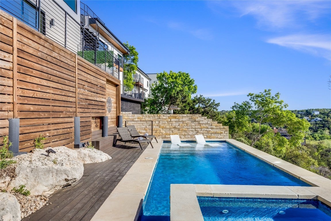 Nestled in the serene enclave of Apache Shores, Firefly Canyon is a breathtaking modern retreat offering panoramic views and a coveted setting backing onto Apache Shores Lake, a tranquil, creek-fed oasis. This stunning home boasts five spacious bedrooms and four luxurious bathrooms, designed with an open-concept layout that seamlessly blends style and functionality. The chef’s kitchen features high-end stainless steel appliances, expansive quartz countertops, a waterfall island, and sleek European-inspired cabinetry. The generous dining area is framed by elegant sliding glass doors, opening onto a sprawling outdoor patio that invites effortless indoor-outdoor living. Designed for both relaxation and entertaining, this home offers a private rooftop deck, a cozy fire pit, and a heatable pool and spa—all set against the backdrop of breathtaking lake views. The primary suite is a true retreat, featuring a private balcony and a spa-inspired bathroom. Perfectly situated just 10 minutes from Lakeway and 20 minutes from downtown Austin, Firefly Canyon balances privacy with convenience. Its prime location and luxurious amenities make it an outstanding investment opportunity, offering top-tier rental potential year-round in Austin’s thriving vacation market. With easy access to Lady Bird Lake, Lake Travis, top-ranked schools, medical facilities, scenic hiking trails, and premier shopping and dining, this exceptional property delivers an unparalleled lifestyle in one of Austin’s most sought-after communities.