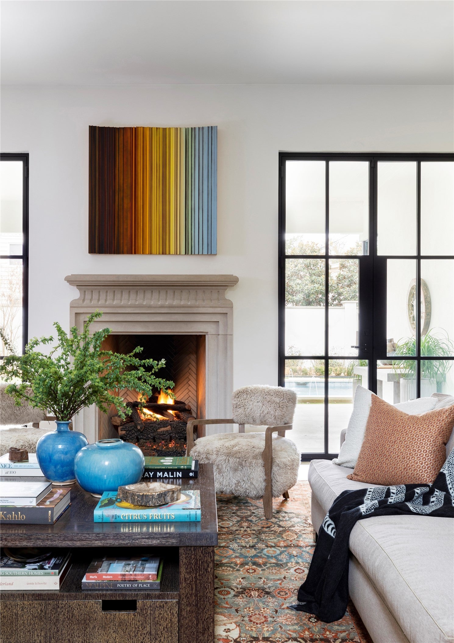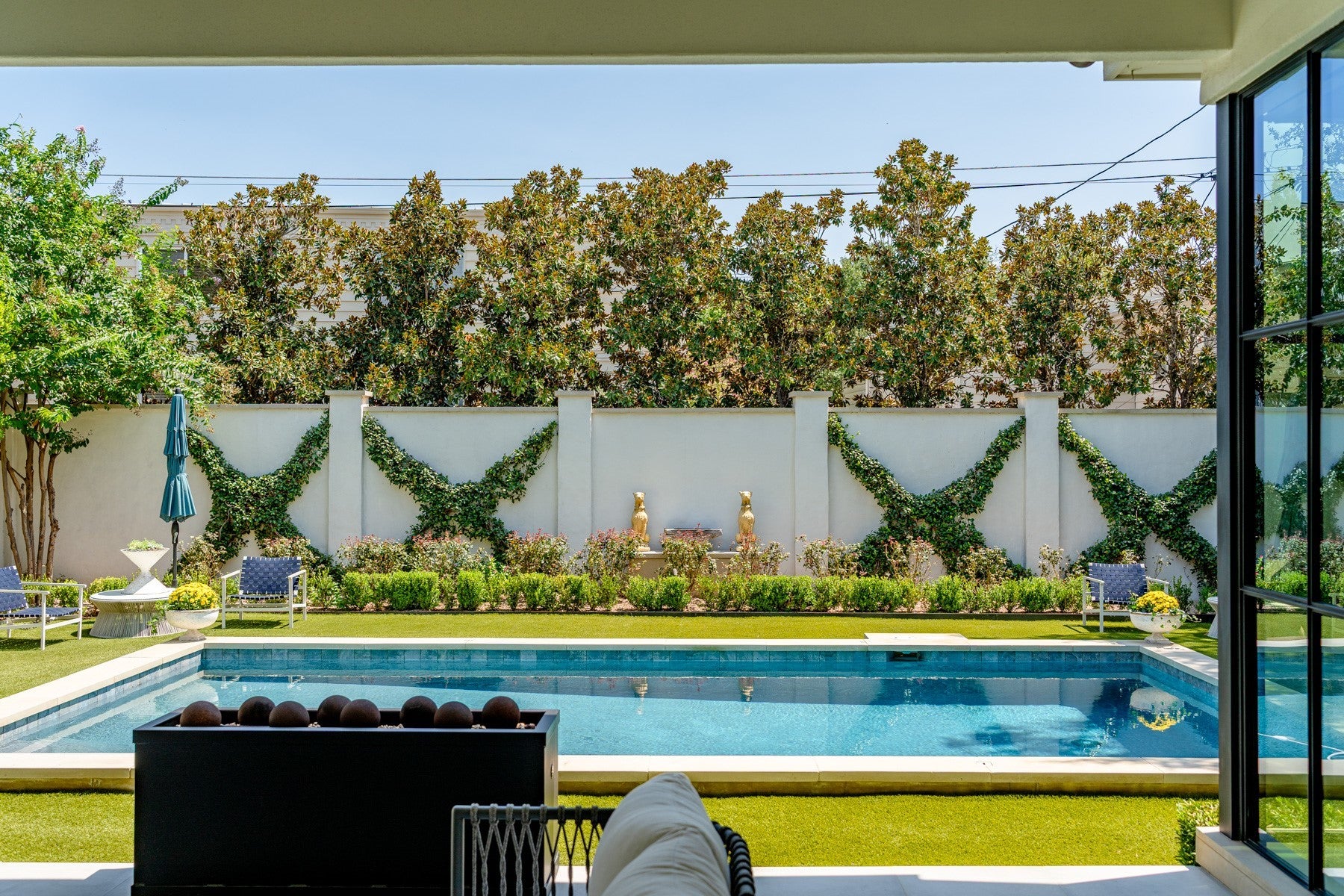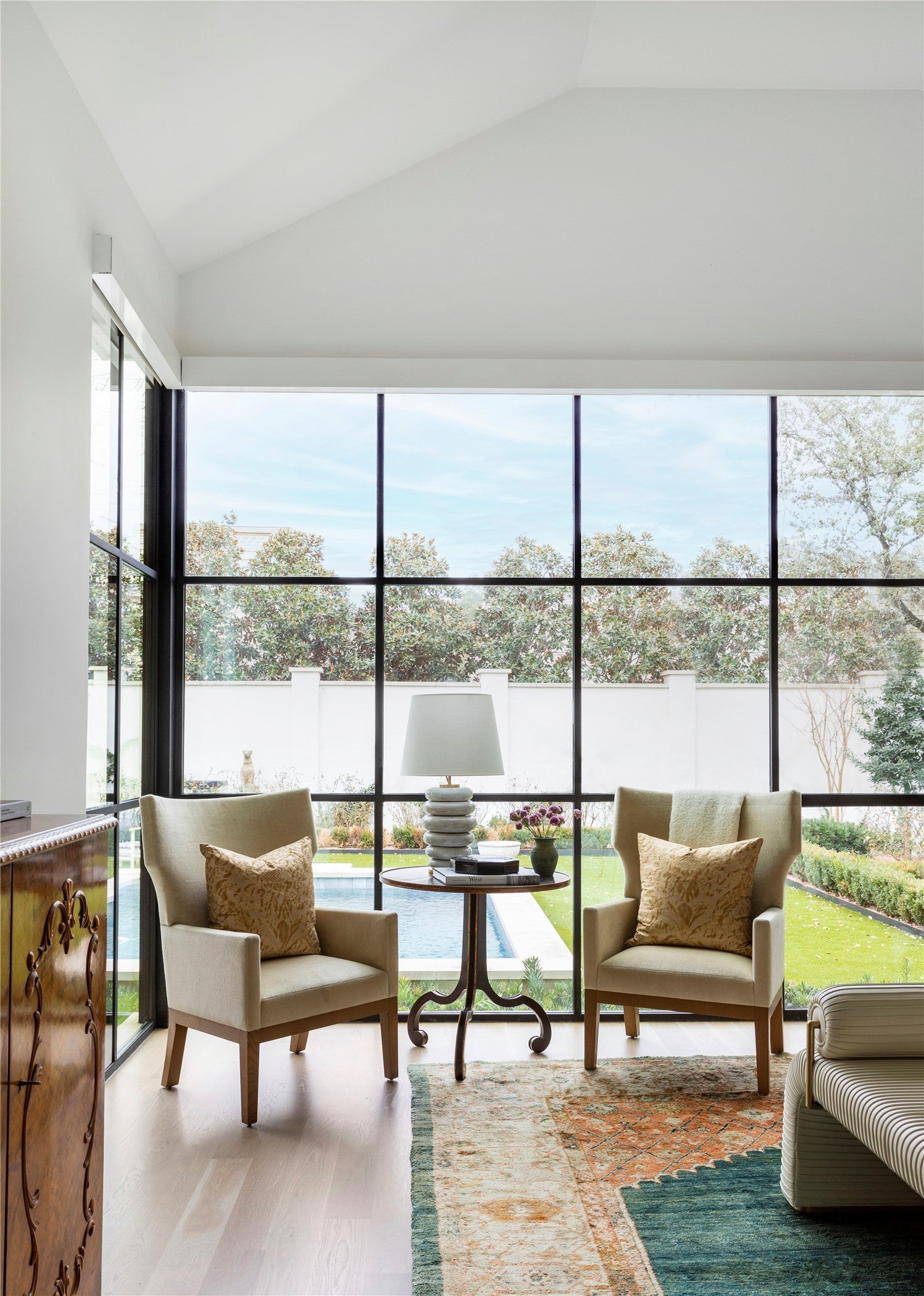 Elegance abounds in this stately four-bedroom, four-and-a-half-bathroom residence featuring curated interiors, four living areas, multiple striking fireplaces and a manicured poolside outdoor space in Austin’s sought-after Tarrytown neighborhood. Situated on a cul-de-sac street, this beautifully appointed home delivers an exquisite backdrop for elevated living and entertaining with high ceilings, bespoke millwork and intentional finishes throughout. Tall entry doors open to a grand foyer flanked by a staircase. The sophisticated formal dining room invites you to plan your next dinner party alongside a distinct Lueders stone fireplace. Enjoy a more intimate setting in the library with floor-to-ceiling wood paneling and handsome bookcases flanking another refined fireplace. Designed for effortless living, the main gathering area seamlessly flows to the adjacent kitchen and breakfast spaces that can also be closed off by concealed pocket doors. The primary bedroom suite is situated on the main level overlooking the pool through an expansive corner steel window unit. Above, three equally well-appointed secondary suites surround their own gathering room with treetop views. A hidden bookcase door leads you to an additional living area that is ideal as a wellness room, bunkroom or office. Outside enjoy al fresco gatherings in the pristine, secluded yard featuring a swimming pool, tall privacy walls, and established greenery. The covered patio is the perfect destination for all-season outdoor entertaining. A large motor court in front and a two-car garage accessible from the rear alley add abundant off-street parking to this stunning Austin sanctuary.