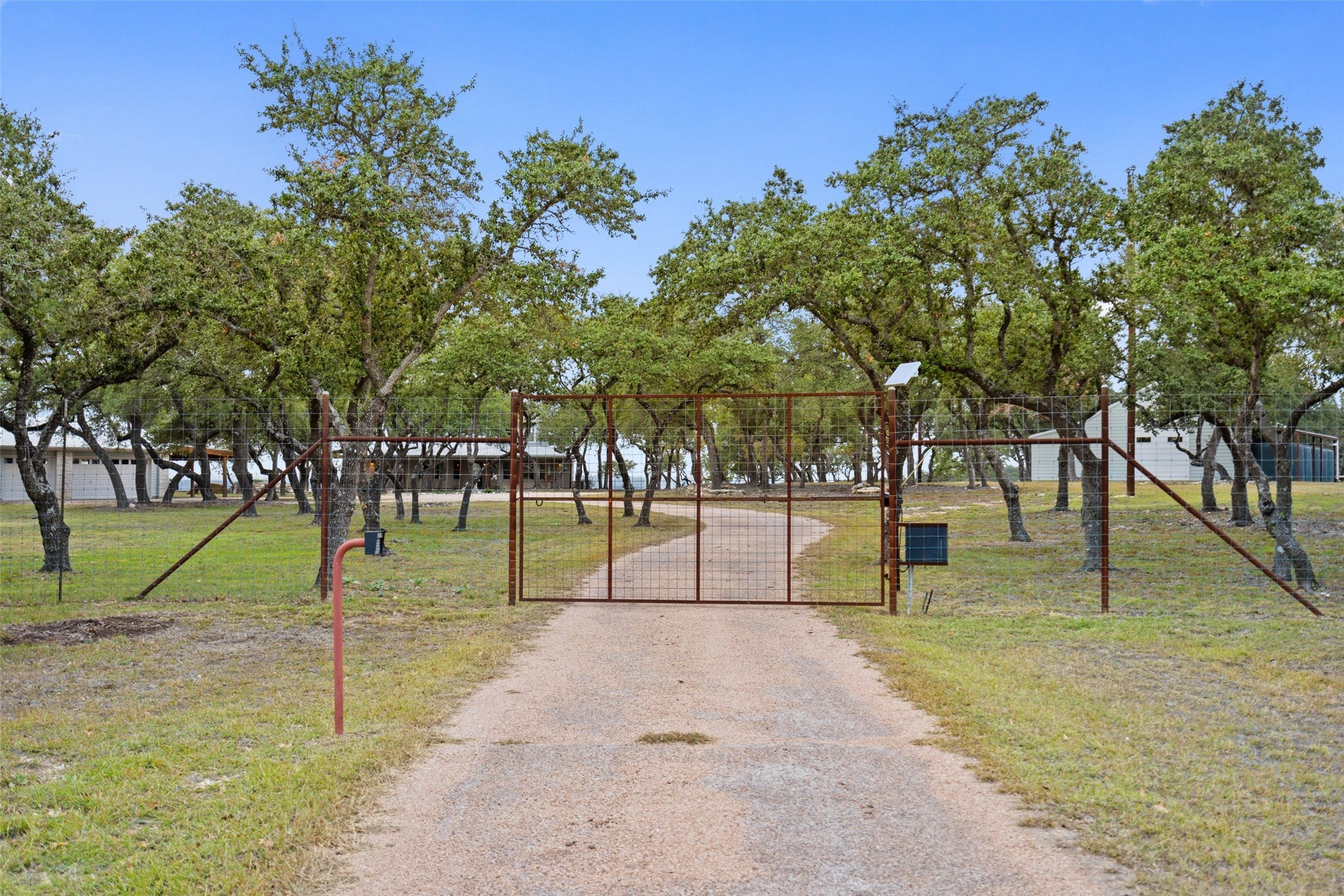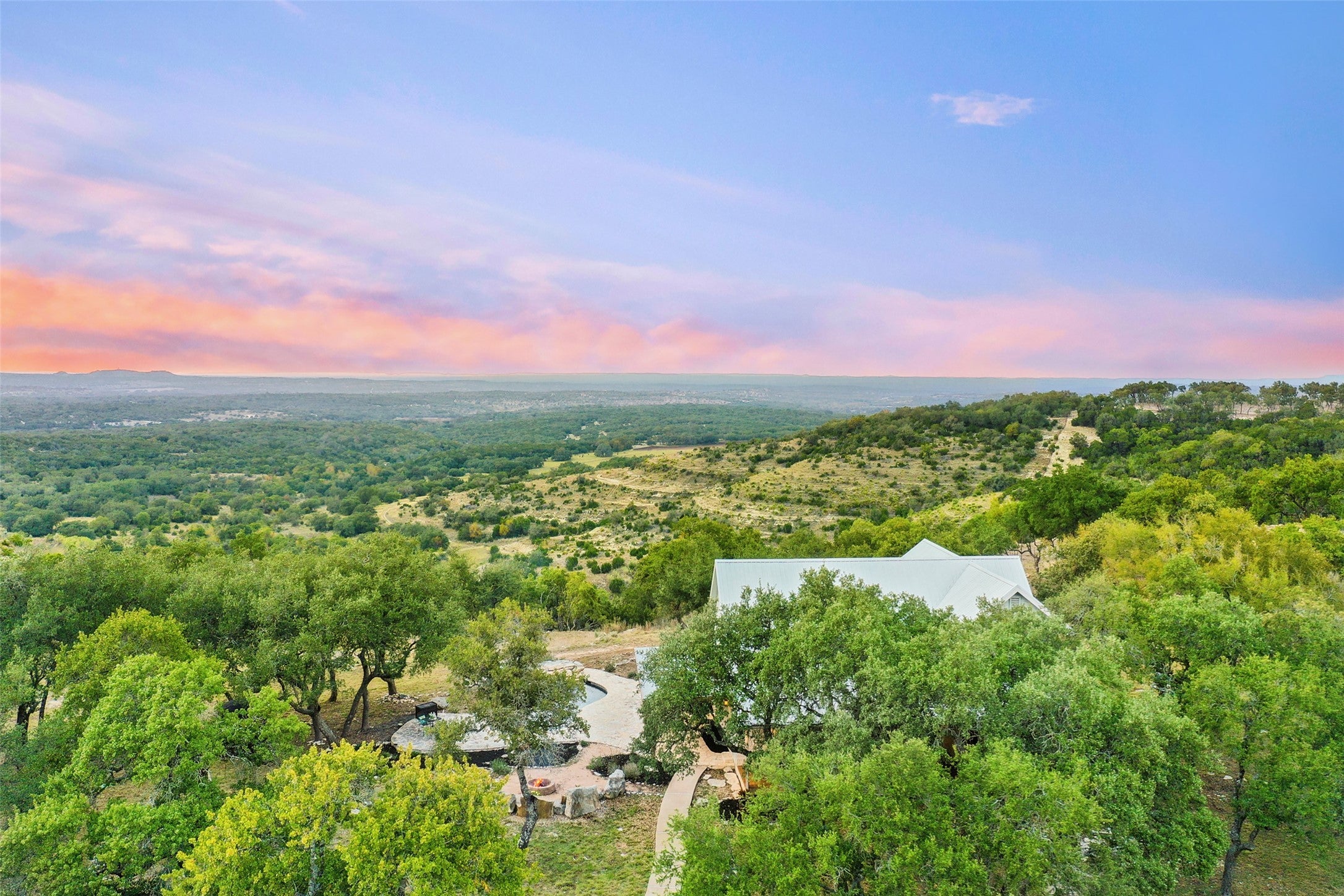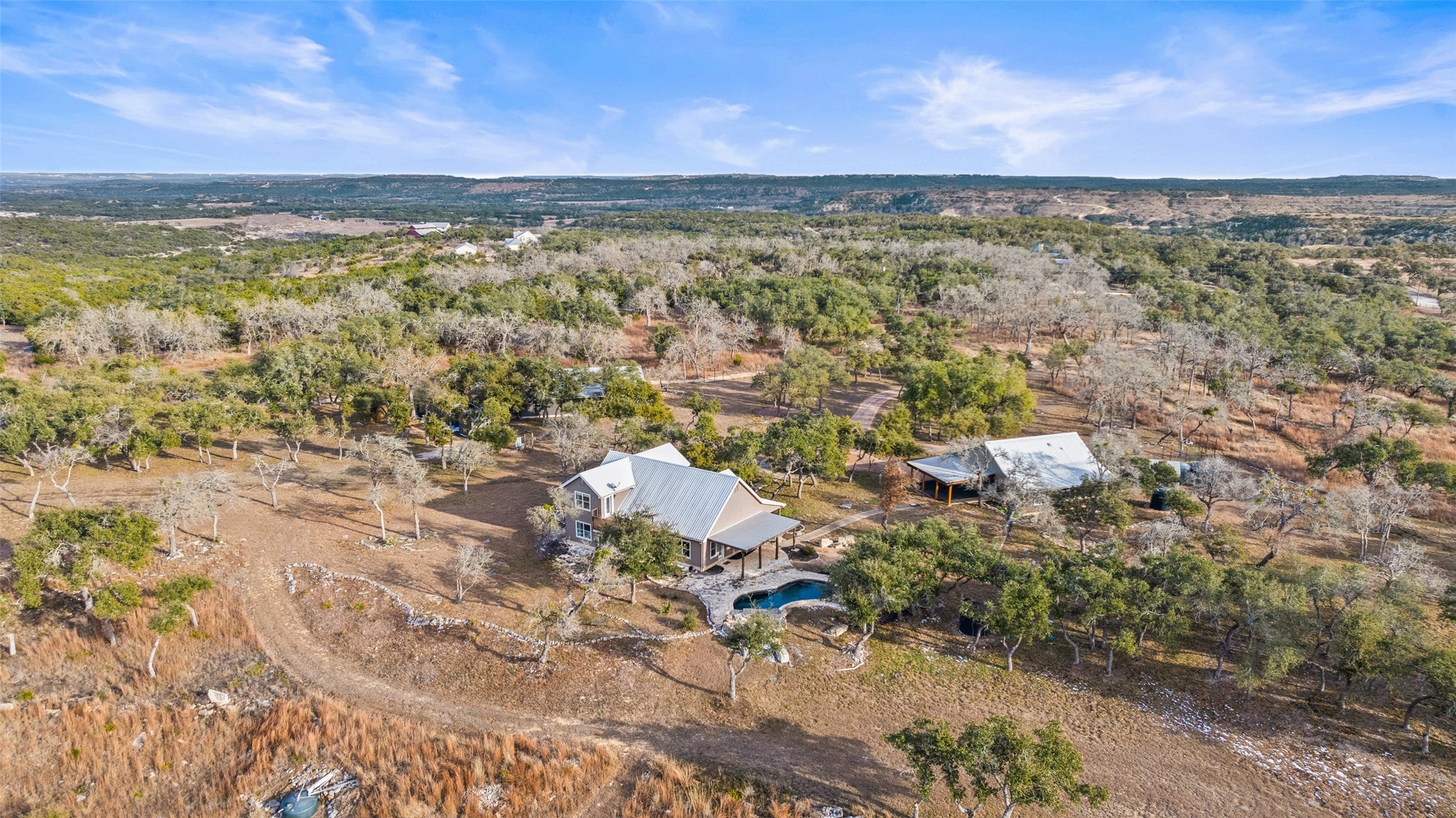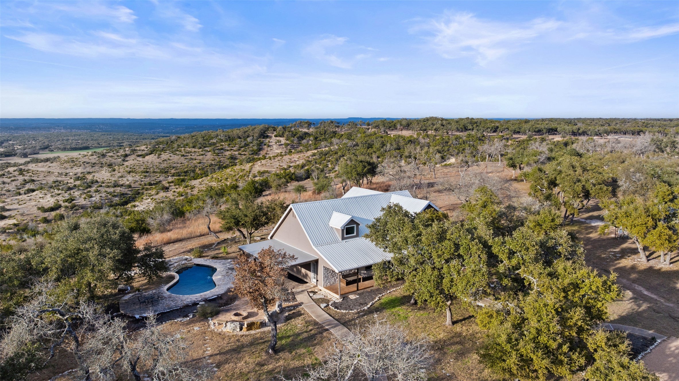 Transcendent Hill Country Views from this exceptionally private and gated 25+ acre Dripping Springs Estate in Blanco County. Comprised of an inviting 2600+ SF main home that captures the remarkable long-range vistas and rocked poolscape along with a fully appointed 520+/- guest apartment attached to the three-car garage and 1800+/- SF insulated metal building complete with heated and cooled office space. This ranchette lives much larger than its 25 acre footprint in light of the elevated and relatively flat topography but remains easy to maintain. Rainwater harvesting system in place along with a well. Studded with grand post oak trees throughout and a serene habitat for whitetail and songbirds, the land is equally as stunning as the view. A high fenced garden sits behind the guest apartment and is ready to be planted. Efficiently located near Austin and San Antonio, just 15 minutes to local shops and restaurants. Rainwater catchment and well currently in place, outside of city limits, and lightly restricted. Pets negotiable.