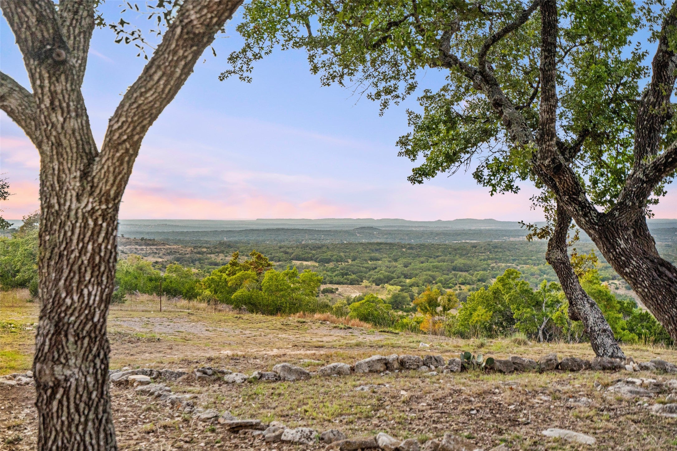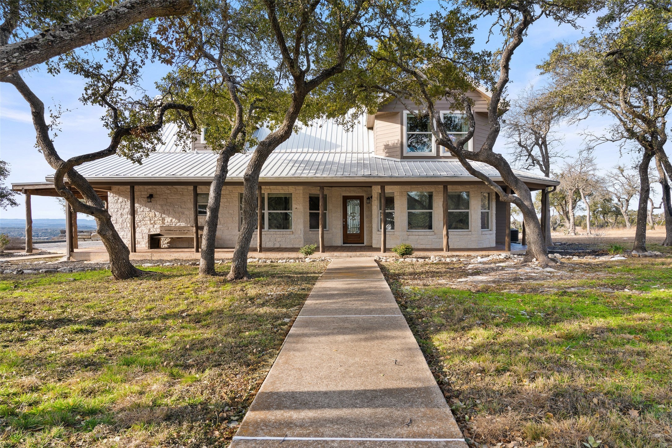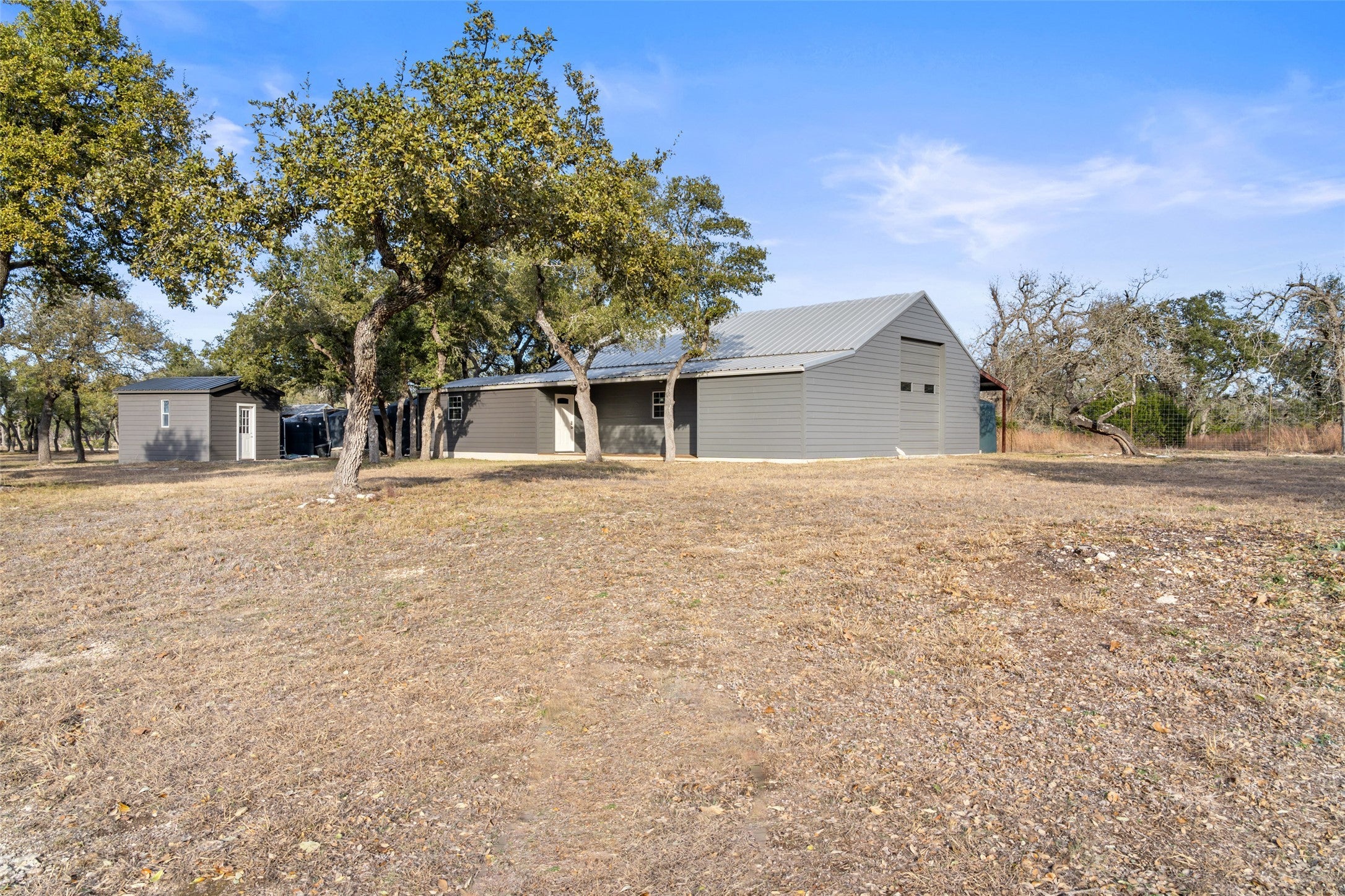 Transcendent Hill Country Views from this exceptionally private and gated 25+ acre Dripping Springs Estate in Blanco County. Comprised of an inviting 2600+ SF main home that captures the remarkable long-range vistas and rocked poolscape along with a fully appointed 520+/- guest apartment attached to the three-car garage and 1800+/- SF insulated metal building complete with heated and cooled office space. This ranchette lives much larger than its 25 acre footprint in light of the elevated and relatively flat topography but remains easy to maintain. Rainwater harvesting system in place along with a well. Studded with grand post oak trees throughout and a serene habitat for whitetail and songbirds, the land is equally as stunning as the view. A high fenced garden sits behind the guest apartment and is ready to be planted. Efficiently located near Austin and San Antonio, just 15 minutes to local shops and restaurants. Rainwater catchment and well currently in place, outside of city limits, and lightly restricted. Pets negotiable.