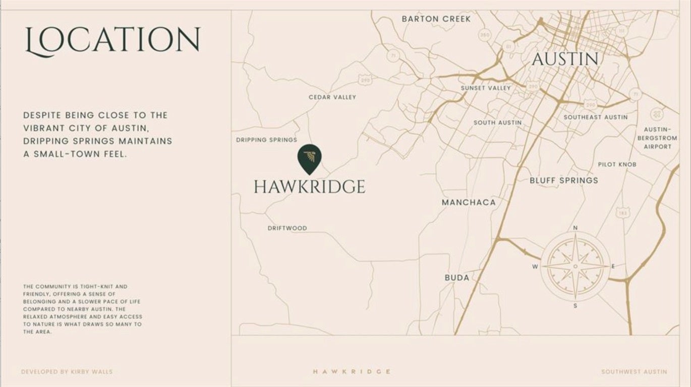 Tucked inside the Hill Country at the edge of Austin, Hawkridge offers a rare blend of refined living and natural beauty. This gated community brings space, privacy, and a connection to nature without sacrificing convenience. From here, you’re just a short drive to Austin’s top restaurants, music, and culture—or head the other way to explore wineries, trails, and the wide-open beauty of the hills. Each lot provides room to design a one-of-a-kind home surrounded by mature trees and scenic views. With a low tax rate and thoughtful planning throughout, Hawkridge is where peaceful living meets everyday possibility.