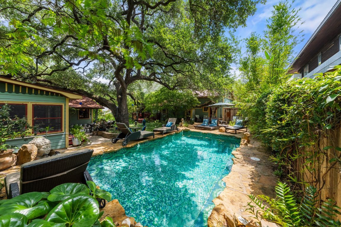 Discover a rare opportunity in the heart of Travis Heights just blocks from South Congress. 221 Park Lane is a long-loved eco-retreat on a large corner lot with a main home and three guest cottages totaling 2870 sq ft (6 bedrooms/5 full bathrooms), offering flexibility as a peaceful oasis, a family compound, and a B&B income-producing property, all steps from Austin’s best shopping, dining, and music. Built with intentionality and maintained with care for more than 30 years, the entire property feels calm, restorative, and connected to nature. The gorgeous main house was built in 1949 and rebuilt in 2009. It features an extended covered front porch perfect for relaxing afternoons, Mesquite cabinetry, Southern Pine floors, Camp Swift materials, a reclaimed Texas Capitol window, vaulted ceilings, a stone fireplace, and a well-appointed kitchen that flows easily into multiple gathering spaces ideal for everyday living and entertaining. Three cottages, an exceptional offering in Travis Heights, add unmatched versatility. The Garden Cottage offers a private bedroom and newer kitchen. The Carriage House, attached to the Garden Cottage and refreshed in 2022, includes a loft and charming living area. The Vicky House is a cozy reclaimed-materials studio that guests adore. Outdoor living shines with a pool surrounded by 300+ year-old Live Oaks, lush greenery, shady spots for relaxing, an outdoor shower, organic garden, chicken coop, and inviting patios made for morning coffee and evening gatherings. Solar panels, an EV charger, and decades of chemical-free care create a mindful environment. Off-street parking fits four cars. With hike and bike trails, Stacy Park, and Lady Bird Lake nearby, and the eclectic shops and eateries of South Congress plus live music at the Continental Club just minutes away, this one-of-a-kind property invites you to live, host, create, and recharge in true 78704 style. Furniture and seller financing are negotiable.