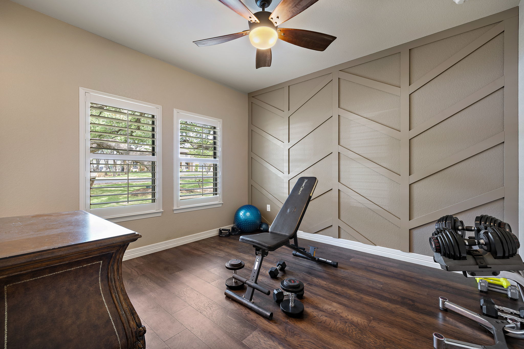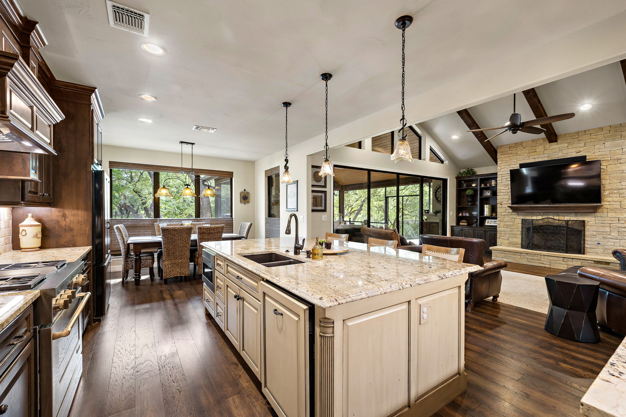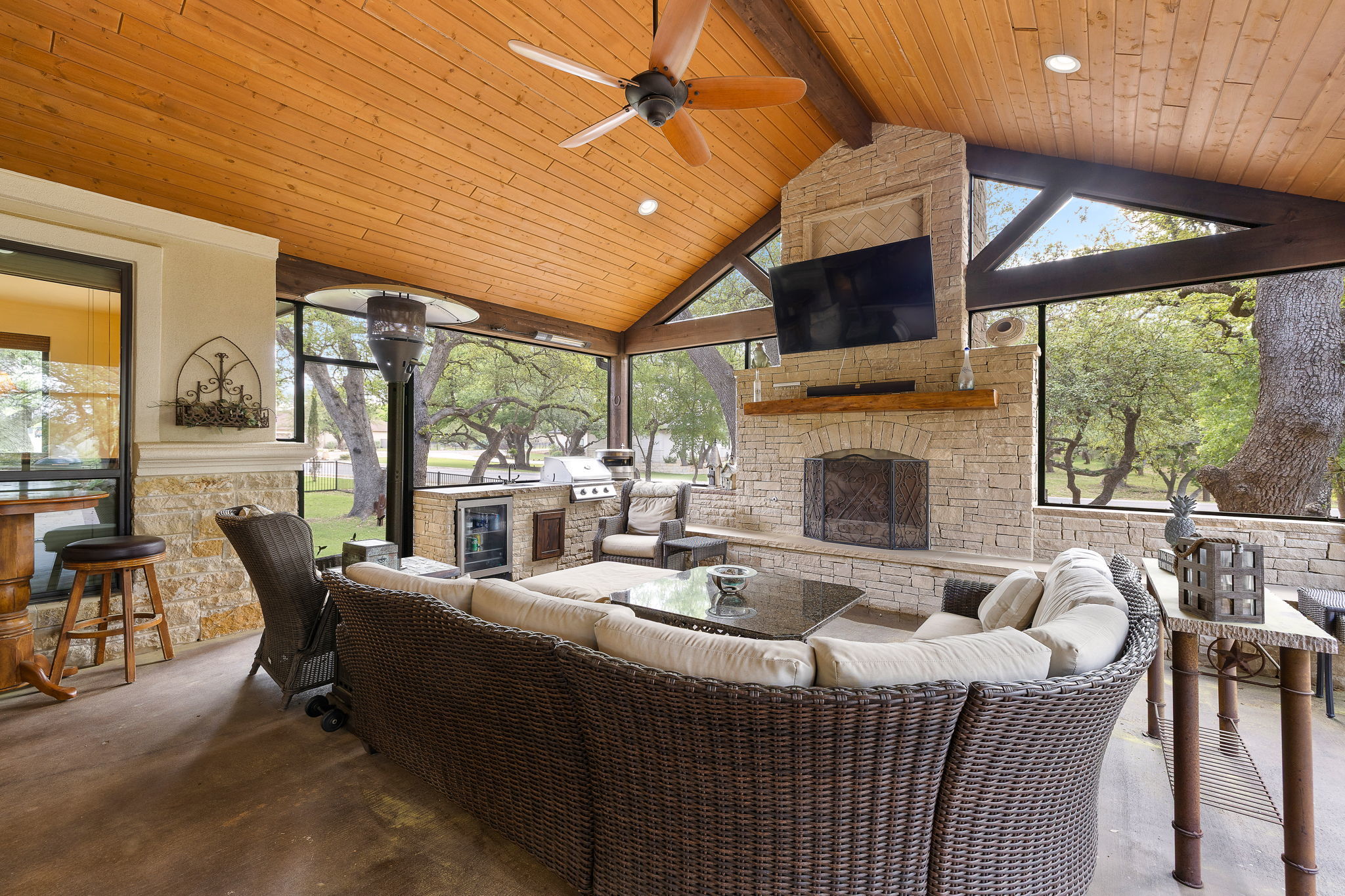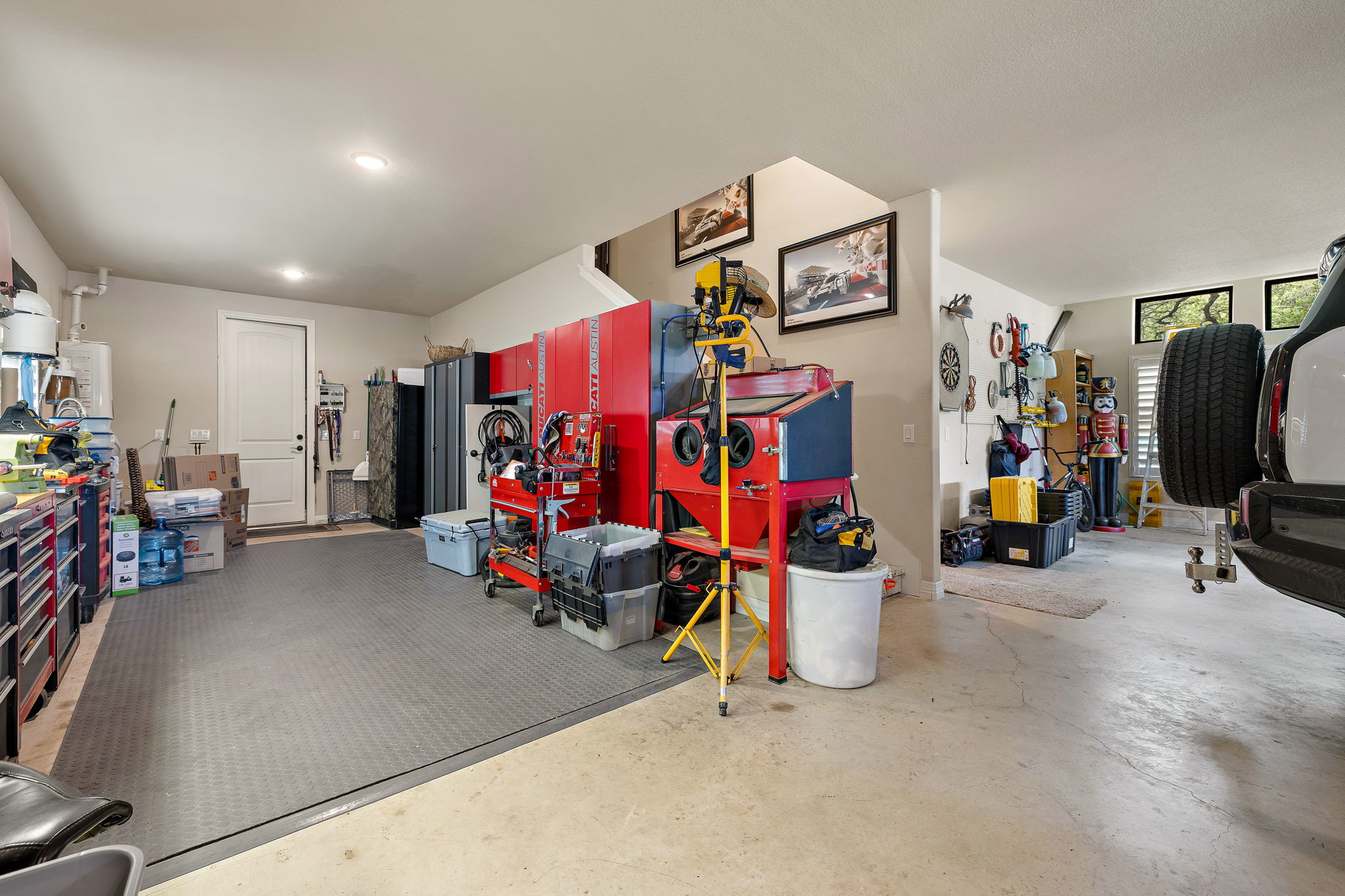 Welcome to an exceptional Liberty Hill estate where luxury, functionality, and space come together on a beautifully treed homesite. Tucked beneath mature oaks and offering incredible curb appeal, this thoughtfully designed home delivers the ideal blend of everyday comfort and standout features buyers rarely find. A true showstopper is the massive 4-car garage setup, offering incredible flexibility for car enthusiasts, hobbyists, storage needs, home projects, or extra workspace. In addition to the expansive main garage, the property also features an impressive second-story workshop/storage area with attic access, creating an unmatched amount of usable space for equipment, seasonal storage, business needs, or the ultimate workshop. Inside, the home is warm and inviting with rich wood floors, soaring beamed ceilings, and a stunning floor-to-ceiling stone fireplace anchoring the spacious main living area. Large windows frame gorgeous views of the oak-covered lot while filling the home with natural light. The chef’s kitchen is beautifully appointed with custom dark wood cabinetry, granite countertops, high-end stainless appliances, a large center island, and abundant prep and storage space, all flowing seamlessly into the dining and living spaces for easy entertaining. The spacious primary suite offers a peaceful retreat with private outdoor access, a spa-like bath with dual vanities, oversized walk-in shower, soaking tub, and a generous walk-in closet. Secondary bedrooms are thoughtfully positioned for privacy, and the dedicated office provides the perfect work-from-home setup. Step outside to the incredible screened patio with vaulted wood ceilings, stone fireplace, and plenty of room for year-round relaxing and entertaining. The expansive backyard is shaded by mature trees and offers space to roam, play, garden, or simply enjoy the peaceful Hill Country setting.