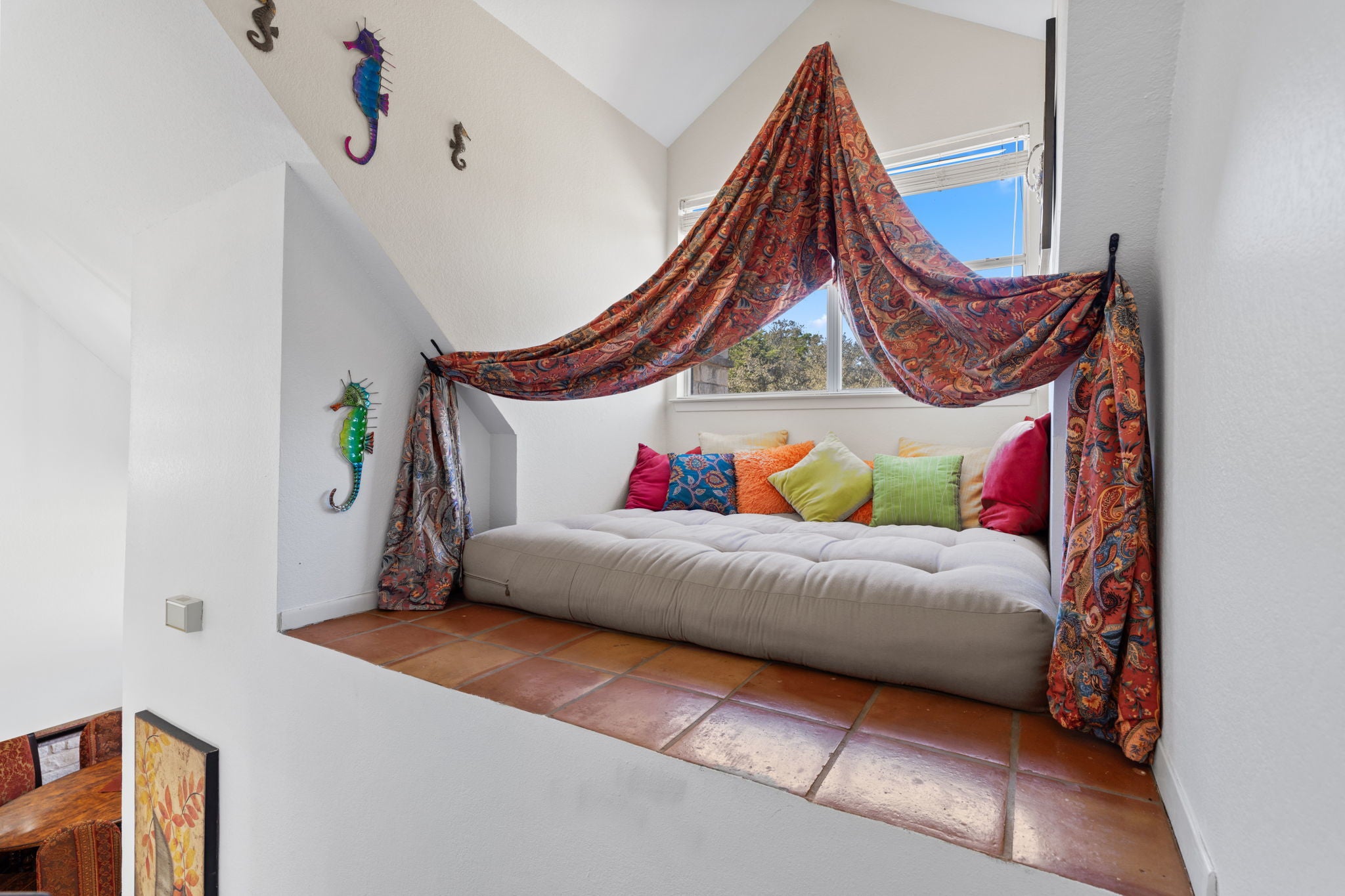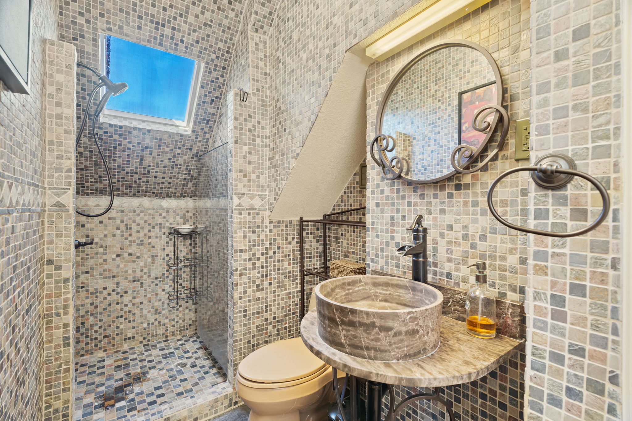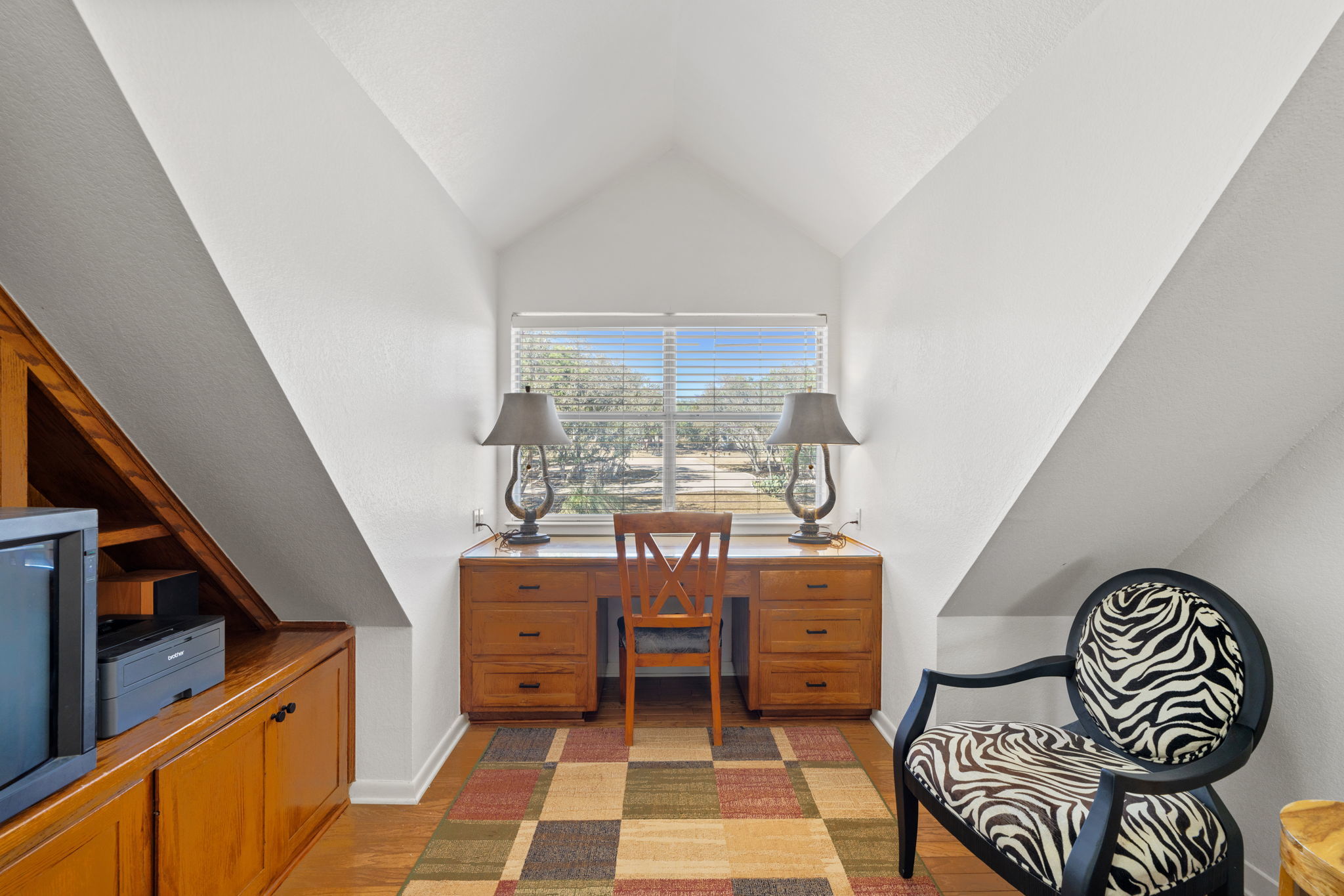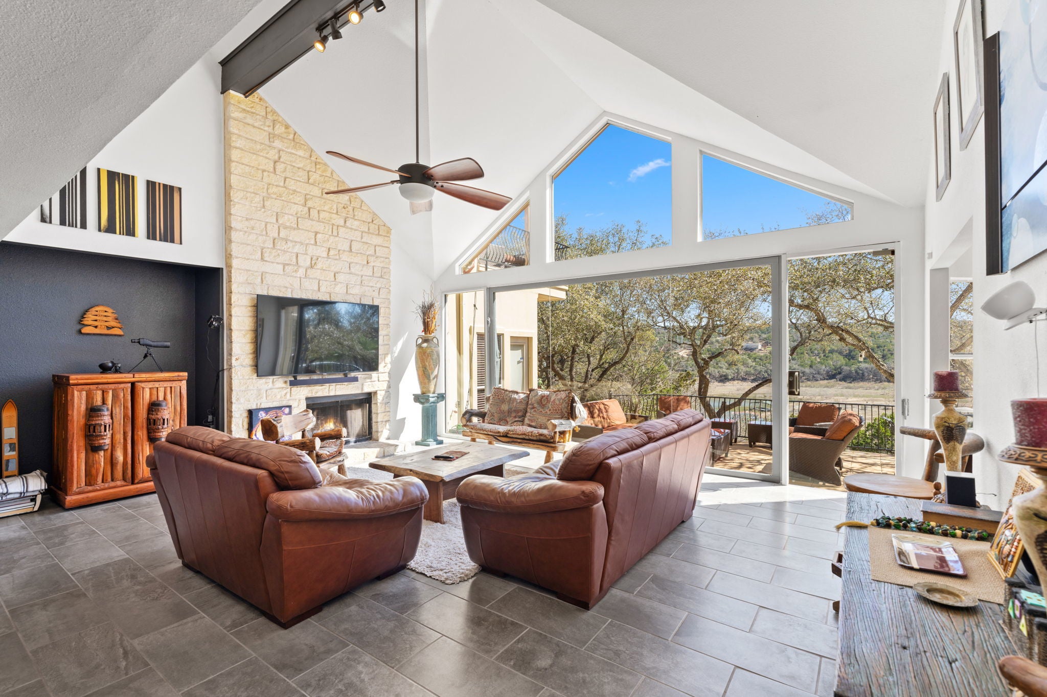 Special & unique house situated on 2.7 acres on Lake Travis w/ 200 feet of water frontage! Only 40min to downtown Austin or Bergstorm Int’l Airport directly via Hwy 71. House has unique features! Owned & occupied by a renowned innovative engineer as second owners, with 5+ bedrooms, 4.5 baths, 2 car garage and 3 car ports, gated and fenced, circular driveway around water fountain & castle like entrance. Enter with mesmerizing open bay views to the lake, high vaulted ceilings in the living room centered by a unique 16 ft glass bay that opens on hydraulics and a cozy wood burning stone fireplace. Enjoy a spacious primary suite on the main level plus additional sitting room with a stone fireplace and outdoor views to patio and lake. Nice kitchen w/ granite countertops and stainless appliances w/ amazing views of the lake and open to the breakfast area w/ a lovely window banquette seating. Dine w/ ease in the ample size dining room w/ wood beams and Saltillo floors. Four guest bedrooms upstairs w/ possible 5th room as bedroom plus large game room w/ closet (can be bedroom) w/ access to covered outdoor patio and grand views! Additional loft located above the stairs. Three full baths upstairs! House has a covered water well system w/ solar power for unlimited water. 3 sheds for storage including a kiln used as art studio in the front of property w/ plenty of parking. Backyard has 3 porches, large hot tub/swim spa. The land is 2.72 acres extending to the lake with private back road access, boat ramp, large space for RV storage (water and power available) & space for boat parking. Special sizable flat meadows area w/ a soccer field & shooting range. Enjoy the very large boat dock fully carpeted, on a calm cove and great fishing. The dock has a small kitchen and storage area plus a bathroom, 24 ft boat lift, crank-up platform for jetskis, swim platform at water level, covered deck w/ BBQ and hammock! The dock alone is worth over $100k! Must see!