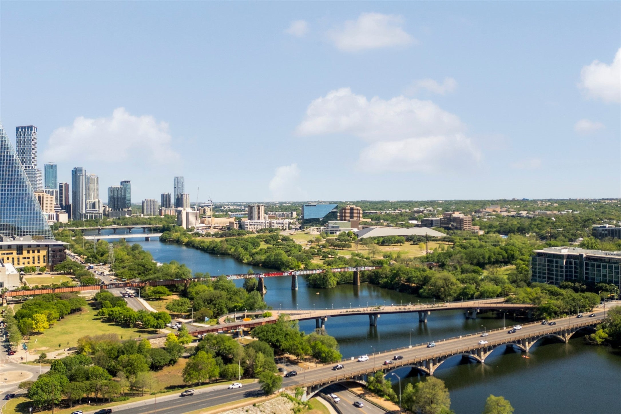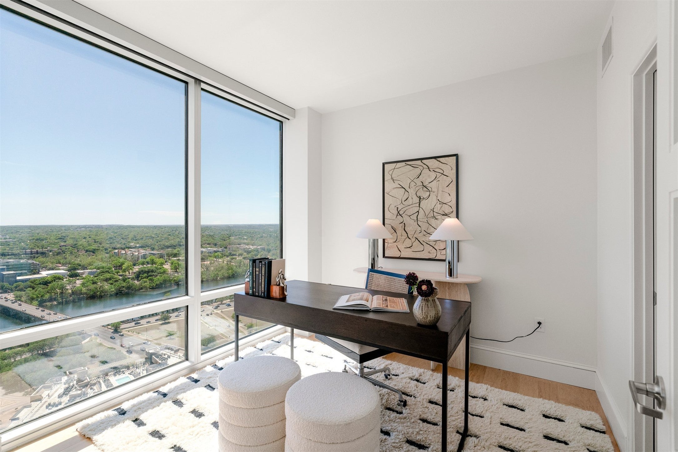 Living at the Spring Condominiums means having the best of Downtown Austin’s Market District right outside your front door. This 3-bedroom, 3-bathroom high-rise condo, on the 29th floor, offers the kind of elevation that defines city life, where the views stretch across Lady Bird Lake and Downtown Austin. If you’ve been looking for a home where you can walk to your morning grocery run or hop onto the hike-and-bike trail in minutes, this corner of the Market District is exactly where you want to be. The layout is centered around an open living room and kitchen that feel connected to the skyline. Floor-to-ceiling windows run the entire length of the southern wall, so whether you’re making coffee at the granite center island or relaxing on the couch, Lady Bird Lake and Zilker Park are always in sight. The kitchen feels refreshed with a new dishwasher and faucet, while the entire home has a elevated feel thanks to fresh interior paint. Every room in this residence is fitted with custom shades and a Nest thermostat. The primary bedroom is a quiet spot with custom closet storage and an attached bathroom featuring a dual vanity, walk-in shower, and a recently added bidet. The second bedroom also has tailored closet organization, while the third bedroom offers great flexibility with a built-in Murphy bed, allowing it to easily pivot from a home office to a space for guests. Beyond the front door, Spring Condominiums provides a full-service experience. You have access to a pool deck, a fitness center, and even guest suites for when friends visit. This unit also includes 2 prime parking spaces in the garage equipped with a Tesla charger. Being in the Market District puts you a block from Whole Foods and Trader Joe’s, REI, and dining spots along West 6th Street. You’re effectively in a central hub where the Seaholm District and the waterfront trails are your backyard, making this Spring Condominiums condo a true standout for anyone who wants the full Austin experience.