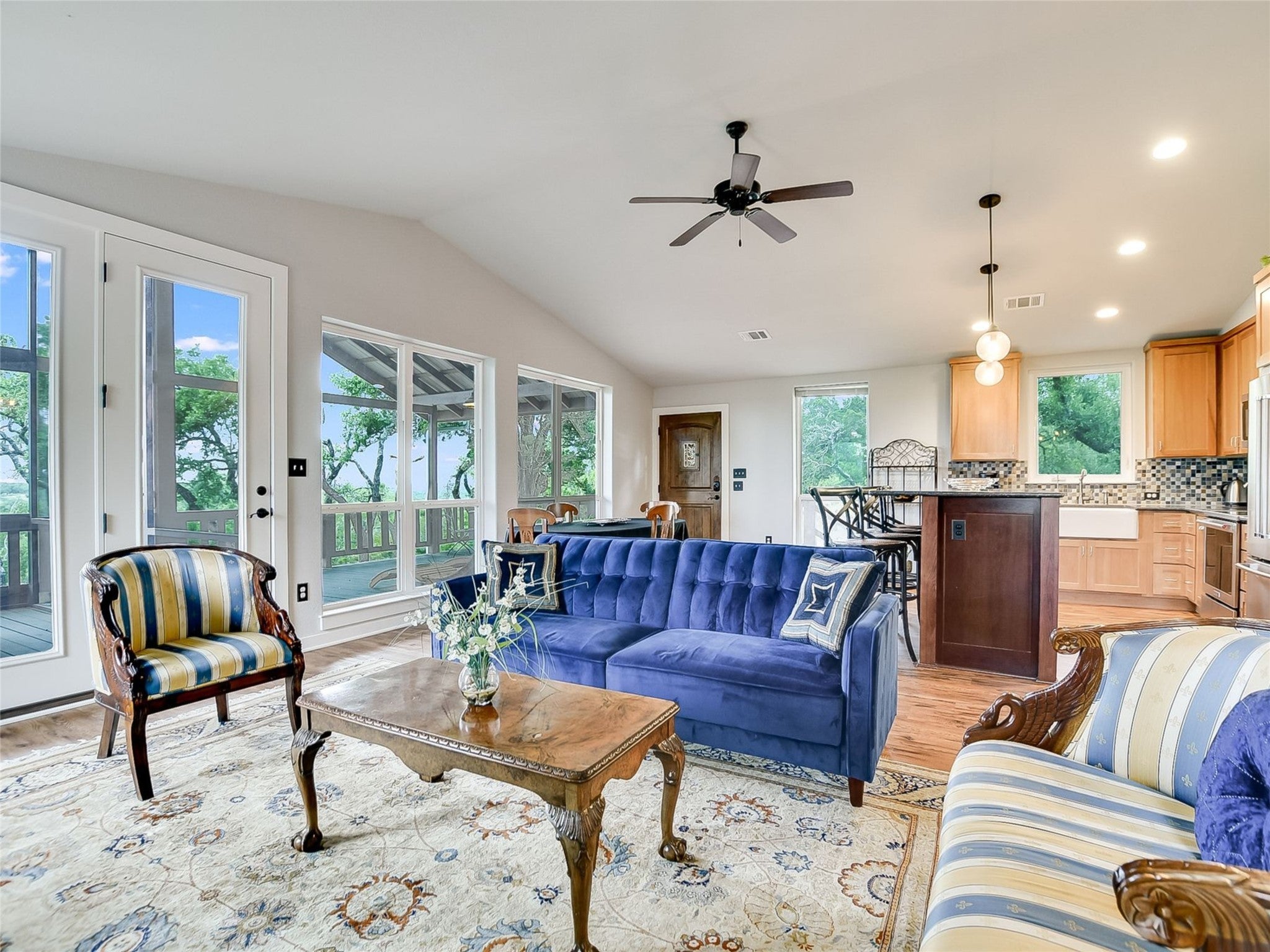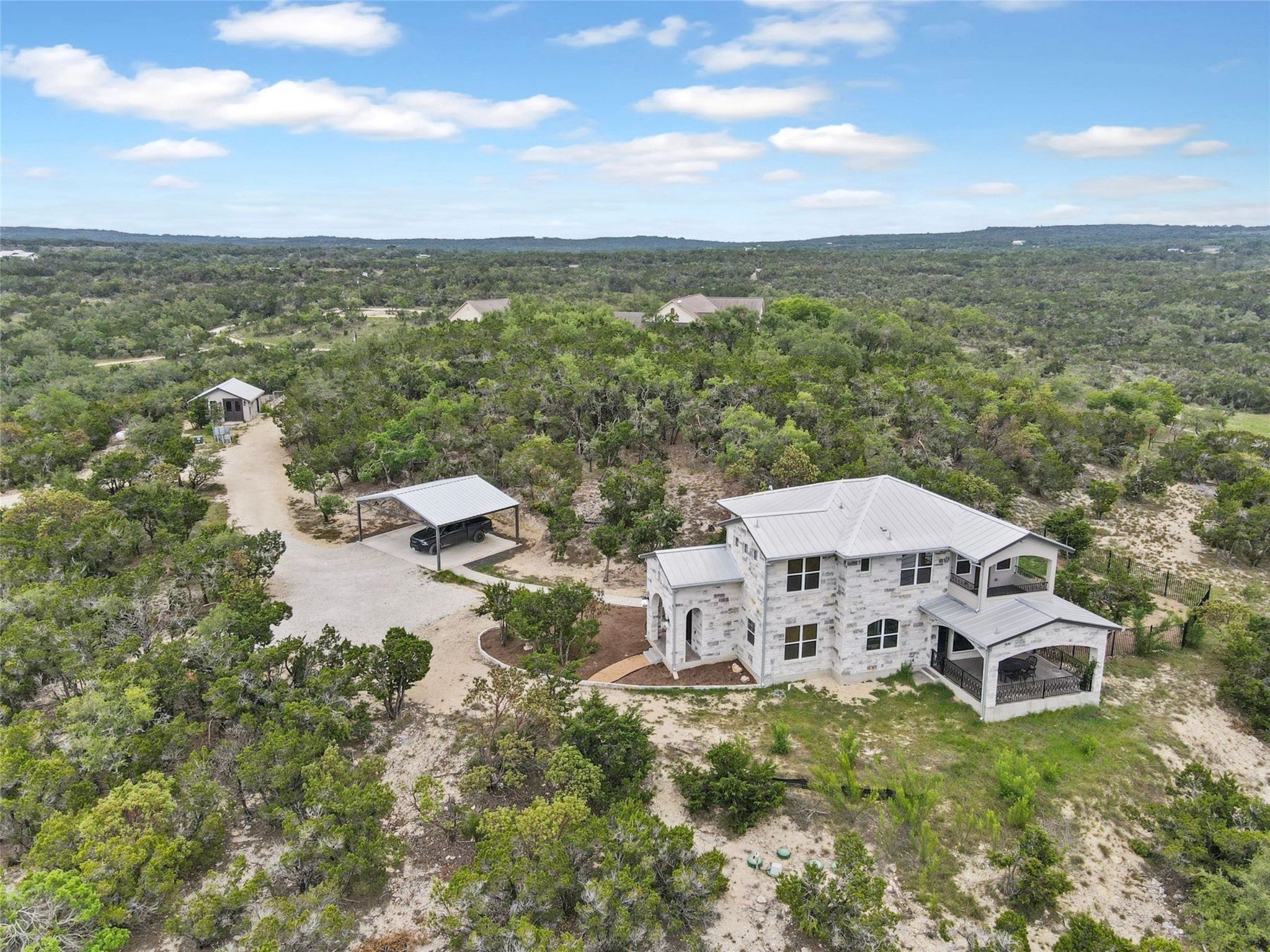 Set across 25.52 acres of rolling Texas countryside, this exceptional property features two distinctive residences, sweeping views, and endless possibilities. The Hilltop House (2,837 sqft | 3 bedrooms | 3.5 baths) is rich in character, showcasing natural wood accents, striking Acacia flooring, and a thoughtfully designed layout that feels warm and intentional. The chef’s kitchen is a true centerpiece with custom Kent Moore cabinetry, a Wolf six-burner range, Sub-Zero refrigerator, oversized island with dual drawer refrigerators, auxiliary sink, and seating for eight - ideal for gathering and entertaining. Each bedroom features a private ensuite bath. Two additional flex rooms - upstairs and downstairs - offer versatility for a home office, gym, media room, or retreat. Expansive balconies on both levels capture panoramic views and unforgettable Texas sunsets. Privately positioned on the property, the Cottage (1,242 sqft | 2 bedrooms | 2 baths) has been fully updated and lives like a retreat. Complete with a full kitchen, living area, private deck, and screened porch, it’s ideal for guests, short-term rental income, or bridal parties headed to Dripping Springs. With no restrictions, the acreage offers exceptional flexibility - expand, build, create, or simply enjoy the open space. Feeding stations, nesting boxes, and maintained water sources support a thriving wildlife habitat. A large fenced area is well-suited for a barn, greenhouse, or livestock, with rainwater collection just inside the gate. Additional improvements include a well with water softening systems, propane tanks, a Generac generator servicing the Hilltop House, gated gardens, and a temperature-controlled ADU ideal for an office, studio, or storage. Whether envisioned as a private homestead, event venue, or income-producing investment, this property presents extraordinary opportunity in a breathtaking setting.