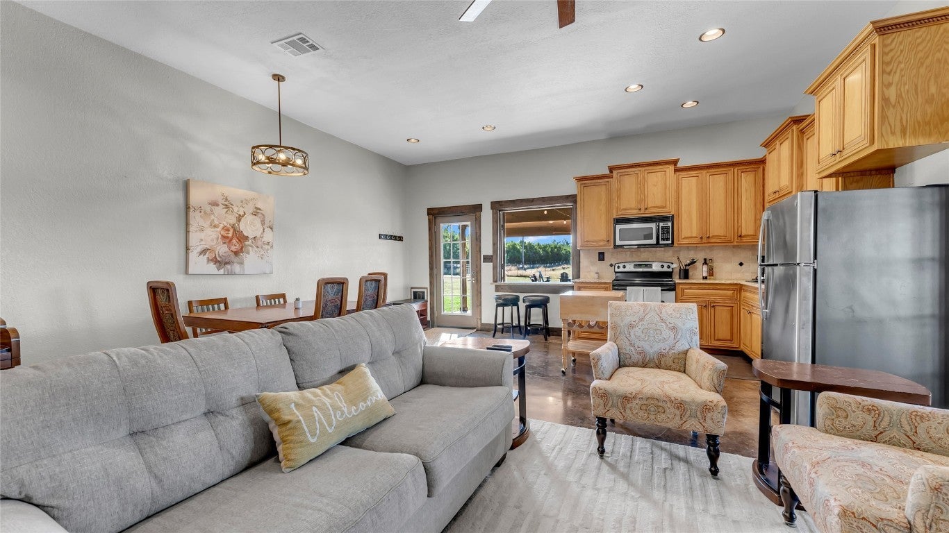 Secluded and private, this 79-acre property in historic Oatmeal, Texas, has plenty of room for the whole family. Seven miles from Bertram and in the quiet hill country, this property is accessed by a shared maintained road. No restrictions, private well, and fully fenced, there are three separate living quarters: a beautifully, maintained, one-bedroom house, a loft studio apartment, and a side apartment with screened-in-porch, plus a large shop, four barn stalls, and dressage arena. The barndominium has bonus rooms including a large office and tack rooms. The sunrises and sunsets viewed from the in-ground pool make this property a magnificent location to relax and enjoy nature. Dark skies at night with a 360-degree view make for amazing star gazing. Wildlife seen include white-tail and axis deer, fox, elk, coyotes, hogs, raccoon, possum, eagles, crested Cara-cara, hawks, and more. Wet-weather Oatmeal Creek runs through the property. The ranch is income-generating with the poolhouse as a 5-star Airbnb property. The buildings remained dry during the 2025 July floods.Sq footage breakdown: loft apartment (800sq ft), side apartment (334 sq ft), and pool house (924 sq ft) in the square footage it totals 2,058, Barn Downstairs- 1600 sq ft with offices, rooms heated/cooled and large workshop and laundry.