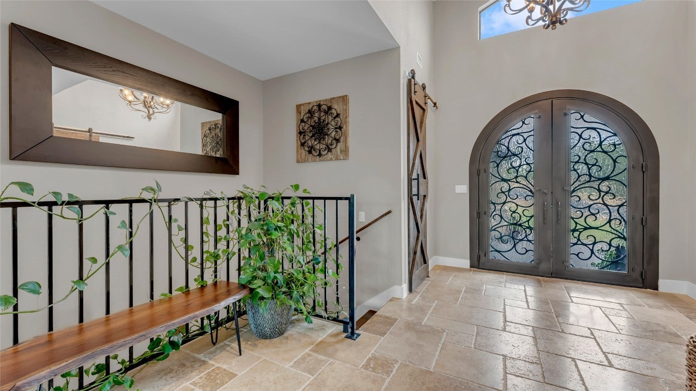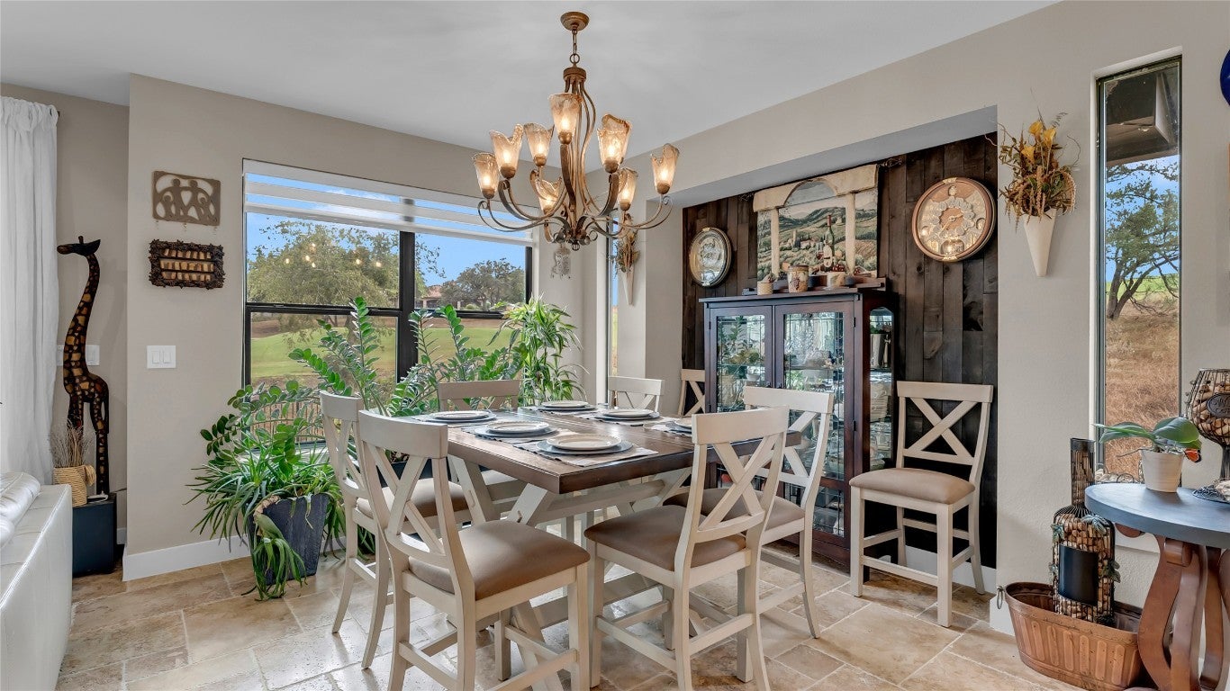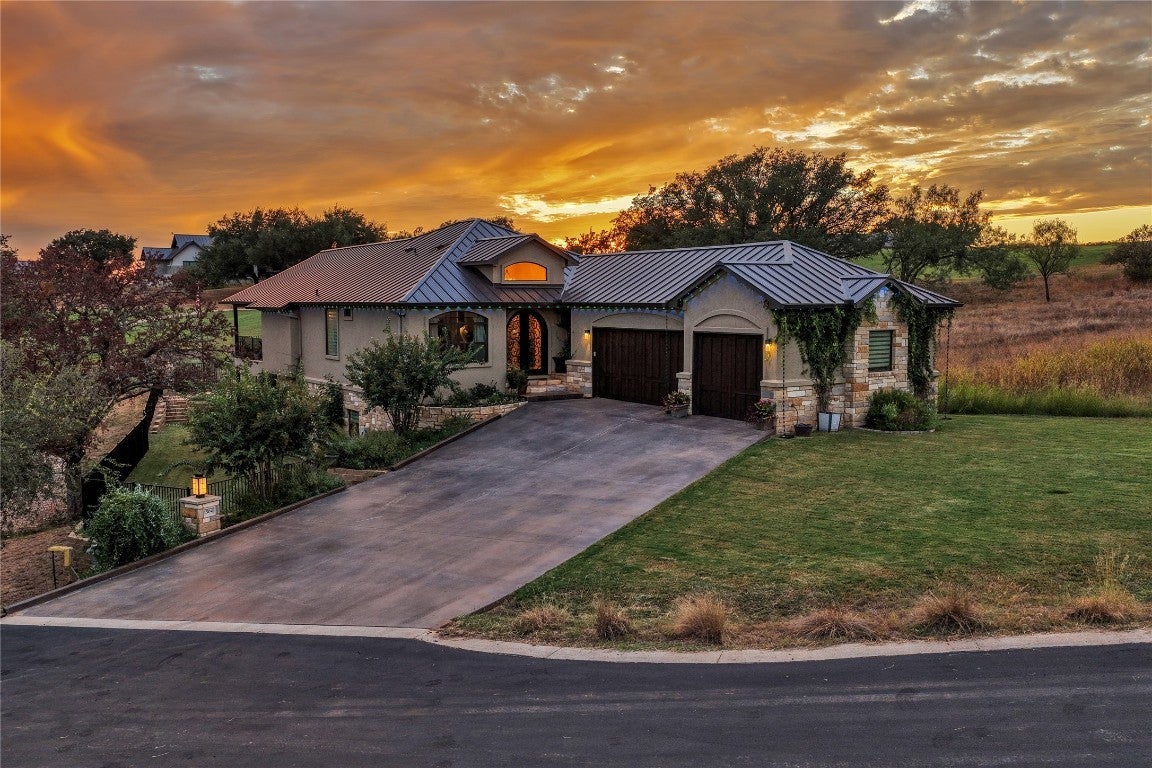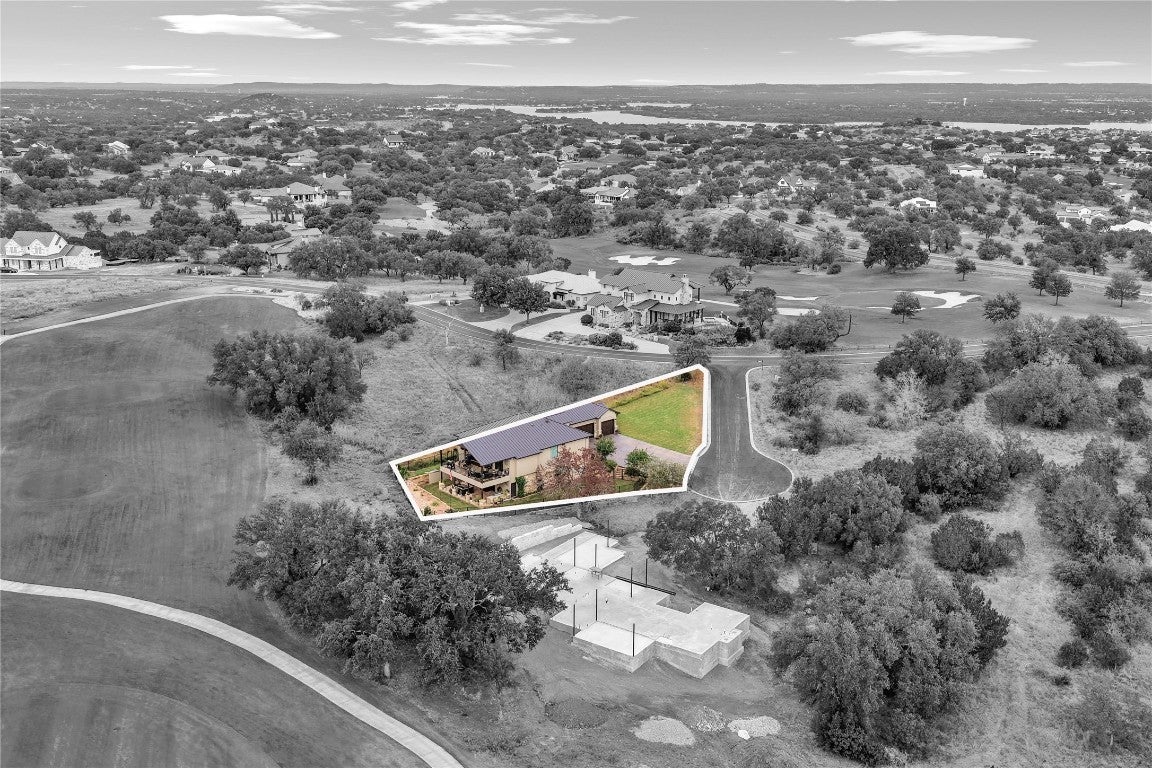 Nestled in a quiet cul-de-sac and overlooking the 7th hole of the renowned Ram Rock Golf Course, this custom-built 3 bedroom, 3.5 bath home with office and media room offers luxury, efficiency, and breathtaking Hill Country views. Step through the custom wrought-iron double front doors into an inviting interior featuring antique Bari chiseled travertine tile throughout with plush carpet in bedrooms, 8-footdoors, and abundant natural light. The main living area showcases an electric stone-faced fireplace and flows seamlessly to the expansive deck and patio areas - nearly 1,000 sq. ft. of outdoor patio living space with cedar tongue-and-groove ceilings and an outdoor kitchen that is designed for entertaining, with granite countertops, gas grill, sink, and refrigerator. The chef’s kitchen is outfitted with Samsung stainless appliances, elegant granite counters with a marble mosaic backsplash, and an oversized pantry with exceptional storage. The primary suite, located on the main floor, boasts a spectacular view of the golf course and a spa-like bath with a 60"standalone soaking tub and huge walk-in shower. Each additional bedroom includes a frameless glass shower and custom finishes. Downstairs, enjoy a second common area with a stone fireplace and bar, media room, two guest rooms and bonus laundry setup, perfect for guests. This home blends modern efficiency with timeless design, offering expansive views, thoughtful details, and resort-style outdoor living.