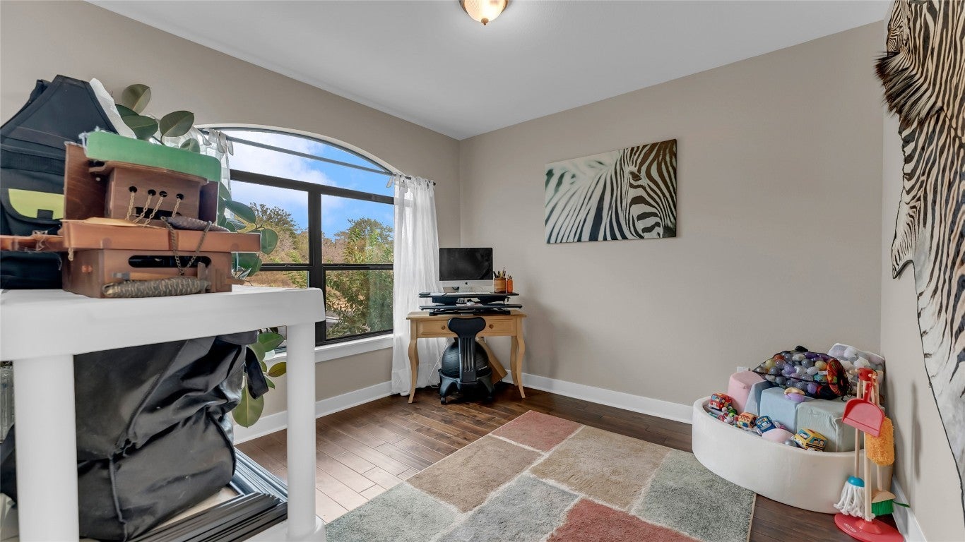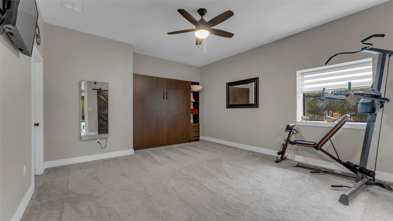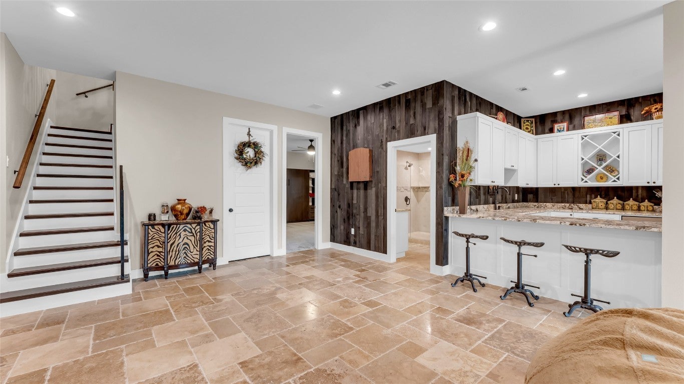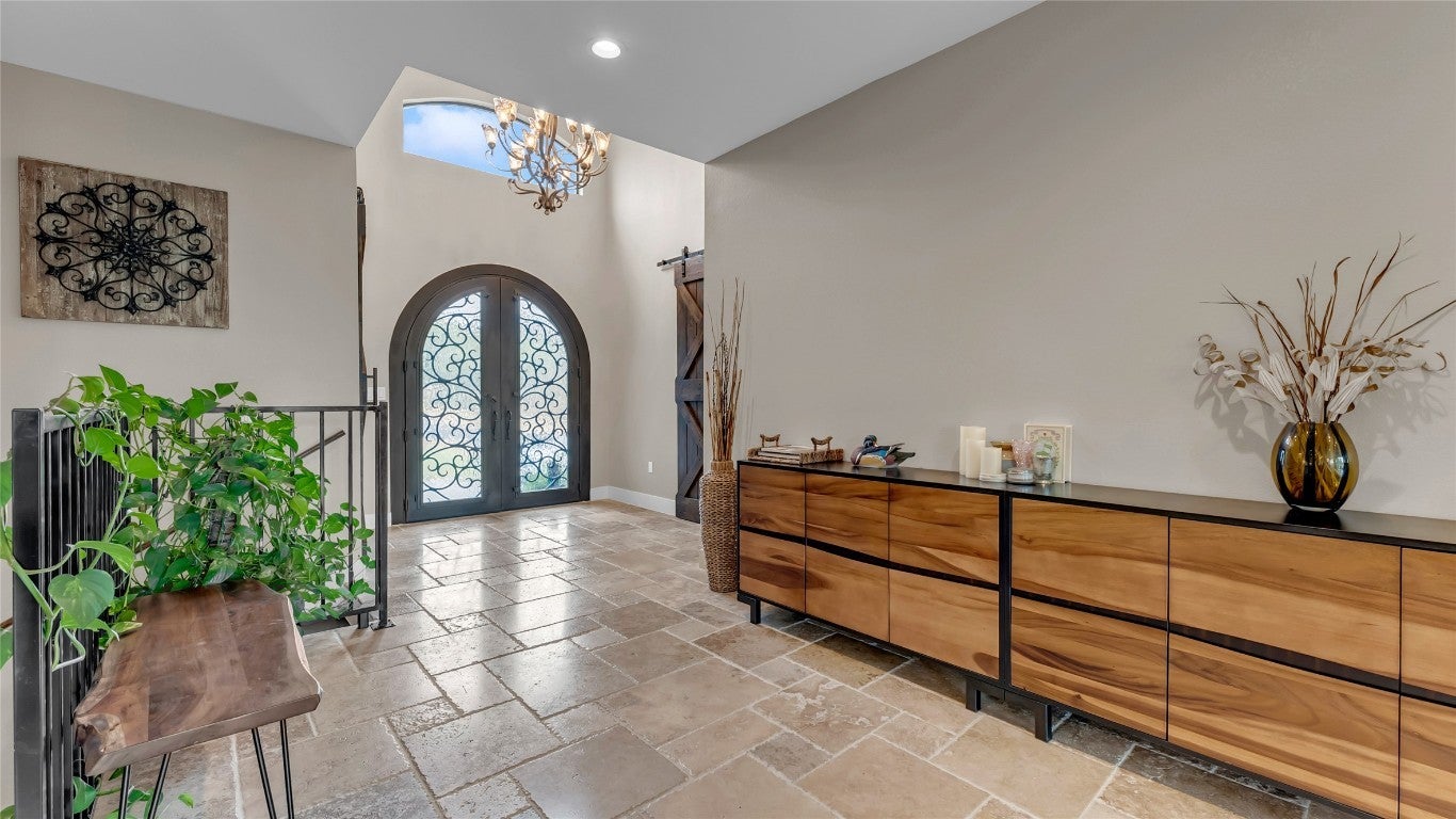 Nestled in a quiet cul-de-sac and overlooking the 7th hole of the renowned Ram Rock Golf Course, this custom-built 3 bedroom, 3.5 bath home with office and media room offers luxury, efficiency, and breathtaking Hill Country views. Step through the custom wrought-iron double front doors into an inviting interior featuring antique Bari chiseled travertine tile throughout with plush carpet in bedrooms, 8-footdoors, and abundant natural light. The main living area showcases an electric stone-faced fireplace and flows seamlessly to the expansive deck and patio areas - nearly 1,000 sq. ft. of outdoor patio living space with cedar tongue-and-groove ceilings and an outdoor kitchen that is designed for entertaining, with granite countertops, gas grill, sink, and refrigerator. The chef’s kitchen is outfitted with Samsung stainless appliances, elegant granite counters with a marble mosaic backsplash, and an oversized pantry with exceptional storage. The primary suite, located on the main floor, boasts a spectacular view of the golf course and a spa-like bath with a 60"standalone soaking tub and huge walk-in shower. Each additional bedroom includes a frameless glass shower and custom finishes. Downstairs, enjoy a second common area with a stone fireplace and bar, media room, two guest rooms and bonus laundry setup, perfect for guests. This home blends modern efficiency with timeless design, offering expansive views, thoughtful details, and resort-style outdoor living.