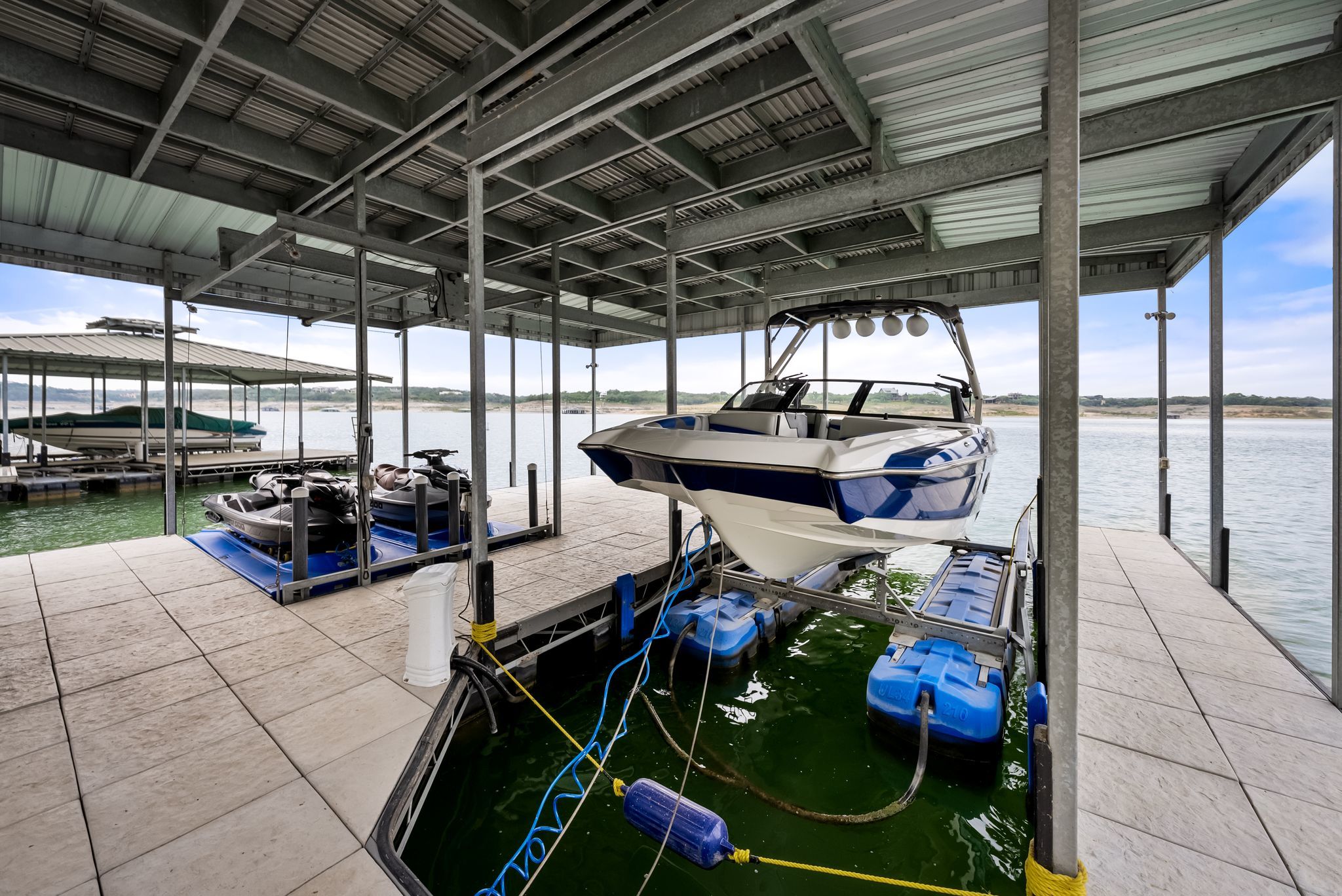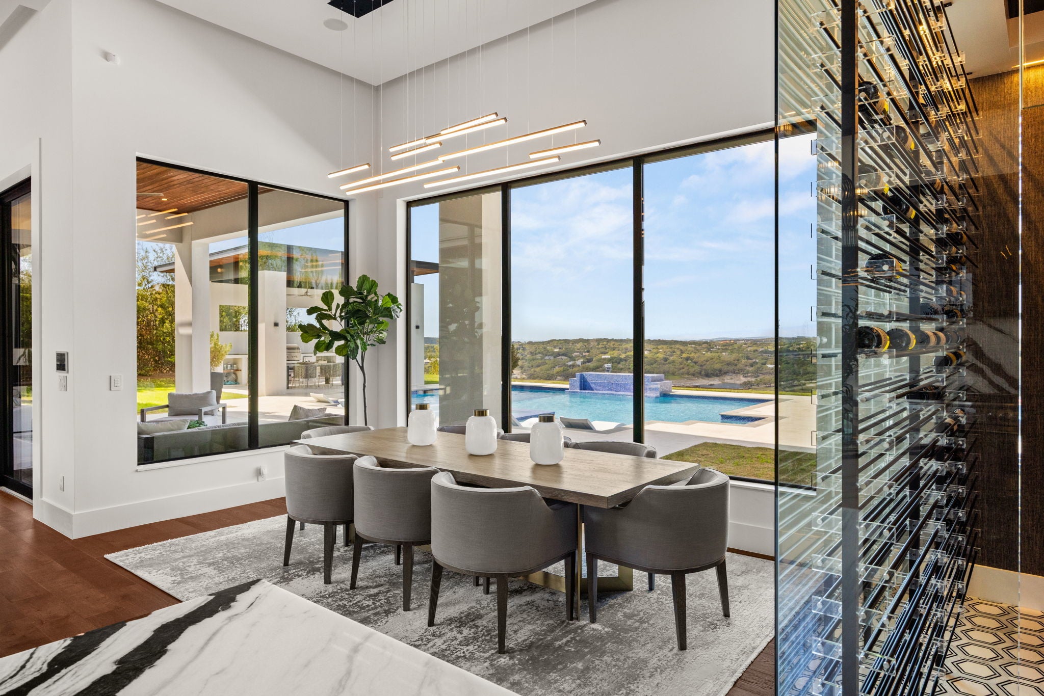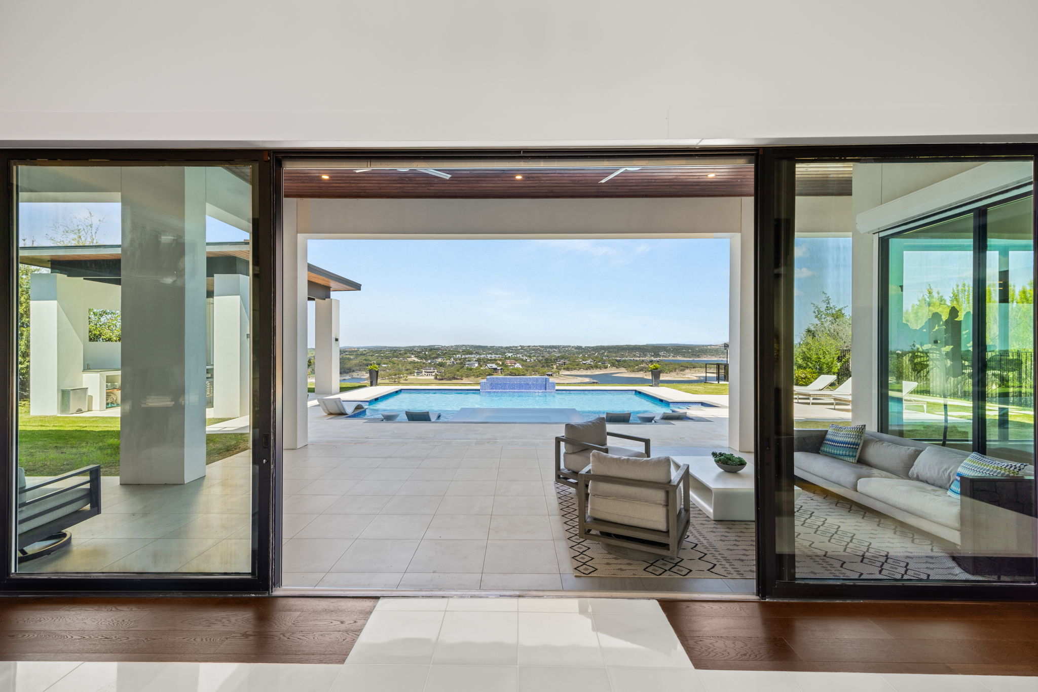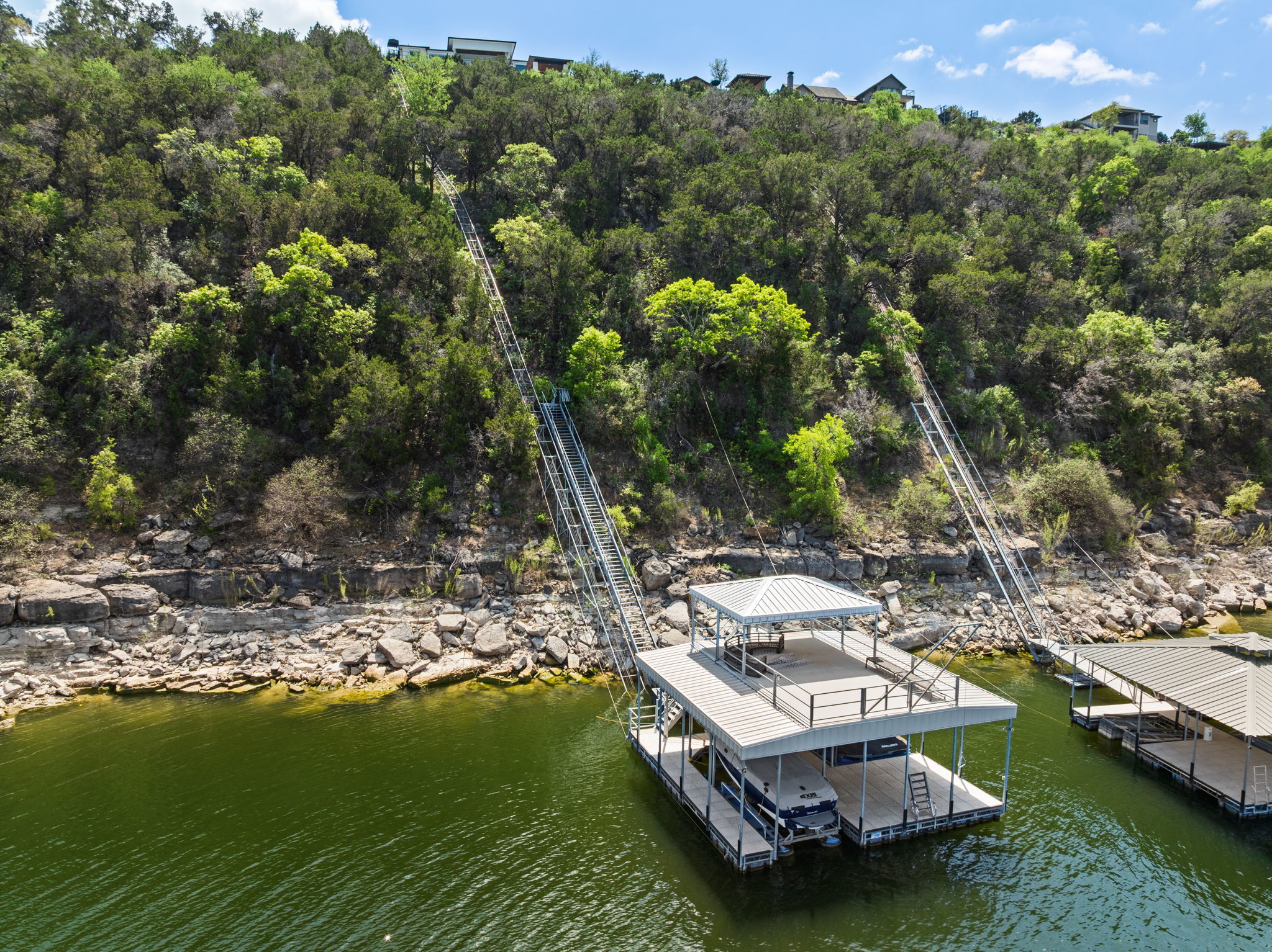 Enjoy luxury lakefront living at a fraction of the price of Lake Austin. Set on the deep waters of Lake Travis in Lago Vista, this striking modern estate rises nearly 80 feet above the shoreline, capturing sweeping panoramic views and unforgettable sunsets from nearly every room. A dramatic double floating staircase creates an unforgettable first impression, while walls of glass frame the lake and surrounding Hill Country. The marble wrapped kitchen flows seamlessly into the main living and entertaining areas, anchored by a glass enclosed wine cellar that makes a bold architectural statement. Each bedroom offers its own en suite bath and private balcony, providing comfort and privacy for family and guests. A dedicated game room, lounge with bar, custom illuminated closets, marble floors, and a distinctive four car garage complete the home. Designed for both luxury and peace of mind, the home is equipped with a whole house generator and hurricane shutters. Outside, the pool and spa overlook the water, and a private tram leads to a two story dock with boat lift and dual jet ski ports for effortless days on the lake. Extensively upgraded, this residence is move in ready. Furniture and boat may be purchased separately, offering the opportunity for a fully turn key lakefront experience.