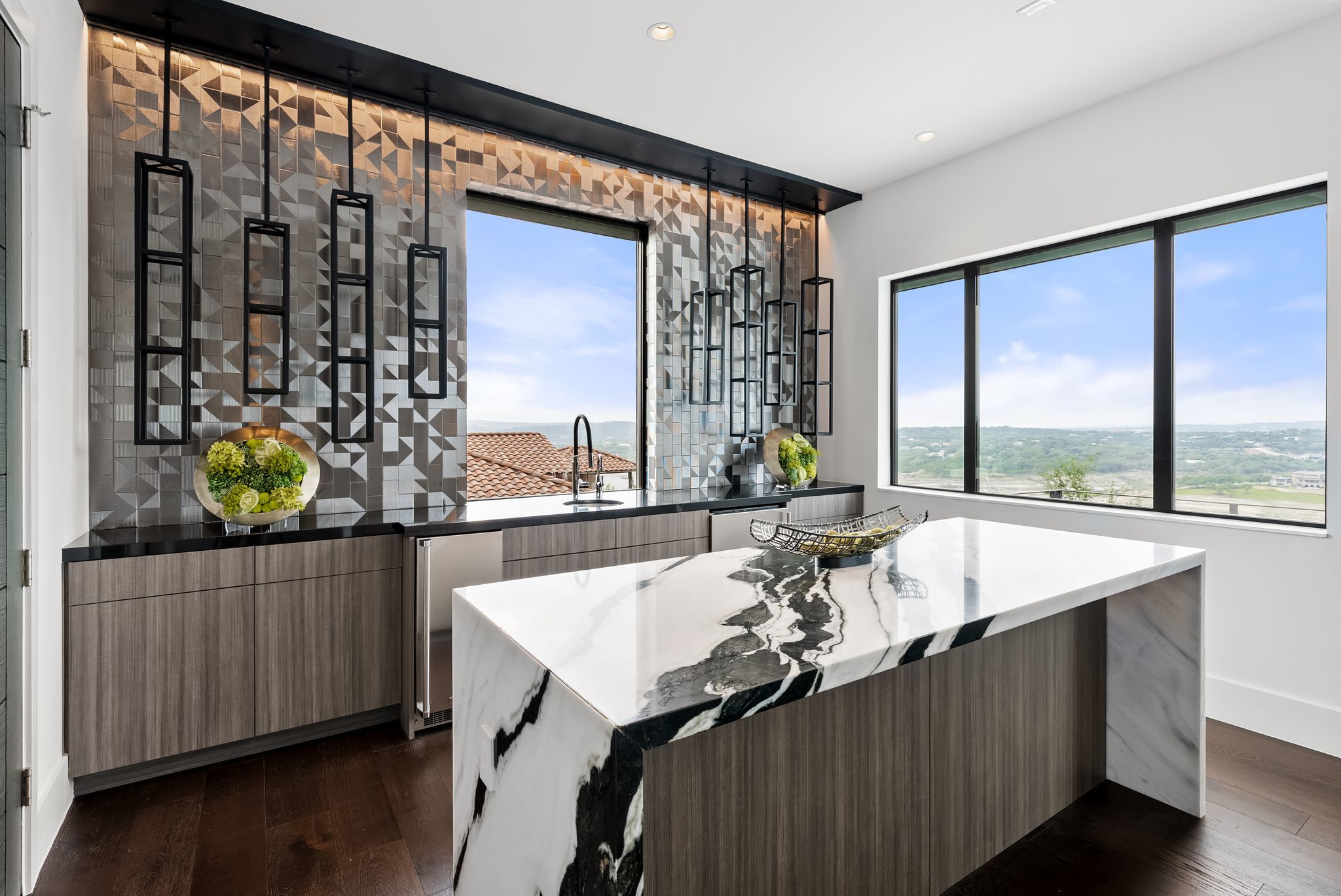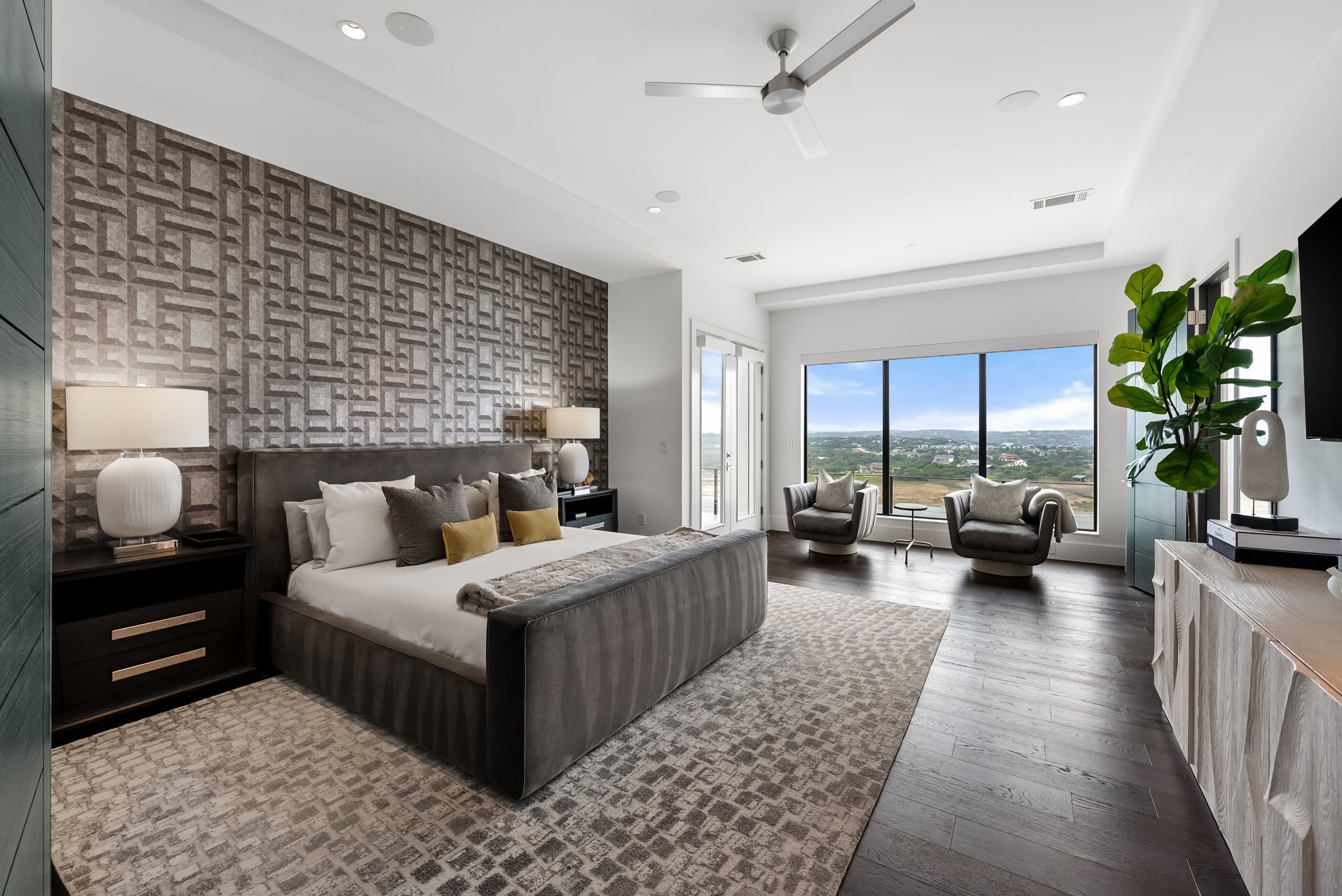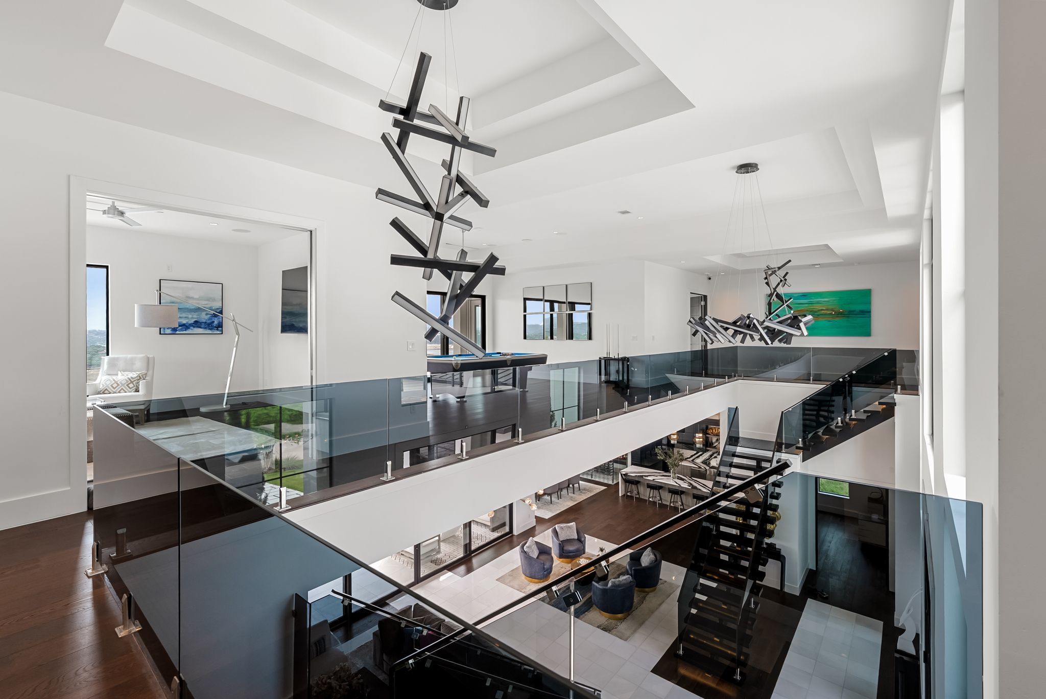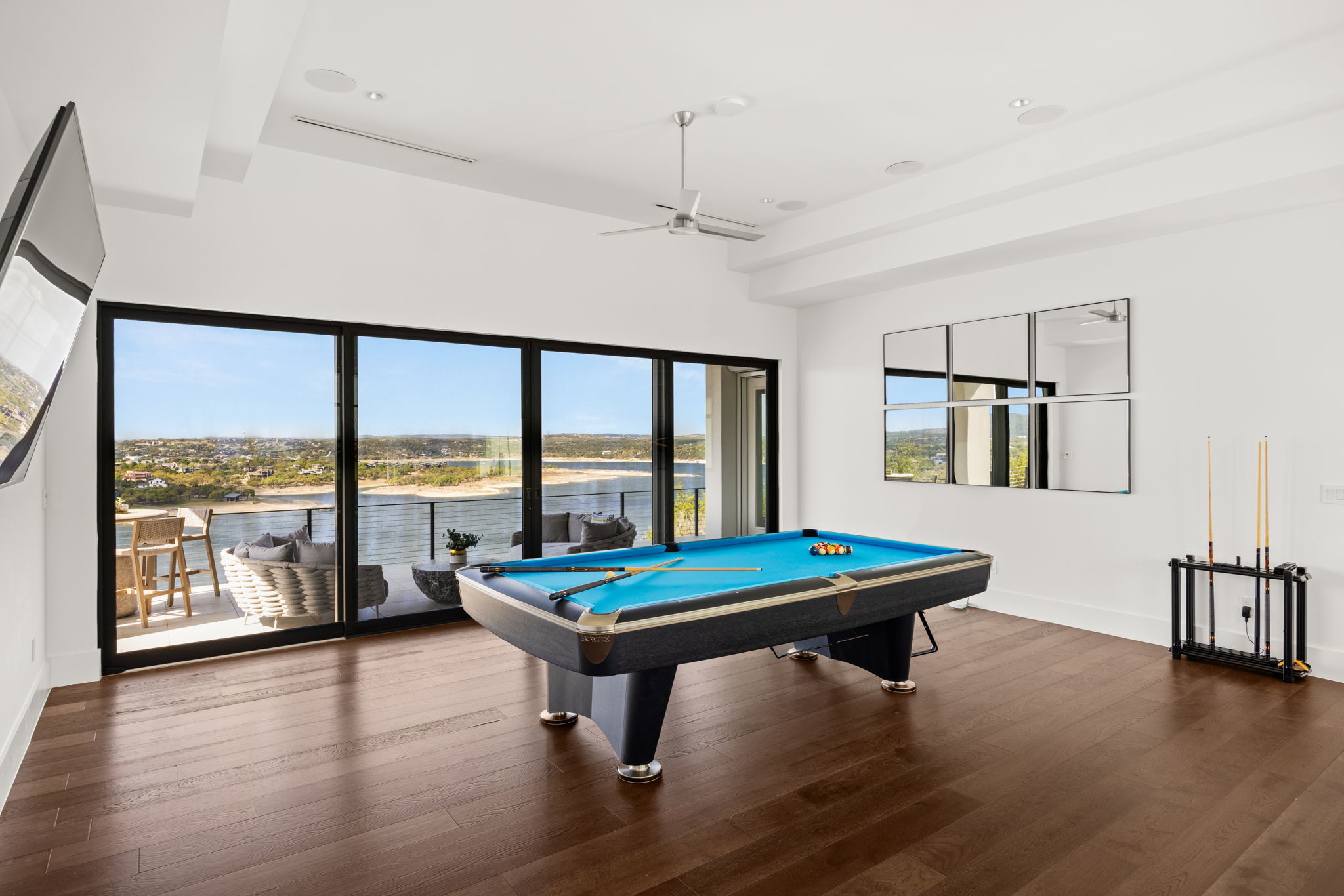 Enjoy luxury lakefront living at a fraction of the price of Lake Austin. Set on the deep waters of Lake Travis in Lago Vista, this striking modern estate rises nearly 80 feet above the shoreline, capturing sweeping panoramic views and unforgettable sunsets from nearly every room. A dramatic double floating staircase creates an unforgettable first impression, while walls of glass frame the lake and surrounding Hill Country. The marble wrapped kitchen flows seamlessly into the main living and entertaining areas, anchored by a glass enclosed wine cellar that makes a bold architectural statement. Each bedroom offers its own en suite bath and private balcony, providing comfort and privacy for family and guests. A dedicated game room, lounge with bar, custom illuminated closets, marble floors, and a distinctive four car garage complete the home. Designed for both luxury and peace of mind, the home is equipped with a whole house generator and hurricane shutters. Outside, the pool and spa overlook the water, and a private tram leads to a two story dock with boat lift and dual jet ski ports for effortless days on the lake. Extensively upgraded, this residence is move in ready. Furniture and boat may be purchased separately, offering the opportunity for a fully turn key lakefront experience.