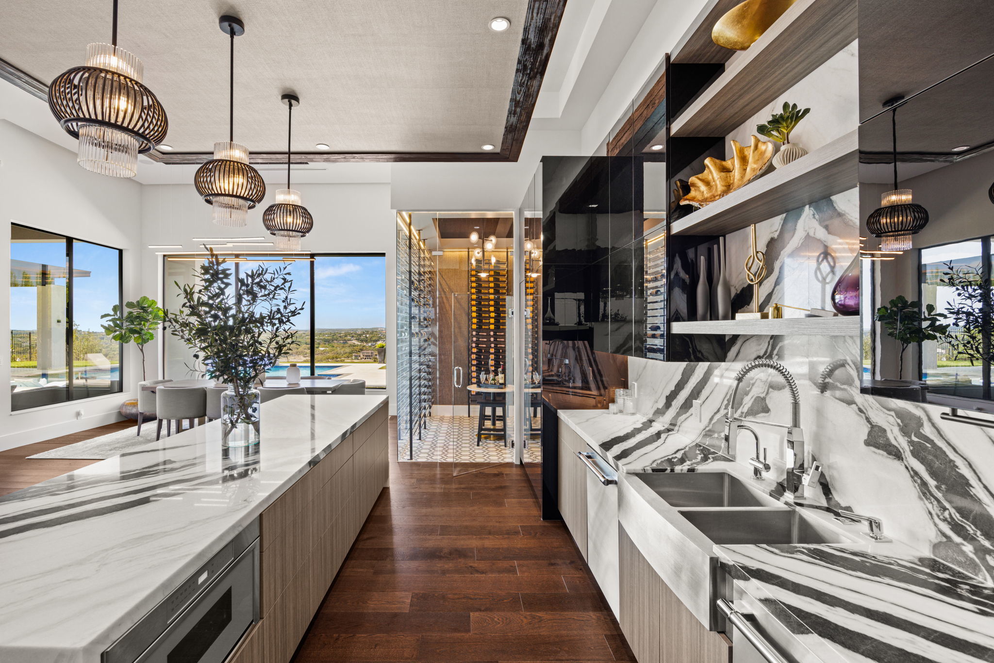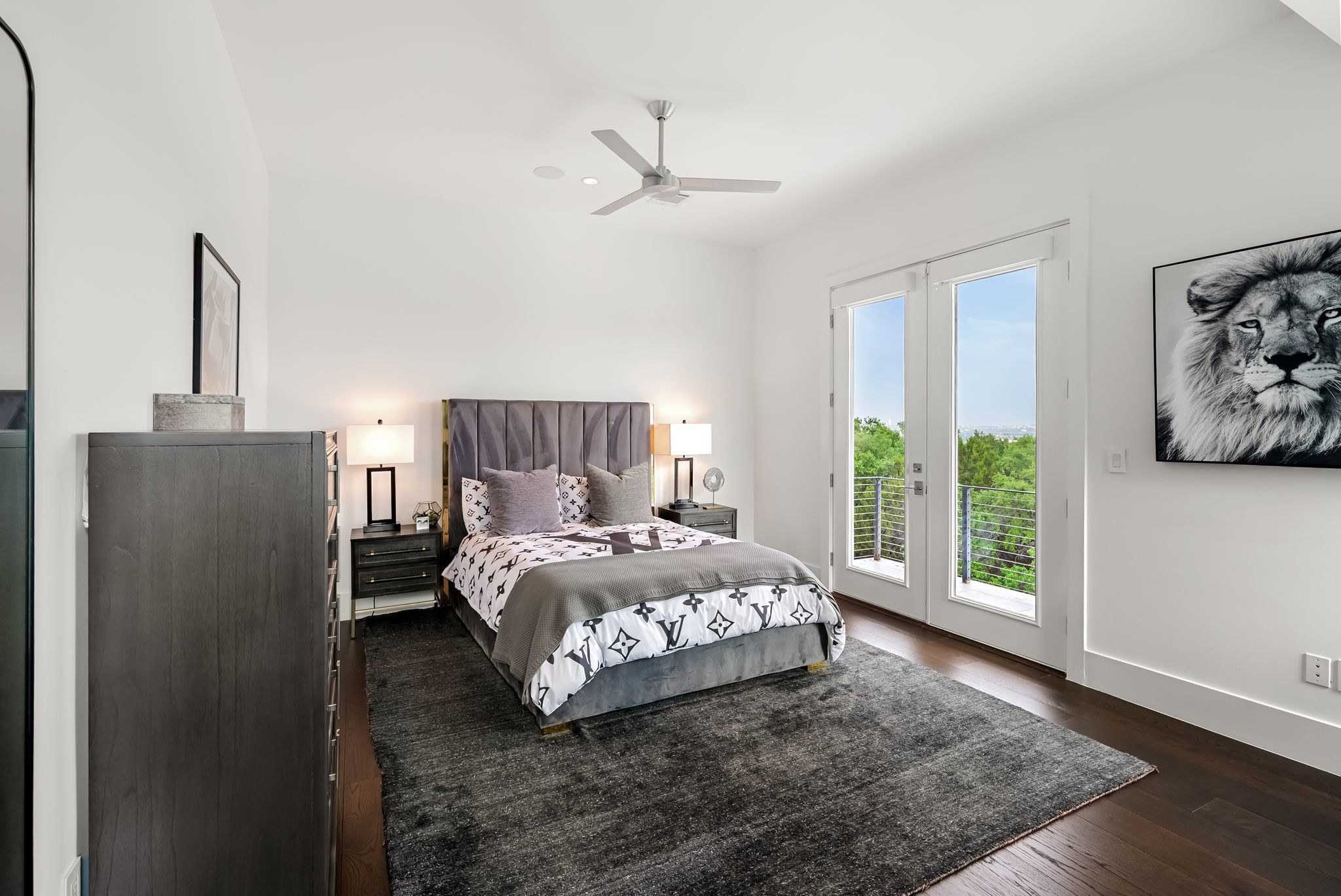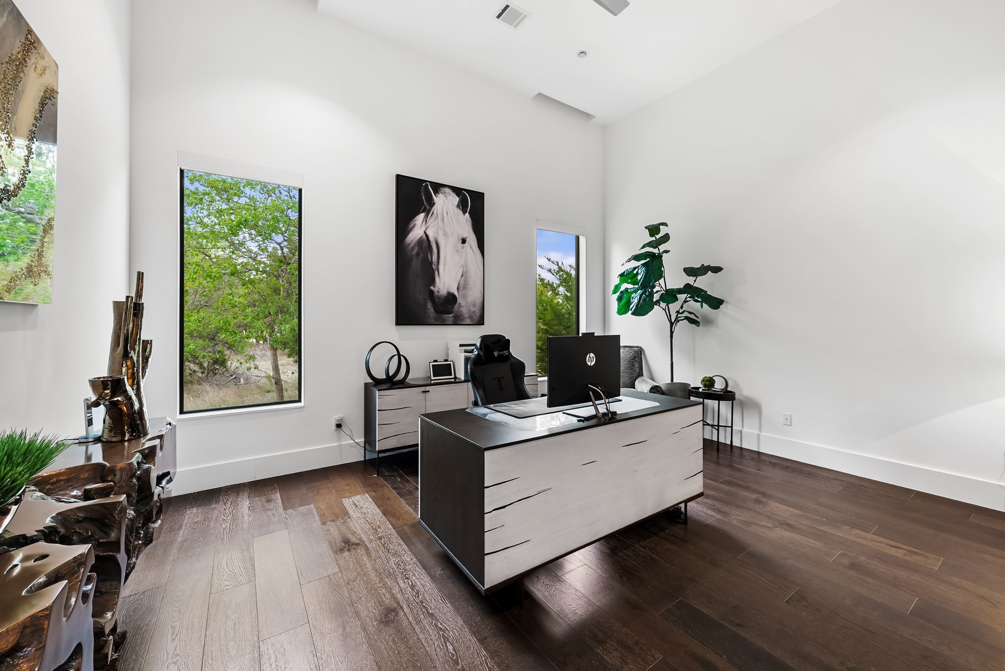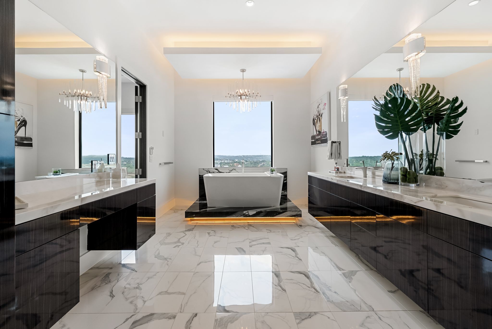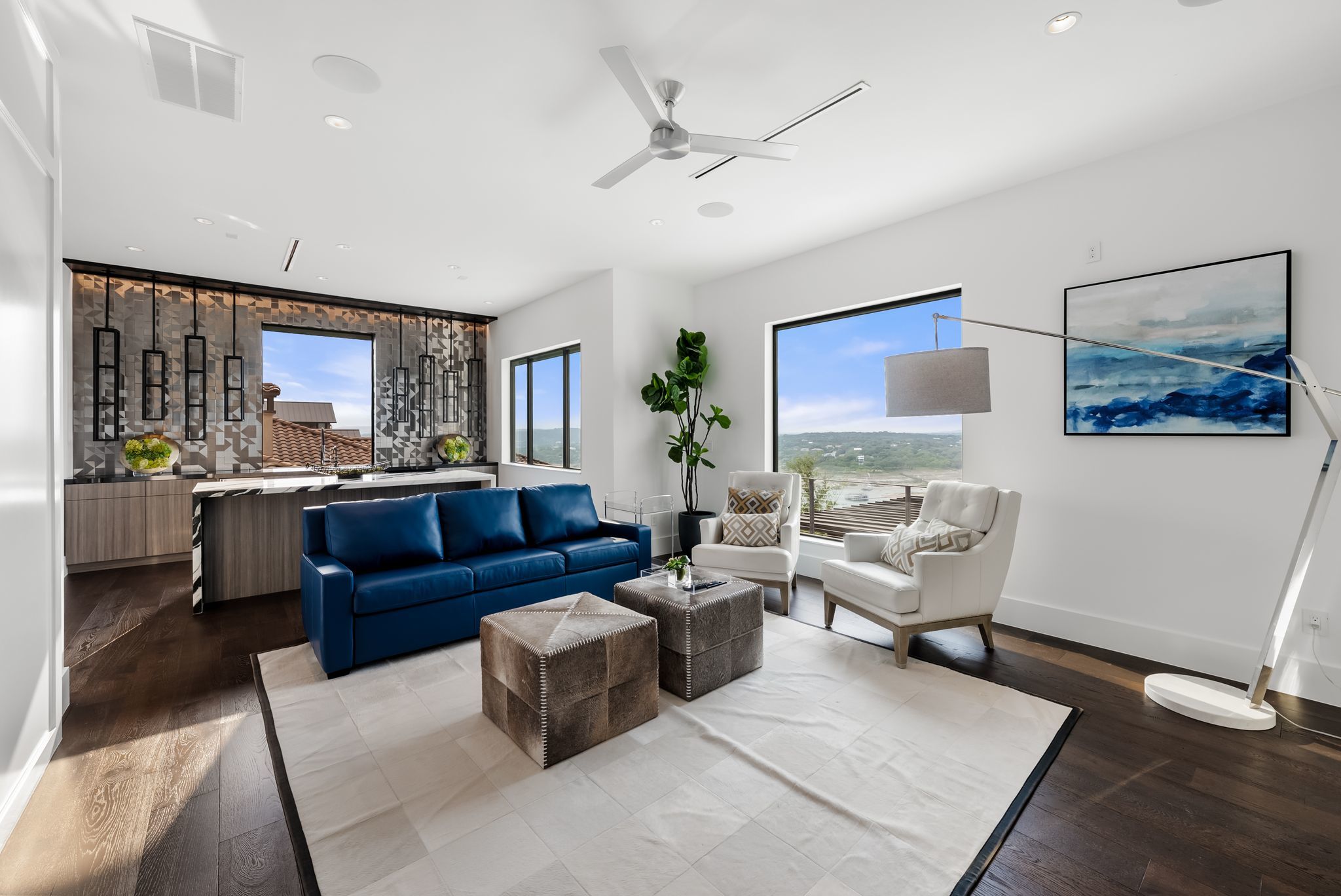 Enjoy luxury lakefront living at a fraction of the price of Lake Austin. Set on the deep waters of Lake Travis in Lago Vista, this striking modern estate rises nearly 80 feet above the shoreline, capturing sweeping panoramic views and unforgettable sunsets from nearly every room. A dramatic double floating staircase creates an unforgettable first impression, while walls of glass frame the lake and surrounding Hill Country. The marble wrapped kitchen flows seamlessly into the main living and entertaining areas, anchored by a glass enclosed wine cellar that makes a bold architectural statement. Each bedroom offers its own en suite bath and private balcony, providing comfort and privacy for family and guests. A dedicated game room, lounge with bar, custom illuminated closets, marble floors, and a distinctive four car garage complete the home. Designed for both luxury and peace of mind, the home is equipped with a whole house generator and hurricane shutters. Outside, the pool and spa overlook the water, and a private tram leads to a two story dock with boat lift and dual jet ski ports for effortless days on the lake. Extensively upgraded, this residence is move in ready. Furniture and boat may be purchased separately, offering the opportunity for a fully turn key lakefront experience.