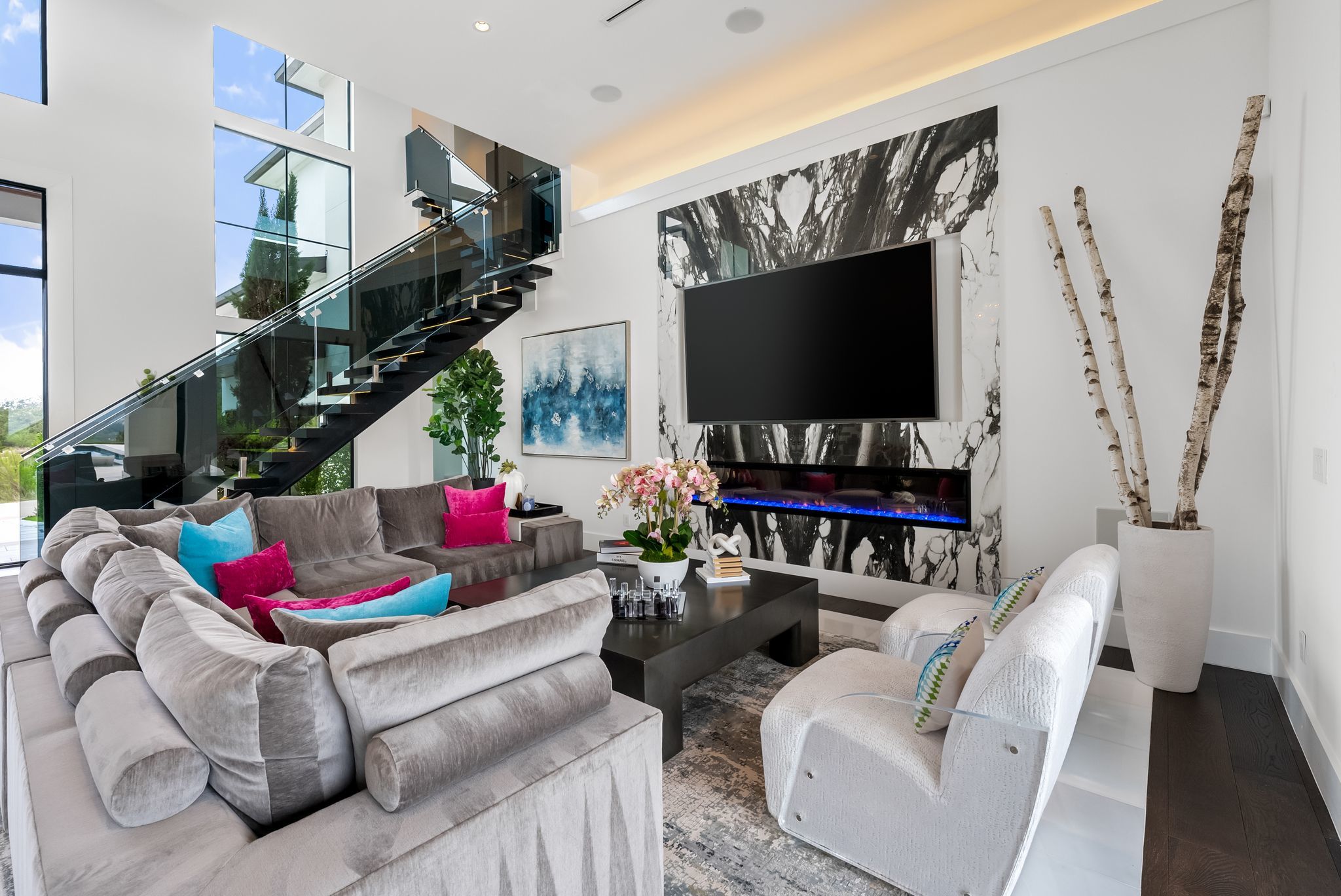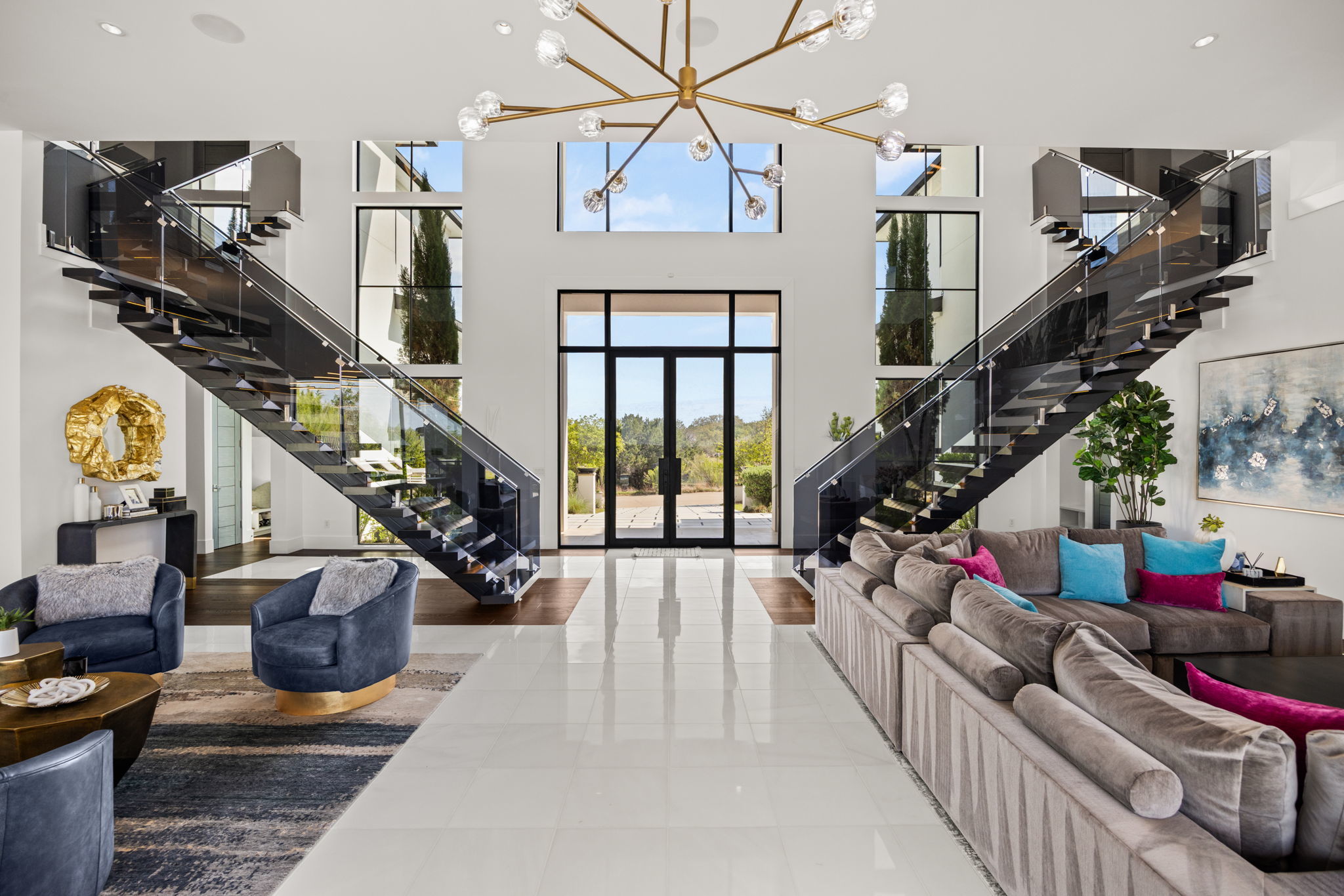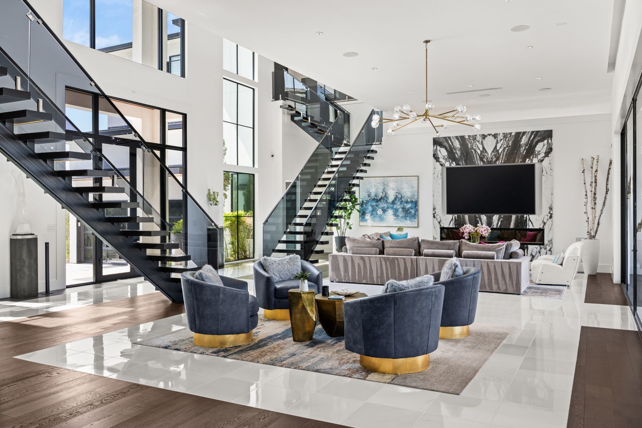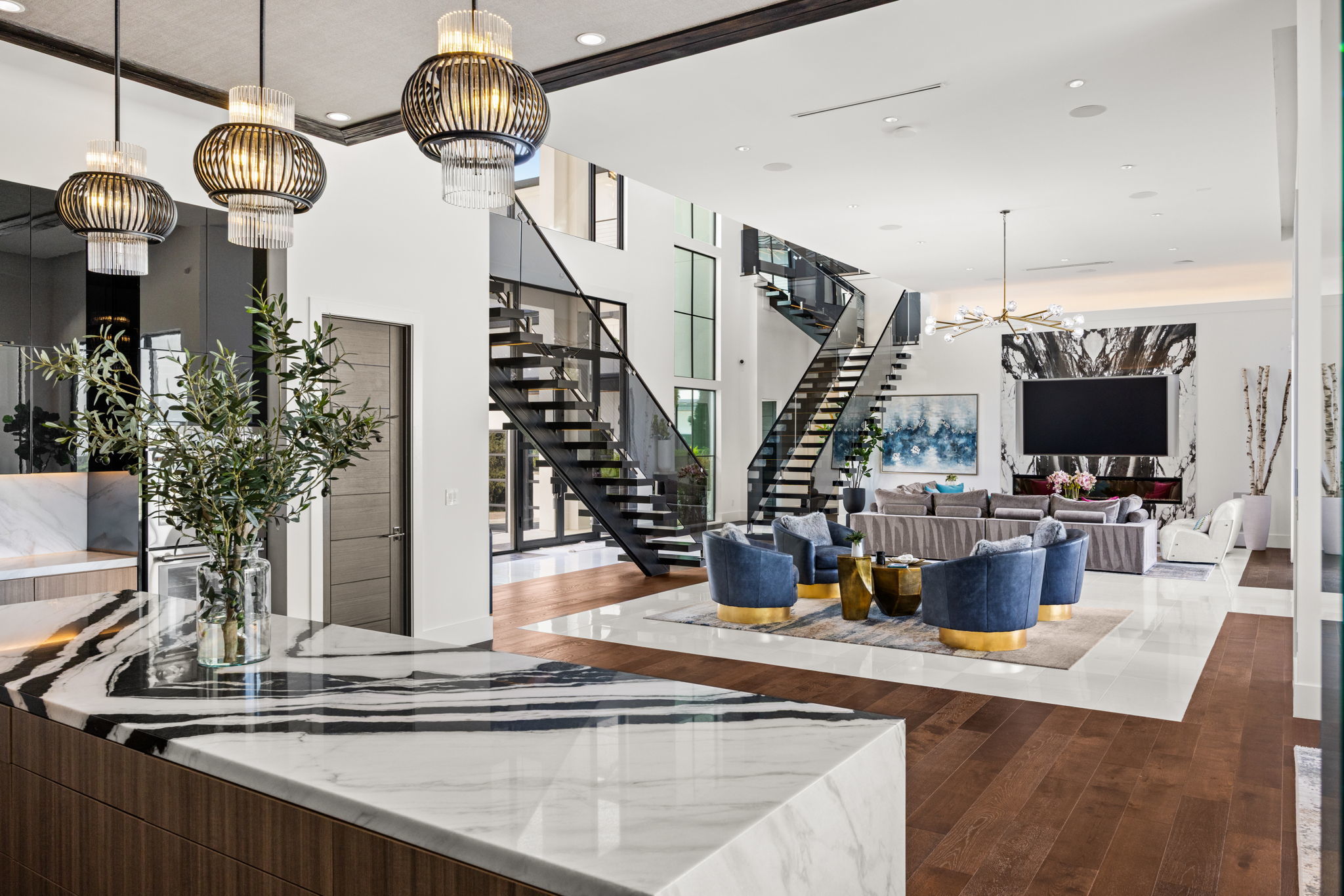 Enjoy luxury lakefront living at a fraction of the price of Lake Austin. Set on the deep waters of Lake Travis in Lago Vista, this striking modern estate rises nearly 80 feet above the shoreline, capturing sweeping panoramic views and unforgettable sunsets from nearly every room. A dramatic double floating staircase creates an unforgettable first impression, while walls of glass frame the lake and surrounding Hill Country. The marble wrapped kitchen flows seamlessly into the main living and entertaining areas, anchored by a glass enclosed wine cellar that makes a bold architectural statement. Each bedroom offers its own en suite bath and private balcony, providing comfort and privacy for family and guests. A dedicated game room, lounge with bar, custom illuminated closets, marble floors, and a distinctive four car garage complete the home. Designed for both luxury and peace of mind, the home is equipped with a whole house generator and hurricane shutters. Outside, the pool and spa overlook the water, and a private tram leads to a two story dock with boat lift and dual jet ski ports for effortless days on the lake. Extensively upgraded, this residence is move in ready. Furniture and boat may be purchased separately, offering the opportunity for a fully turn key lakefront experience.