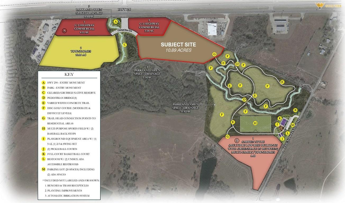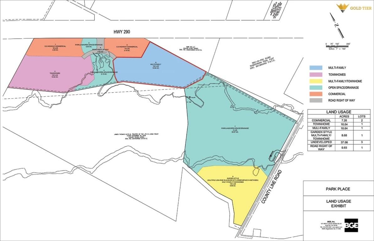 Gold Tier Real Estate is proud to present a ±10.89-acre, fully entitled multi-family development site along Highway 290 in Elgin, Texas. With utilities and road infrastructure being delivered by the seller—and an approved Development Agreement already in place—this tract offers a true turn-key opportunity for a garden-style multi-family developer. The property is zoned for up to 300 units, and a conceptual site plan reflecting 276 units is available for review. As part of the master development, the seller is constructing a new City of Elgin park and nature-trail hiking center that will sit directly adjacent to the site, providing a high-value amenity for future residents. Neighboring development continues to enhance the area’s long-term appeal: DR Horton is developing townhomes on the western parcel. Huntington Properties is delivering new, high-traffic retail along the Highway 290 commercial pads. **Broker does not warrant the accuracy of any information provided. Buyer is to conduct their independent due diligence.**