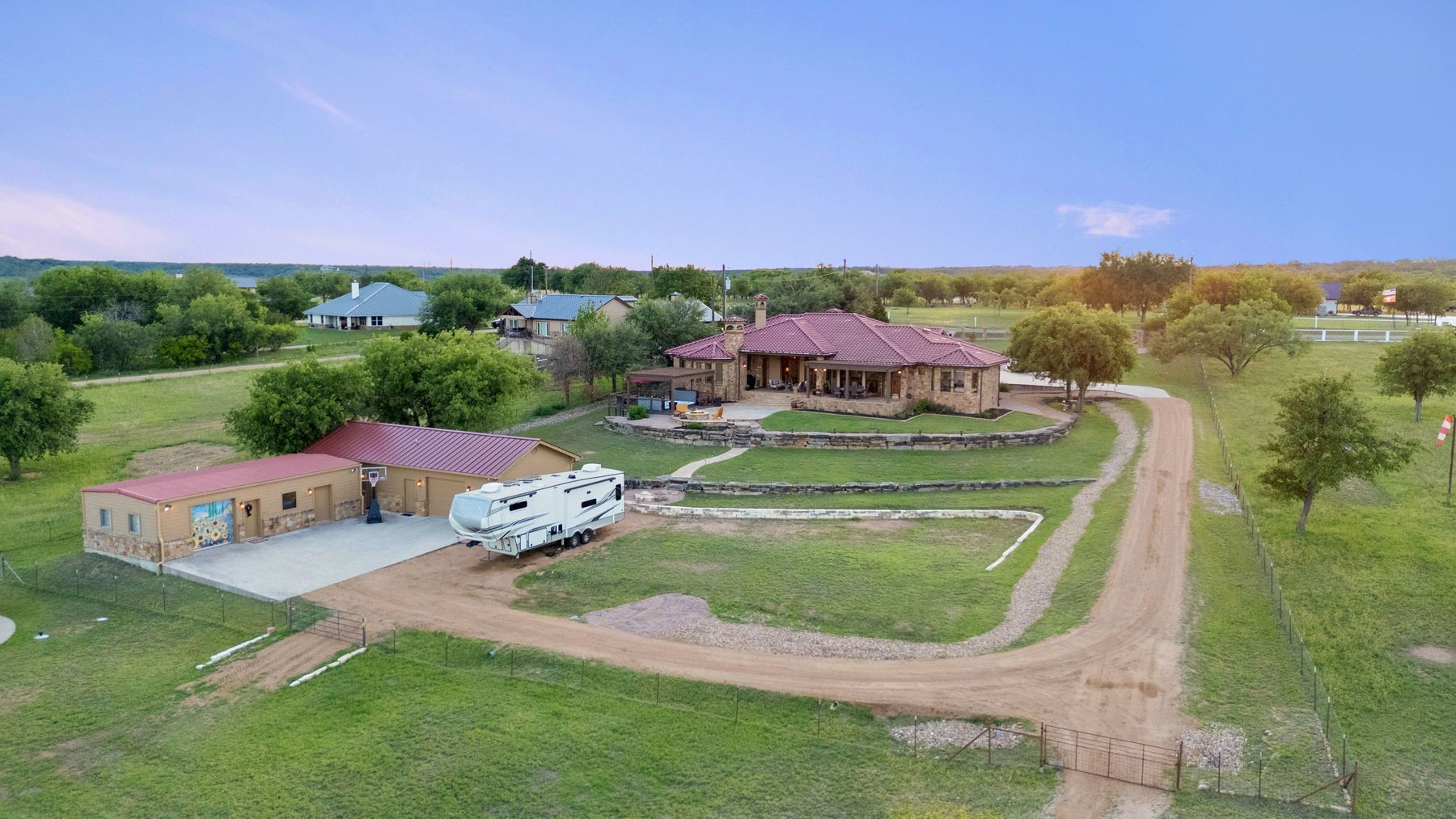 Villa La Vita e’ Bella – Gated Waterfront Escape on 5 Acres with Ag Exemption Welcome to House of the Good Life, a rare, private gated waterfront estate where 318 feet of shoreline, panoramic water views, and unforgettable sunsets create an extraordinary setting for refined living and effortless entertaining, all complemented by a remarkably low 1.3233% agricultural exempt tax rate. Set on 5 pristine, park-like acres within an exclusive gated community, this Mediterranean-inspired sanctuary offers an exceptional blend of luxury, serenity, and lifestyle amenities. Ideally positioned for both seclusion and convenience, with easy access to Marble Falls, Lago Vista, Liberty Hill, Cedar Park, and Leander. The 5,611 square foot property reflects timeless architecture and relaxed elegance with 5 bedrooms, featuring three fireplaces, expansive living areas, and seamless indoor–outdoor flow. A chef's kitchen anchors the home, opening to generous gathering spaces designed for entertaining on any scale. Walls of windows capture breathtaking lake and landscape vistas, while a brand-new 2025 roof adds lasting peace of mind. Outdoors, the covered patio invites year-round enjoyment, from tranquil Hill Country mornings to sunset evenings, enhanced by an impressive 18-ft, 2,000-gallon swim spa. Complementing the main home, a charming 2-bedroom guest house includes a temperature-controlled wine room and a versatile bonus space currently serving as an art studio — ideal for creative pursuits, a gym, or private office. An additional powered workshop supports hobbies, projects, or storage. Designed for both recreation and functionality, the grounds feature dual water sources, EV connection, RV hookup, and a private air-conditioned boathouse with boat lift and jet ski ramp. With expansive acreage, significant waterfront, and ag-exempt status supported by grazing Longhorns, this one-of-a-kind estate invites you to live beautifully and experience the good life.