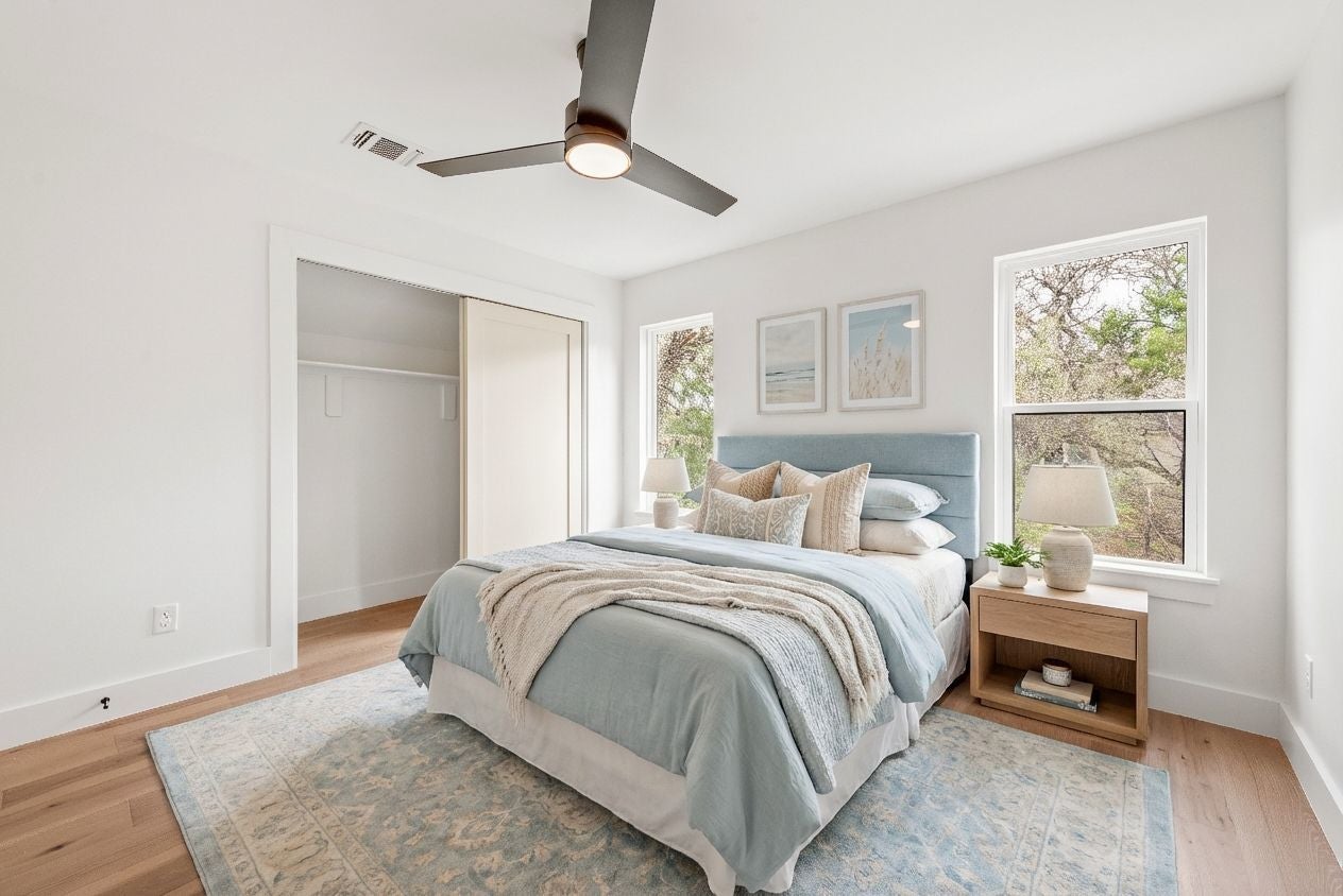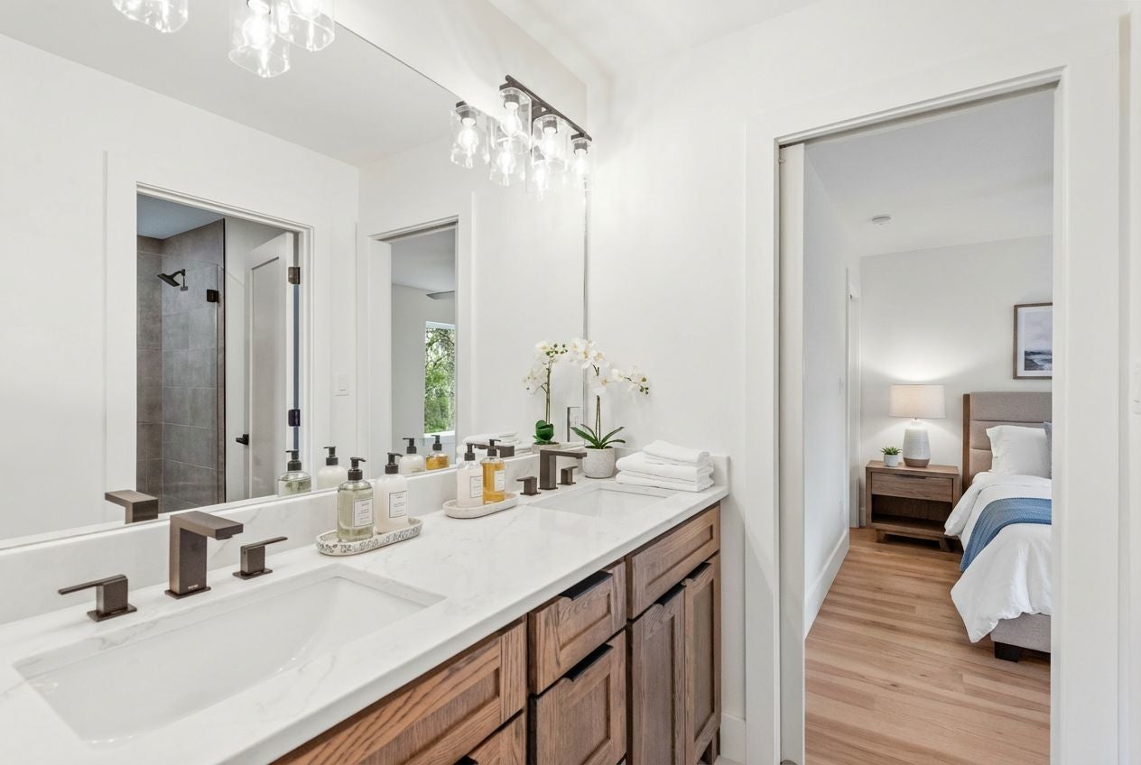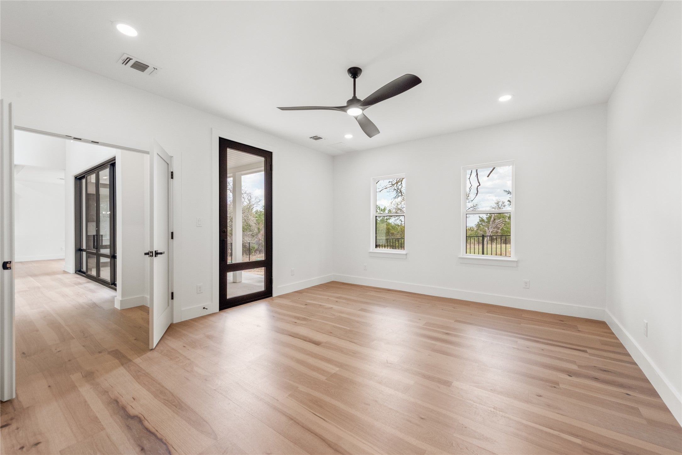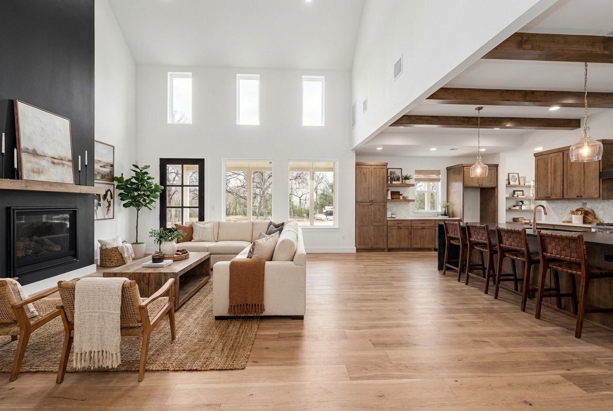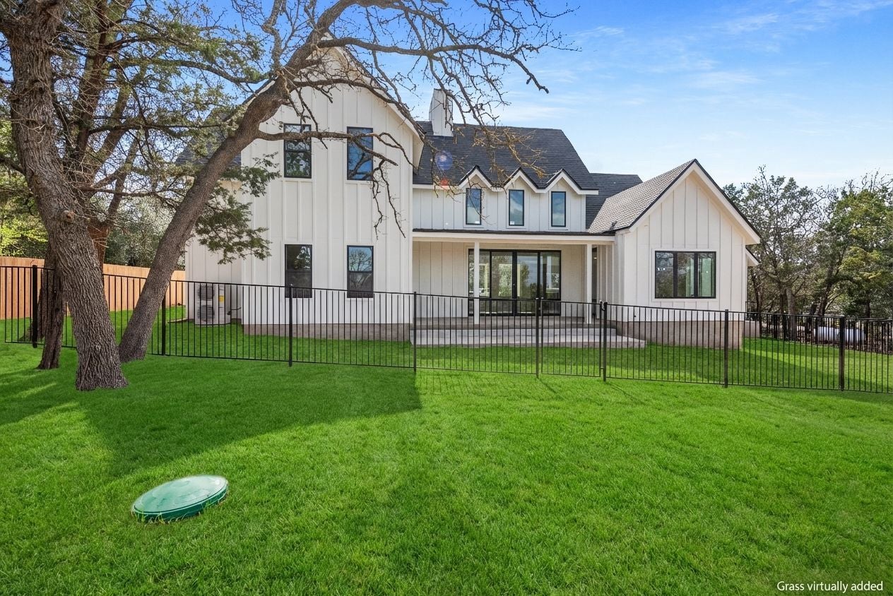 This home is an invitation to live your best life, where craftsmanship, privacy, and lifestyle converge in the sought-after Radiance community within highly rated DSISD. Set on a private 0.6-acre cul-de-sac lot backing to a greenbelt, this exceptional residence blends serenity with timeless modern farmhouse Hill Country design. The peaceful setting, beautiful post oak trees, durable 30-year shingle roof, Hardiplank exterior, and inviting front porch immediately set the tone. Step through the custom steel front door and discover elevated architectural details including soaring 20+ ft vaulted ceilings, 14-ft sliding doors for seamless indoor-outdoor living, designer lighting, and striking white oak beams that bring warmth and character throughout. Built with quality and efficiency in mind, the home features spray foam insulation, two high-efficiency 18-SEER mini-split units, custom steel doors, induction cooktop, and an electric fireplace. At the heart of the home, the chef’s kitchen is both functional and stunning, featuring Forno appliances, a massive black leather waterfall granite island, quartz backsplash, white oak cabinetry and beams, and an oversized pantry. The breakfast bar and dining area provide ample space for everyday living and grand-scale entertaining. The family room showcases engineered hickory hardwood floors, abundant natural light, soaring ceilings, and a beautiful fireplace wall that anchors the space. The primary suite is a private retreat with greenbelt views, patio access, dual closets, and a spa-inspired bath with a freestanding tub, dual vanities, and an expansive walk-in shower with standard and rainfall showerheads. Secondary bedrooms and baths are equally spacious and well appointed. A versatile flex room can serve as a media room, office, gym, or game room. A rare combination of land, privacy, and craftsmanship—just minutes from Dripping Springs and about 30 minutes to downtown Austin.
