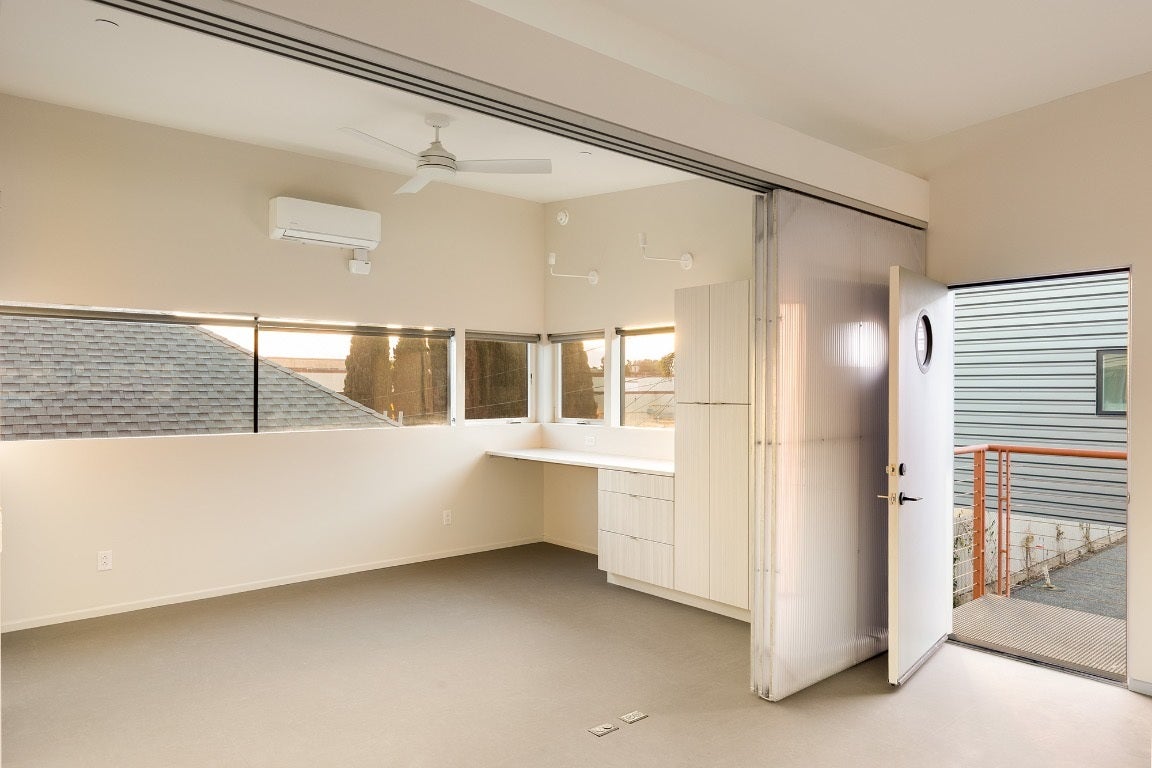 Richard Orne, Architect | Garden Street Studios | Live/Work Art Compound (Dual Zoning) Escape the pressures of big-city life at this unique live/work art compound less than a mile from the beach in downtown Ventura. Near the junction of Main Street and Ventura Avenue, the property sits close to restaurants, boutiques, parks, and trails that define the city’s easygoing charm. Bike paths run along the coast and inland toward Ojai and Pine Mountain. It’s a place where parking is simple, the pace slows, and friendly greetings are part of daily life. On a quiet two-block street with no through traffic—surrounded by residential, commercial, studios, and light industry—this is an inviting setting for creative living and working. Zoned for both commercial and residential use, four separate structures allow wide flexibility. The compound can act as a distinctive single-family alternative with four bedrooms, four bathrooms, and three additional studios with powder rooms, or operate as an income property with individual utility metering and potential for up to seven tenants. All units will be delivered vacant. As a commercial asset, the spaces can serve storefront, office, creative, fabrication, or retail purposes. Architecturally, the environment is striking: a renovated 1920s bungalow anchors the rear, while three newer stand-alone buildings front the site, each pairing an upper one-bedroom with a ground-floor studio. Landscaped courtyards connect the structures. Cantilevered forms, exposed steel, corrugated metal, and ribbon windows echo Case Study inspirations. Inside, a restrained palette includes sliding polycarbonate panels, polished concrete and Marmoleum floors, and operable windows framing views of nearby hills and winter snowcaps. The bungalow features board-and-batten siding, cork floors, new finishes, covered decks, and French doors opening to a private patio. 4 Addresses, 7 Units 4 Bedrooms, 3 Studios 7 Bathrooms 3,723 Square Feet 7,840 SF Lot