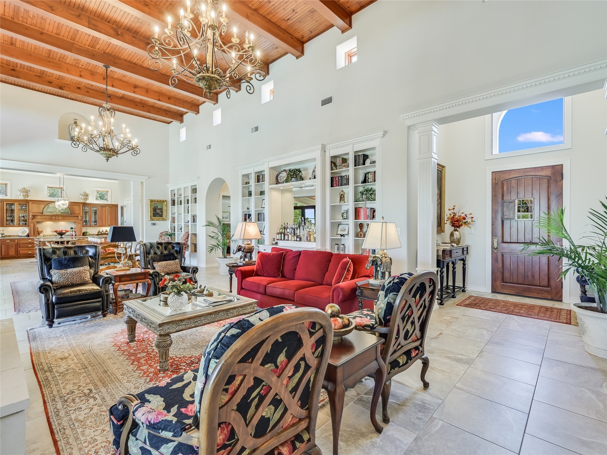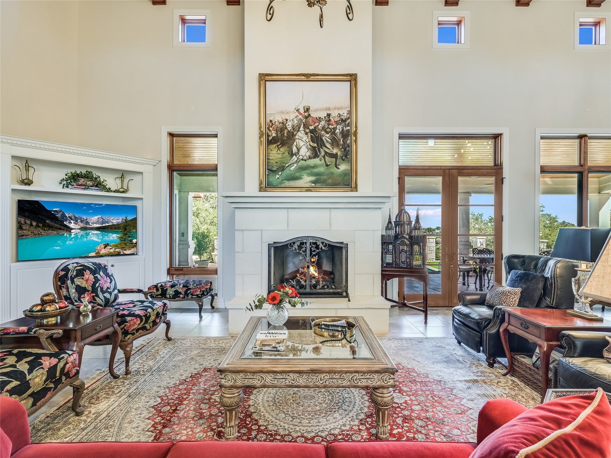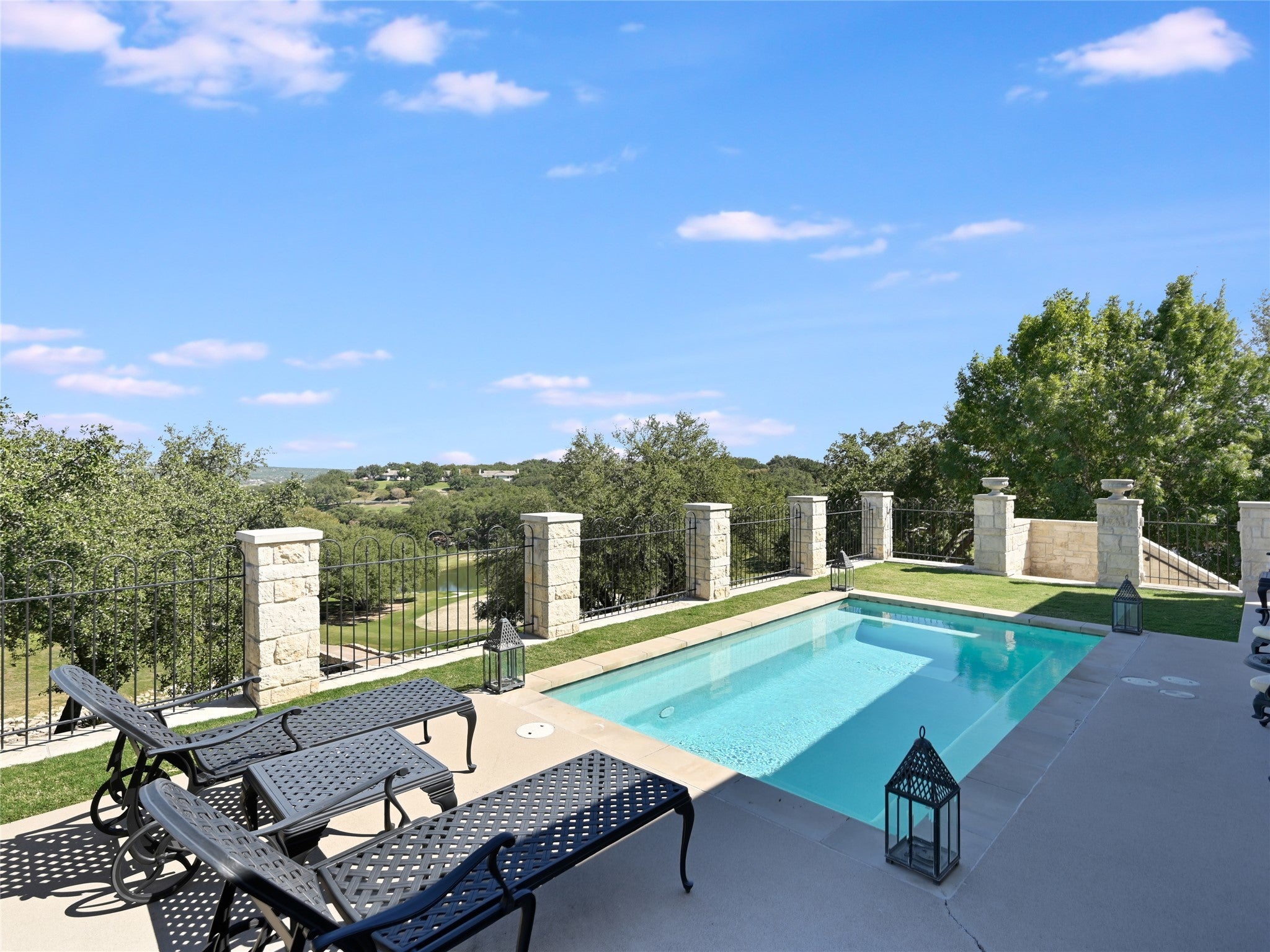 Discover luxury living in this opulent estate featuring a timeless stucco exterior with a rolled barrel clay tile roof. This inviting facade sets the stage for the grandeur inside. Rustic elegance is found in this Santa Barbara style single story, perched above the 11th signature hole viewing the stunning waterfall in the exclusive Barton Creek Lakeside. Spanning over 4129sf are 3 bedroom, 5 full bath, and 3 car garage with built-in storage on 2 sides, offering the perfect combination of fine living and functionality. The grand interiors immediately captivate. Upon entering, you are met with an expansive light filled great room, all open to the dining and kitchen area, boasting 18' high wood beams/wood ceiling, 2 stunning chandeliers, ceramic tile floors, laid in offset European fashion, and all overlooking the backyard living space, complete with a spacious covered 14'x44' patio with another fireplace, perfect for entertaining, and large gatherings. Relax in the pool or enjoy playing on the bocci court below. Perfectly appointed private owner's suite that offers 14' shuttered windows, gorgeous chandelier and a luxurious 14' in-suite complete bath with Jacuzzi tub, shower with a convenient connecting utility room. Massive library with 12' high ceilings, stone fireplace and lined with custom bookshelves, all taking in the views out back. The View! Serene setting looking out over the community below and hills beyond. This property was crafted for effortless living and exceptional entertaining. Located in the private country club community of Barton Creek Lakeside with an 18-hole Arnold Palmer designed golf course, Olympic size pool, fitness center, tennis/pickle ball courts and private club with dining. Golf and Social Membership are available. 24 hour guarded/gated main entry, Lake Travis access via private community boat launch with available boat slips for leased. 7 man-made lakes throughout the area with vast topography changes, make for this amazing setting.