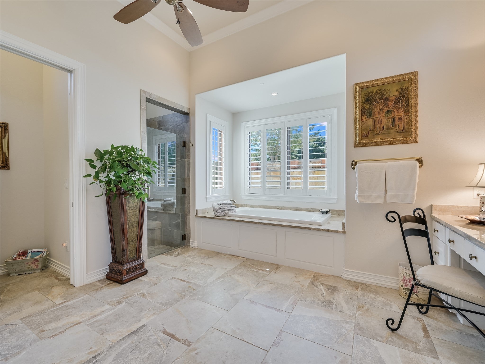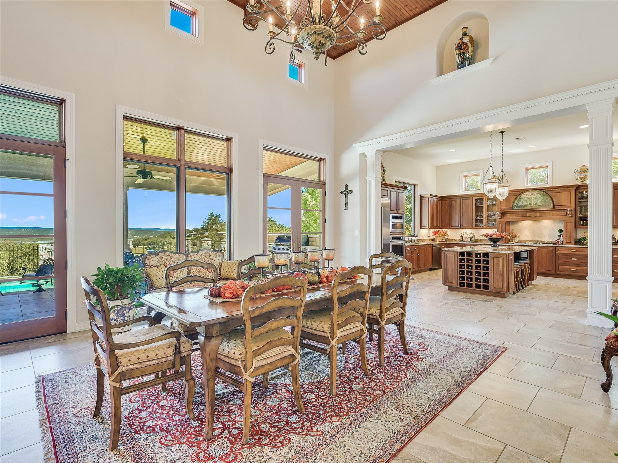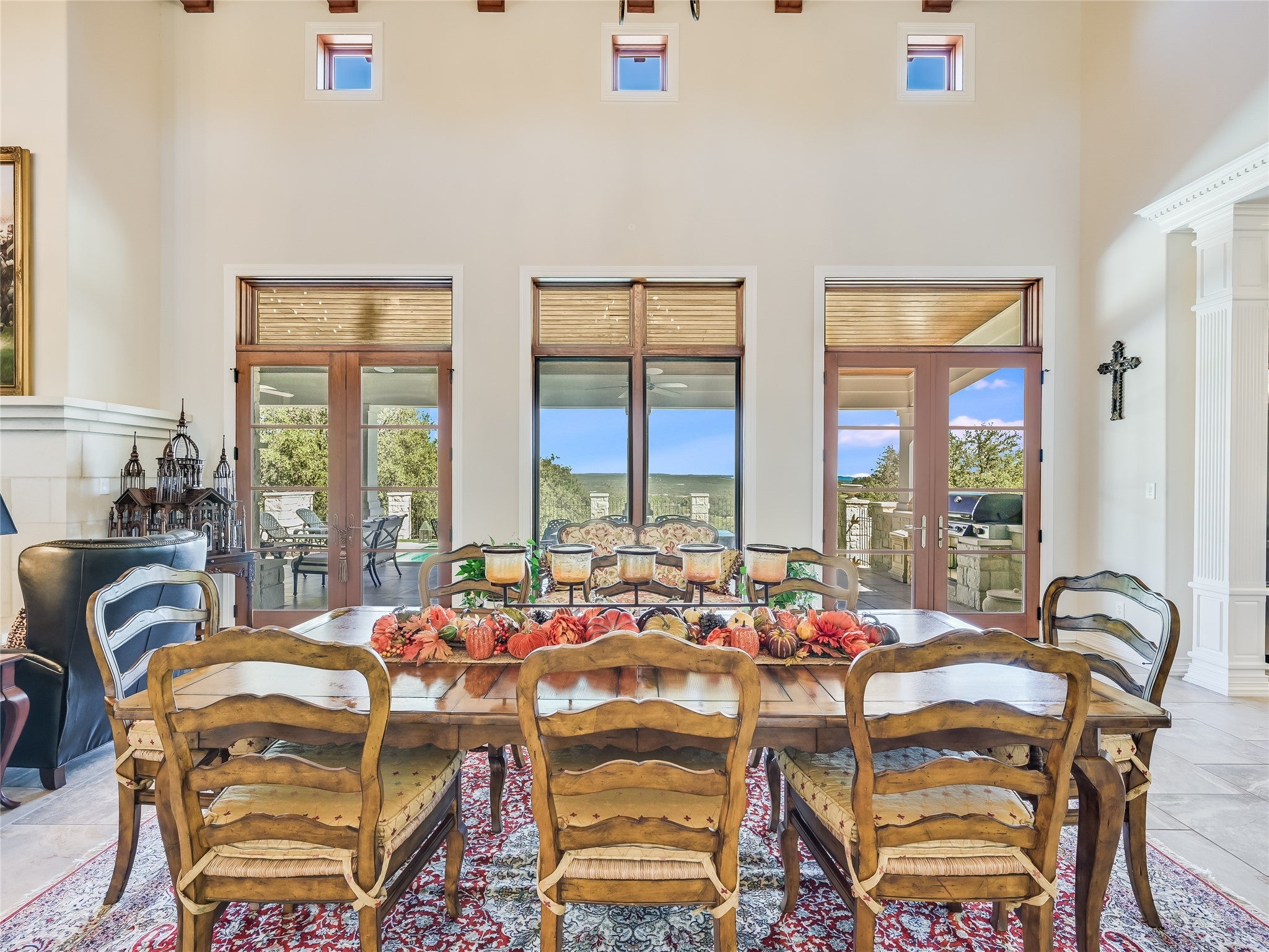 Discover luxury living in this opulent estate featuring a timeless stucco exterior with a rolled barrel clay tile roof. This inviting facade sets the stage for the grandeur inside. Rustic elegance is found in this Santa Barbara style single story, perched above the 11th signature hole viewing the stunning waterfall in the exclusive Barton Creek Lakeside. Spanning over 4129sf are 3 bedroom, 5 full bath, and 3 car garage with built-in storage on 2 sides, offering the perfect combination of fine living and functionality. The grand interiors immediately captivate. Upon entering, you are met with an expansive light filled great room, all open to the dining and kitchen area, boasting 18' high wood beams/wood ceiling, 2 stunning chandeliers, ceramic tile floors, laid in offset European fashion, and all overlooking the backyard living space, complete with a spacious covered 14'x44' patio with another fireplace, perfect for entertaining, and large gatherings. Relax in the pool or enjoy playing on the bocci court below. Perfectly appointed private owner's suite that offers 14' shuttered windows, gorgeous chandelier and a luxurious 14' in-suite complete bath with Jacuzzi tub, shower with a convenient connecting utility room. Massive library with 12' high ceilings, stone fireplace and lined with custom bookshelves, all taking in the views out back. The View! Serene setting looking out over the community below and hills beyond. This property was crafted for effortless living and exceptional entertaining. Located in the private country club community of Barton Creek Lakeside with an 18-hole Arnold Palmer designed golf course, Olympic size pool, fitness center, tennis/pickle ball courts and private club with dining. Golf and Social Membership are available. 24 hour guarded/gated main entry, Lake Travis access via private community boat launch with available boat slips for leased. 7 man-made lakes throughout the area with vast topography changes, make for this amazing setting.