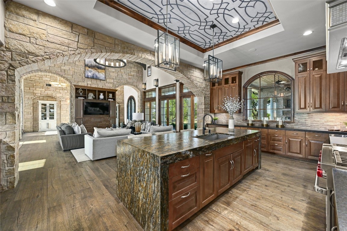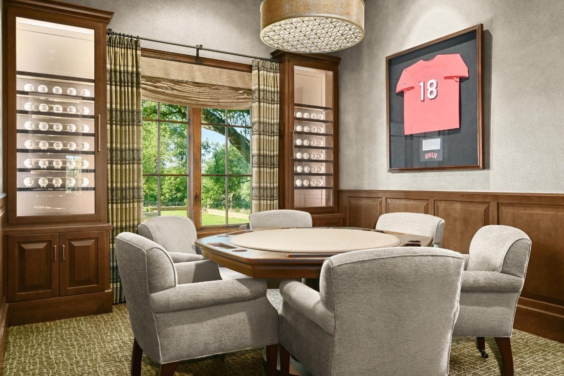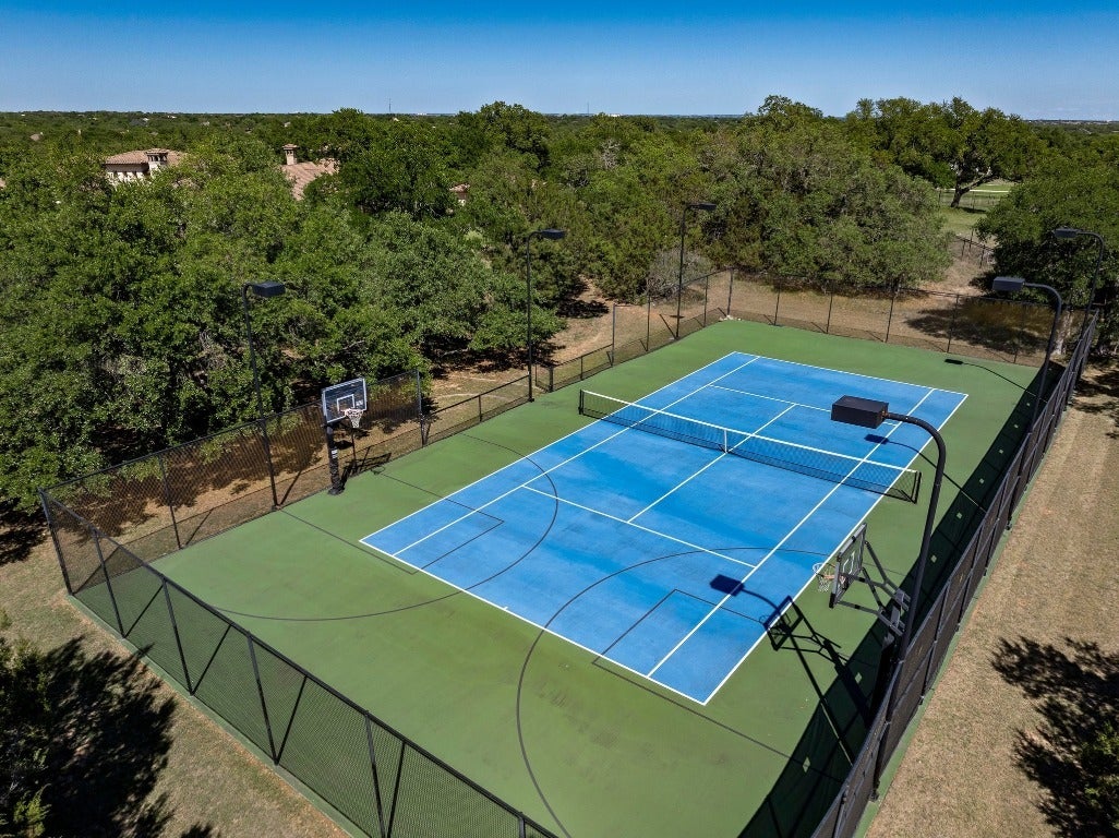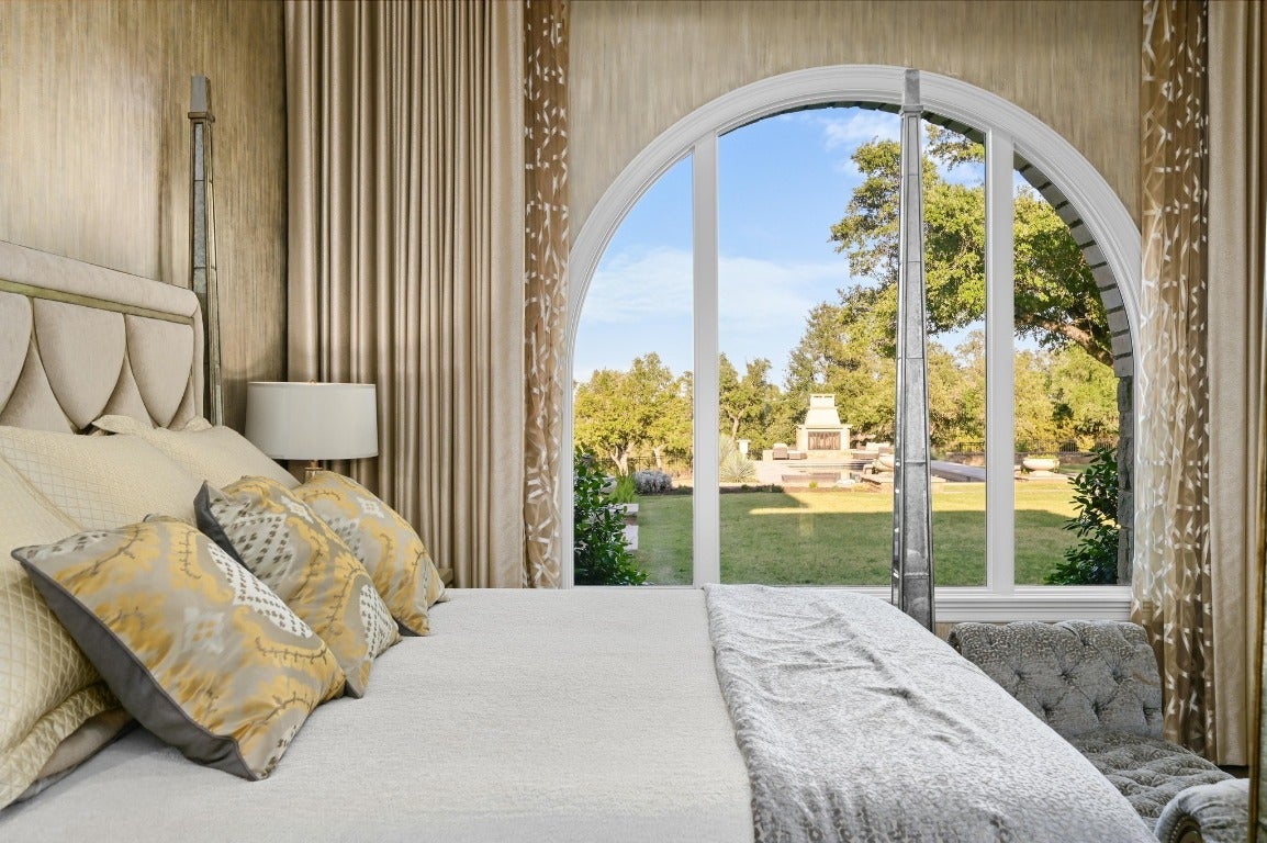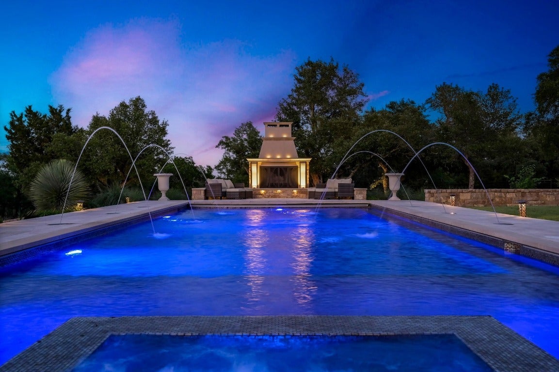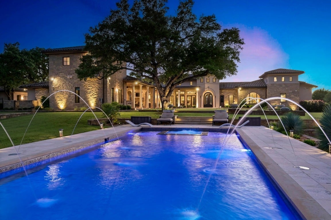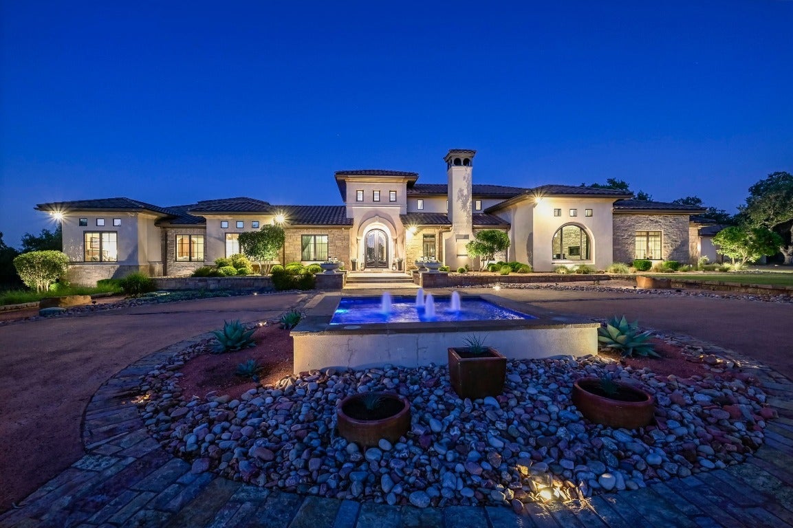 A Hill Country retreat suitable for Texas nobility! Timeless elegance meets impeccable craftsmanship. Built by Steve Richmond & designed by renowned Linda McCalla Interiors, perfection is everywhere. Situated on a grand ~6.7 acre estate, your level of expectation will be raised the moment the gate opens. Understated Texas landscapes invite you thru a grand entry that includes soaring 18-foot ceilings, Venetian plaster & artisan painted walls in multiple rooms. Natural light thru picture windows in public areas and private bedrooms create serene vistas, while world class cabinetry offers abundant storage throughout. Kitchen features leathered granite countertops with waterfall edges and a handcrafted tray ceiling-signed by a local artist...even a butler’s pantry with a sonic ice machine, built-in coffee maker, & refrigerator. Stone accents & arches add character throughout. The private primary suite has "Wow" views, & a brilliant 2-story “hers” closet boasts a spiral staircase, built-in security cabinetry, & private washer & dryer. Italian tile adorns guest & primary baths, as well as the kitchen backsplash, while handscraped Castle Comb wood floors & 8-foot solid doors add richness. The gameroom features custom etched concrete floors & a second kitchen with full-sized wine fridge. A private poker room includes built-in memorabilia/artwork cases & an additional room for a 2nd office or gym. An office includes custom built-ins & designer paint for an ideal workspace. Outside, a dual-sided fireplace warms the covered patio with outdoor kitchen & multiple seating areas. A pool & outdoor fireplace fit for royalty complete the ambiance. Sweeping Hill Country views, gorgeous outdoor living, & the convenience of being minutes from Lake Georgetown. Additional highlights include 2 private guest suites, circular driveway, fountain, 5 large garage spaces, stained-grade crown molding, & wood beams in perfect spots. Even an insulated shop & tennis/sport court on site.