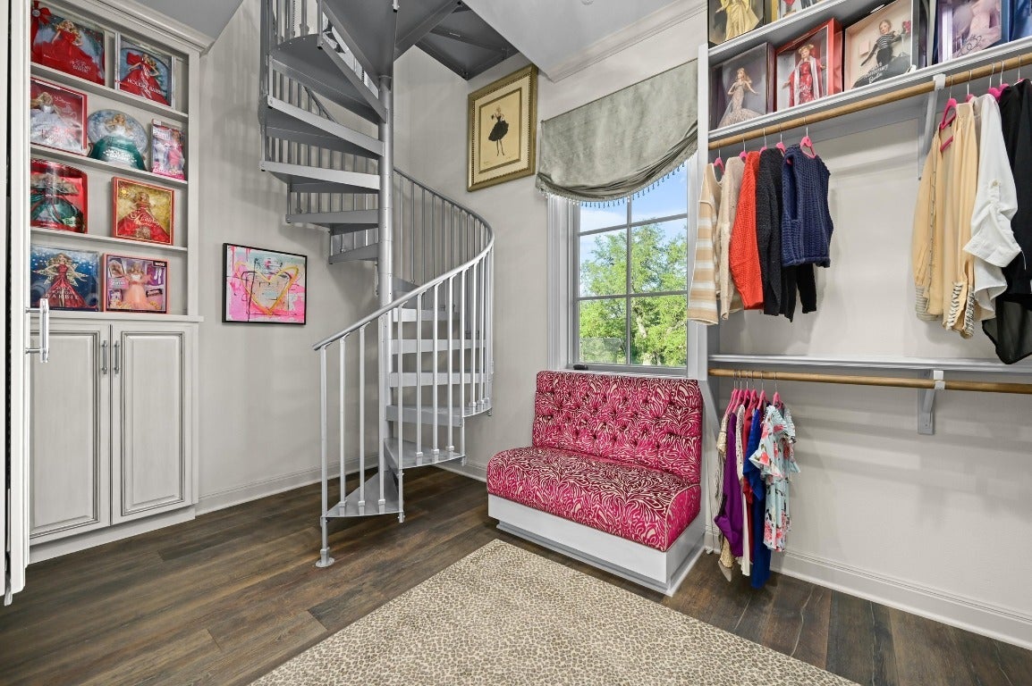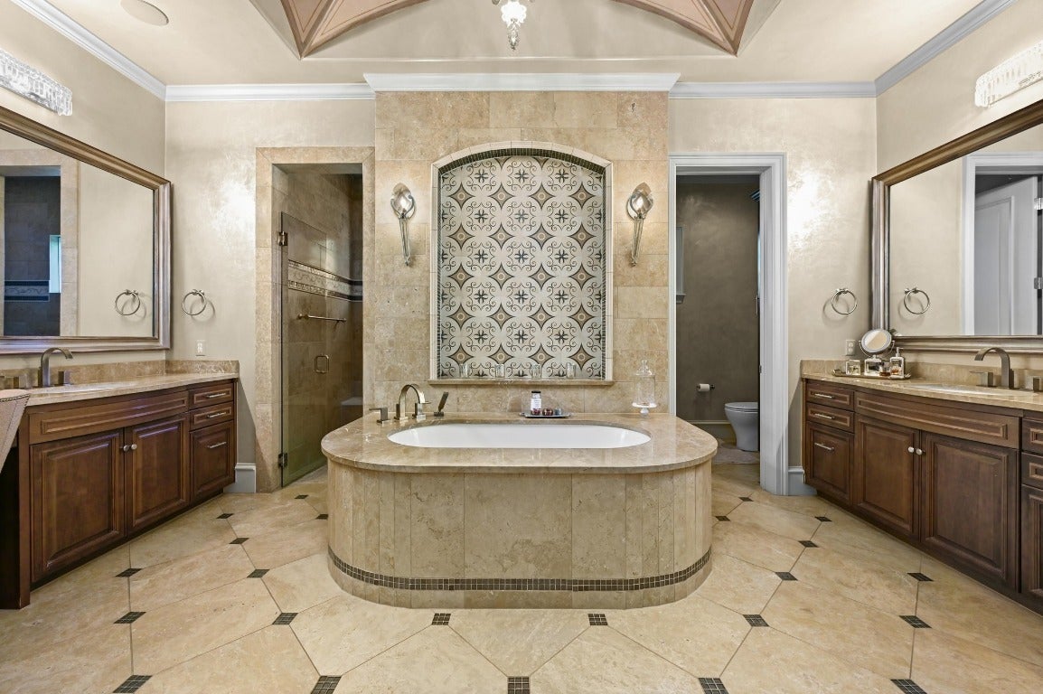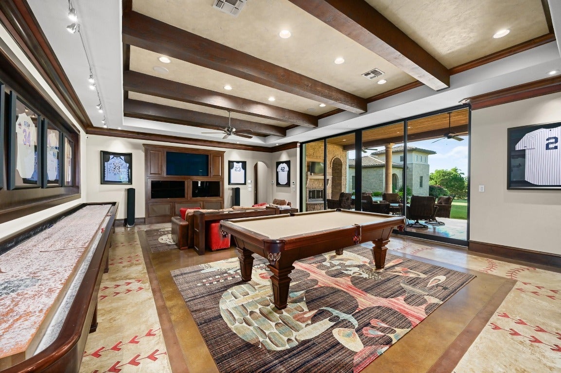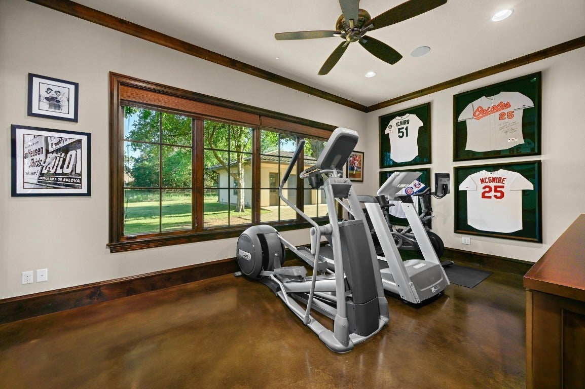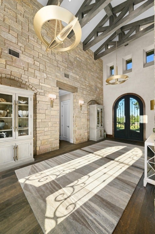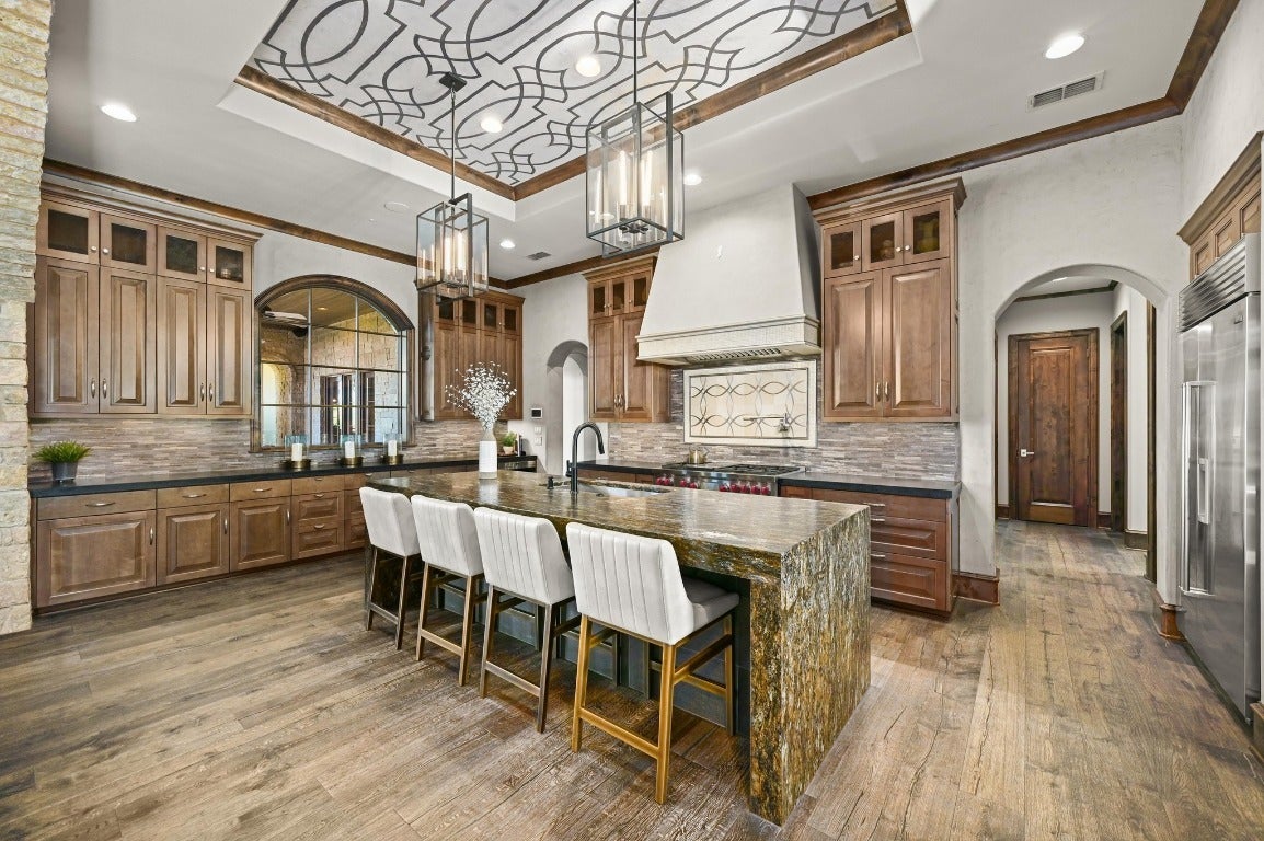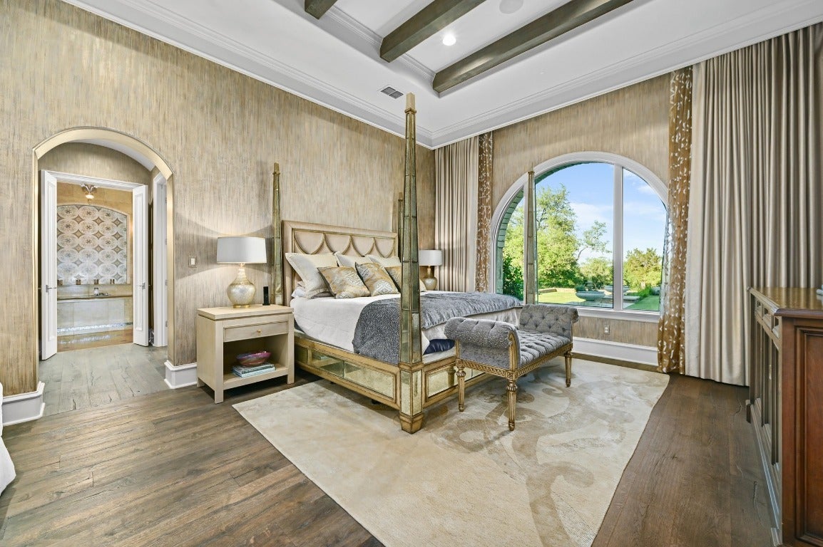 A Hill Country retreat suitable for Texas nobility! Timeless elegance meets impeccable craftsmanship. Built by Steve Richmond & designed by renowned Linda McCalla Interiors, perfection is everywhere. Situated on a grand ~6.7 acre estate, your level of expectation will be raised the moment the gate opens. Understated Texas landscapes invite you thru a grand entry that includes soaring 18-foot ceilings, Venetian plaster & artisan painted walls in multiple rooms. Natural light thru picture windows in public areas and private bedrooms create serene vistas, while world class cabinetry offers abundant storage throughout. Kitchen features leathered granite countertops with waterfall edges and a handcrafted tray ceiling-signed by a local artist...even a butler’s pantry with a sonic ice machine, built-in coffee maker, & refrigerator. Stone accents & arches add character throughout. The private primary suite has "Wow" views, & a brilliant 2-story “hers” closet boasts a spiral staircase, built-in security cabinetry, & private washer & dryer. Italian tile adorns guest & primary baths, as well as the kitchen backsplash, while handscraped Castle Comb wood floors & 8-foot solid doors add richness. The gameroom features custom etched concrete floors & a second kitchen with full-sized wine fridge. A private poker room includes built-in memorabilia/artwork cases & an additional room for a 2nd office or gym. An office includes custom built-ins & designer paint for an ideal workspace. Outside, a dual-sided fireplace warms the covered patio with outdoor kitchen & multiple seating areas. A pool & outdoor fireplace fit for royalty complete the ambiance. Sweeping Hill Country views, gorgeous outdoor living, & the convenience of being minutes from Lake Georgetown. Additional highlights include 2 private guest suites, circular driveway, fountain, 5 large garage spaces, stained-grade crown molding, & wood beams in perfect spots. Even an insulated shop & tennis/sport court on site.