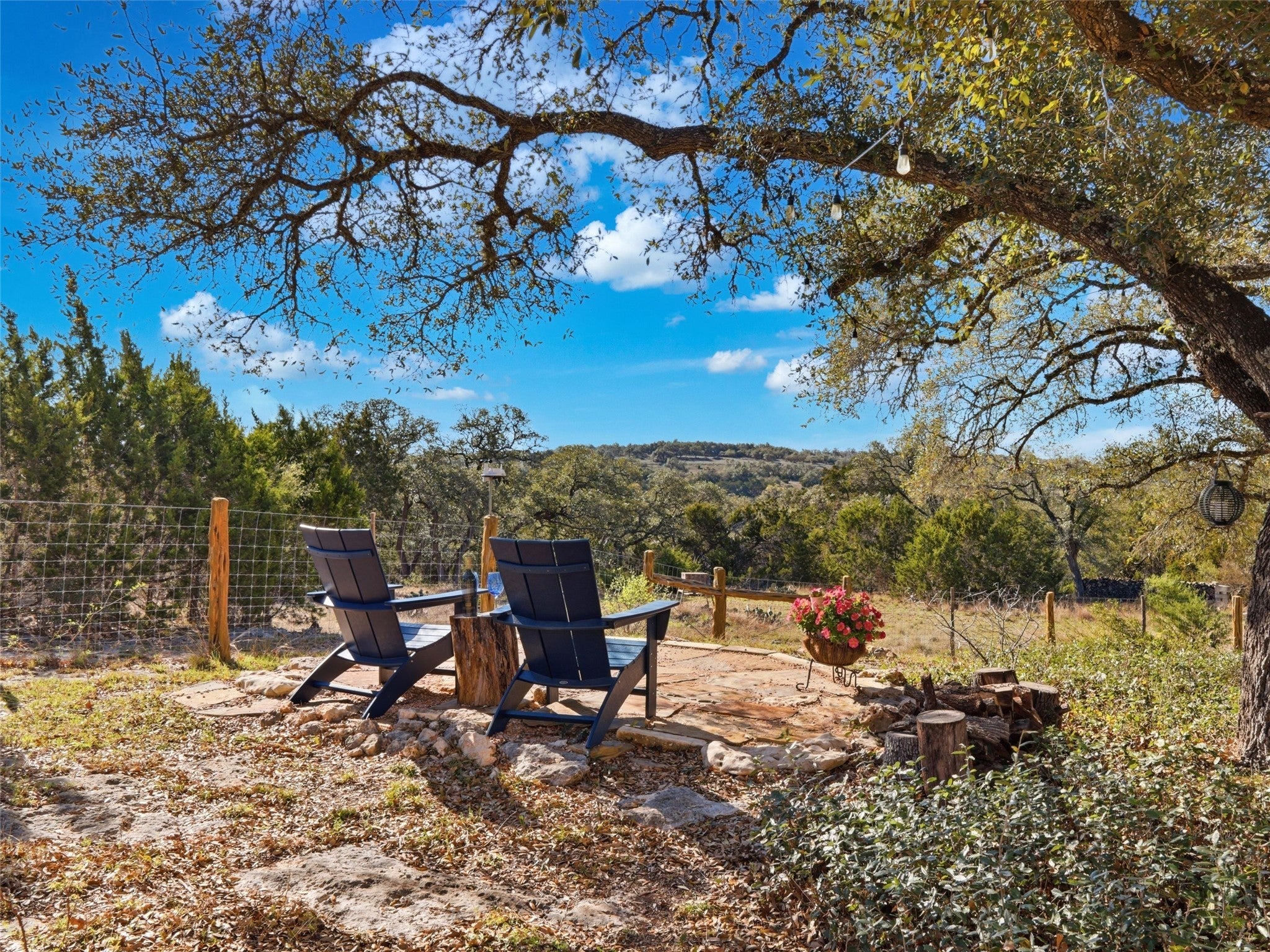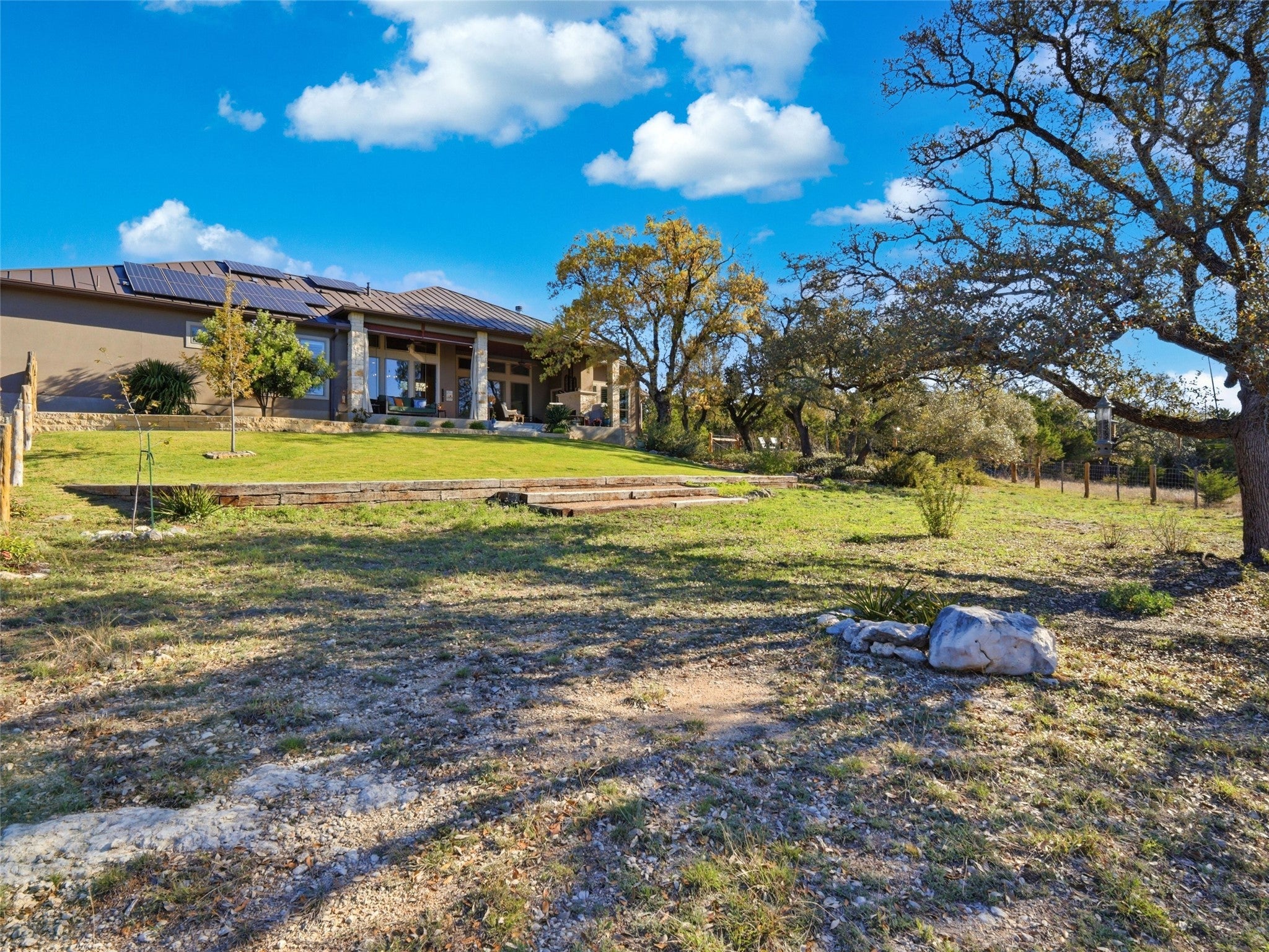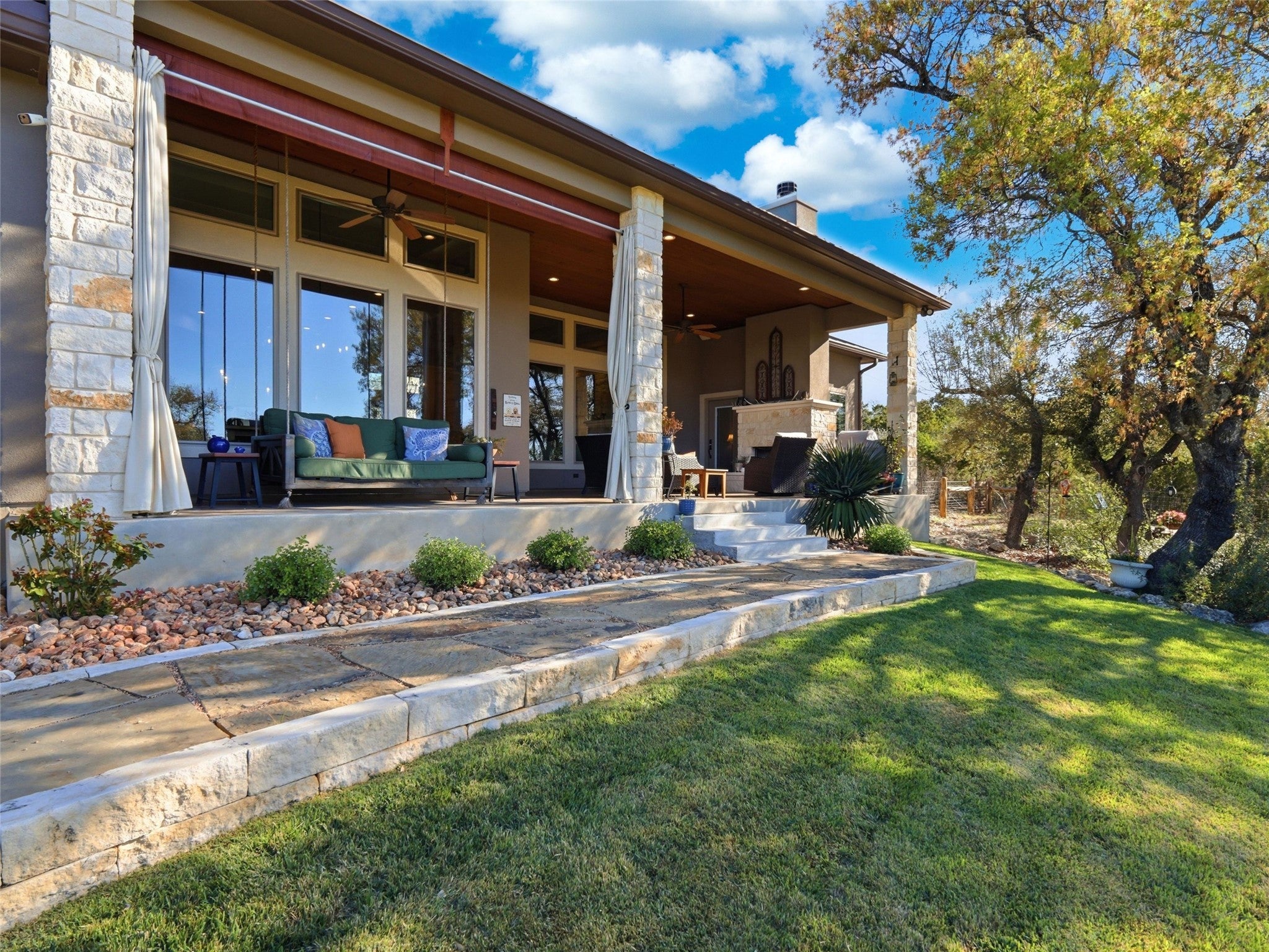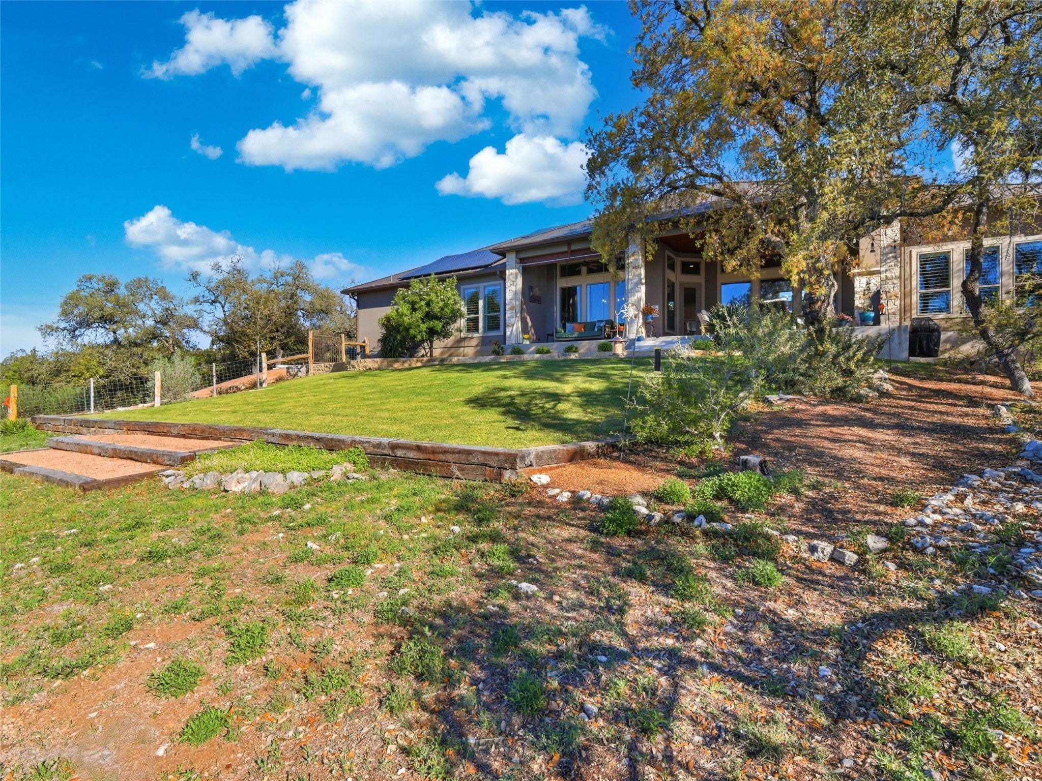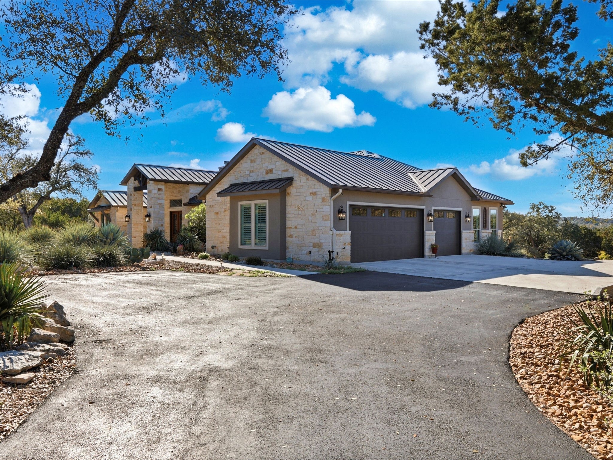 Perched along a scenic ridgeline and nestled privately within 5 serene acres, this custom-built Hill Country retreat offers breathtaking views, abundant wildlife, and exceptional privacy. The home showcases beautiful finishes throughout, including quartz countertops and plantation shutters, while expansive windows fill the interior with natural light and frame the surrounding Hill Country landscape. The spacious covered back patio with outdoor fireplace extends the living space outdoors - an ideal setting for morning coffee as the sun rises over the hills, relaxed evenings by the fire, and gatherings with friends while watching deer and native wildlife. The professionally xeriscaped grounds feature native plants that complement the natural setting while providing low-maintenance beauty. Additional features include a 3 car garage with one bay configured as a workshop, a detached 20 x 26 detached building with carport, fenced backyard, standing seam metal roof, solar panels and a 26 kw generator for efficiency and peace of mind. Properties offering this level of privacy, views, and thoughtful design are rare - come and experience the beauty and tranquility of Hill Country living for yourself.