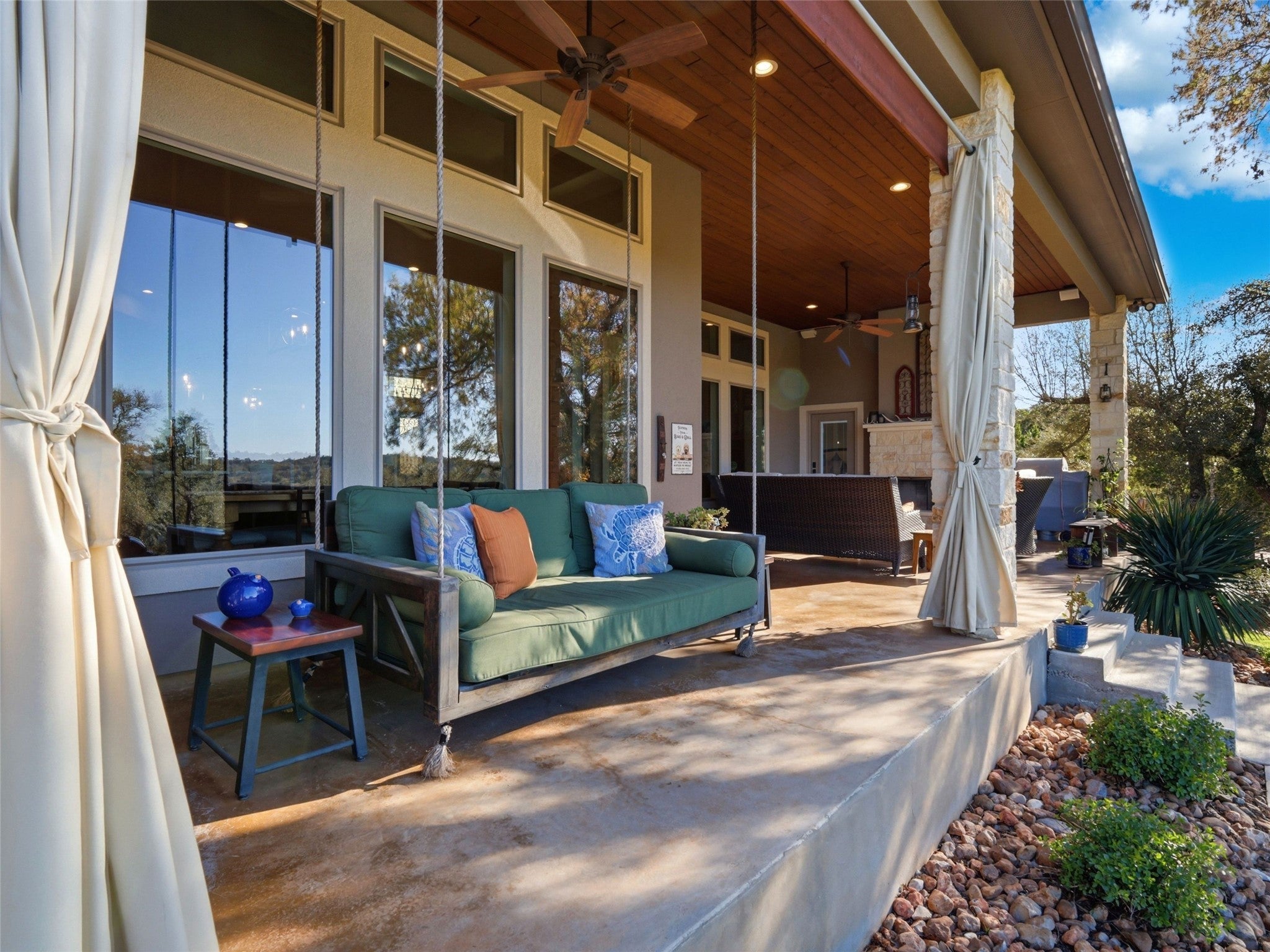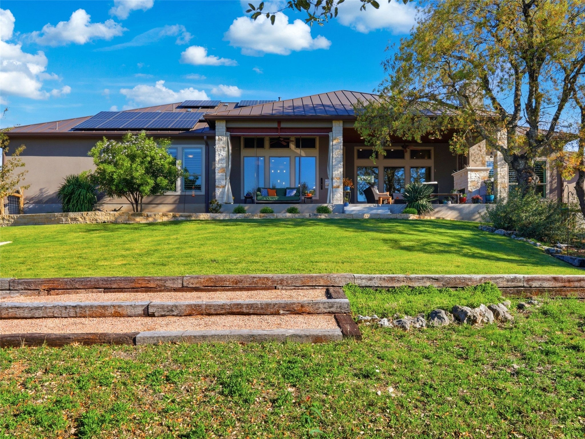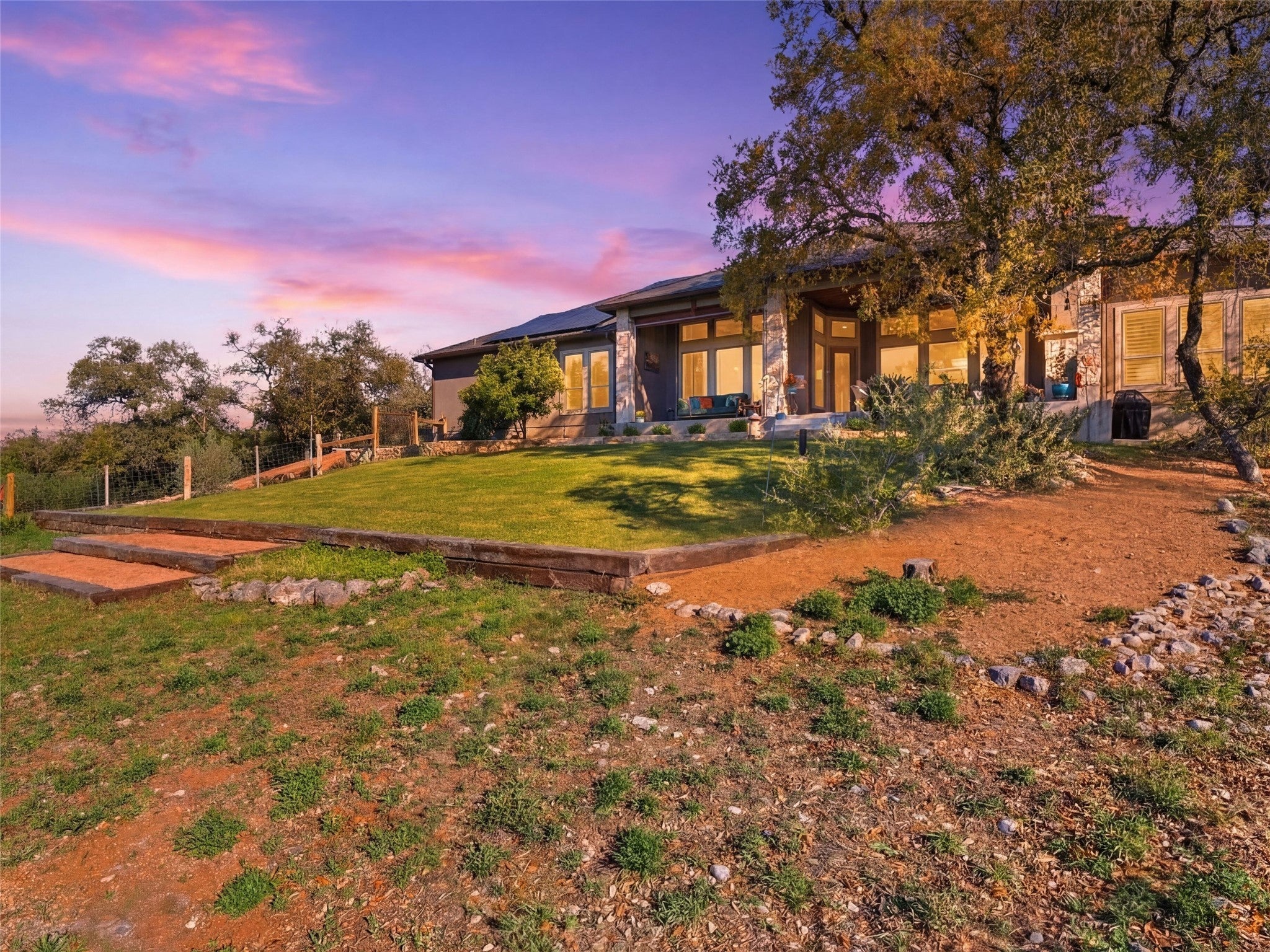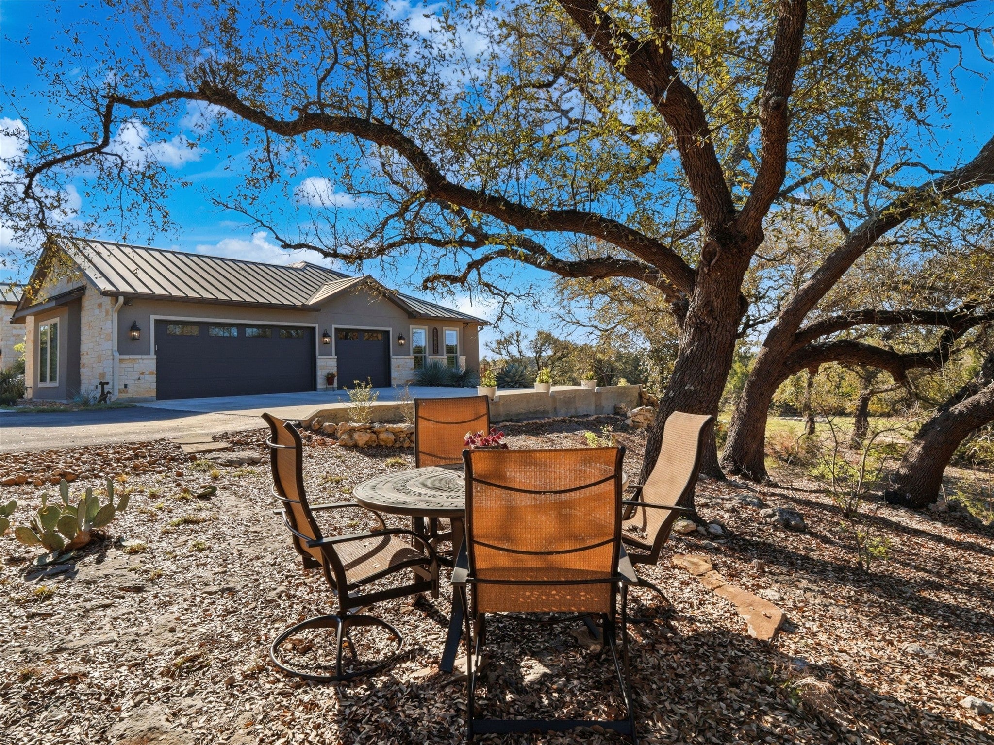 Perched along a scenic ridgeline and nestled privately within 5 serene acres, this custom-built Hill Country retreat offers breathtaking views, abundant wildlife, and exceptional privacy. The home showcases beautiful finishes throughout, including quartz countertops and plantation shutters, while expansive windows fill the interior with natural light and frame the surrounding Hill Country landscape. The spacious covered back patio with outdoor fireplace extends the living space outdoors - an ideal setting for morning coffee as the sun rises over the hills, relaxed evenings by the fire, and gatherings with friends while watching deer and native wildlife. The professionally xeriscaped grounds feature native plants that complement the natural setting while providing low-maintenance beauty. Additional features include a 3 car garage with one bay configured as a workshop, a detached 20 x 26 detached building with carport, fenced backyard, standing seam metal roof, solar panels and a 26 kw generator for efficiency and peace of mind. Properties offering this level of privacy, views, and thoughtful design are rare - come and experience the beauty and tranquility of Hill Country living for yourself.