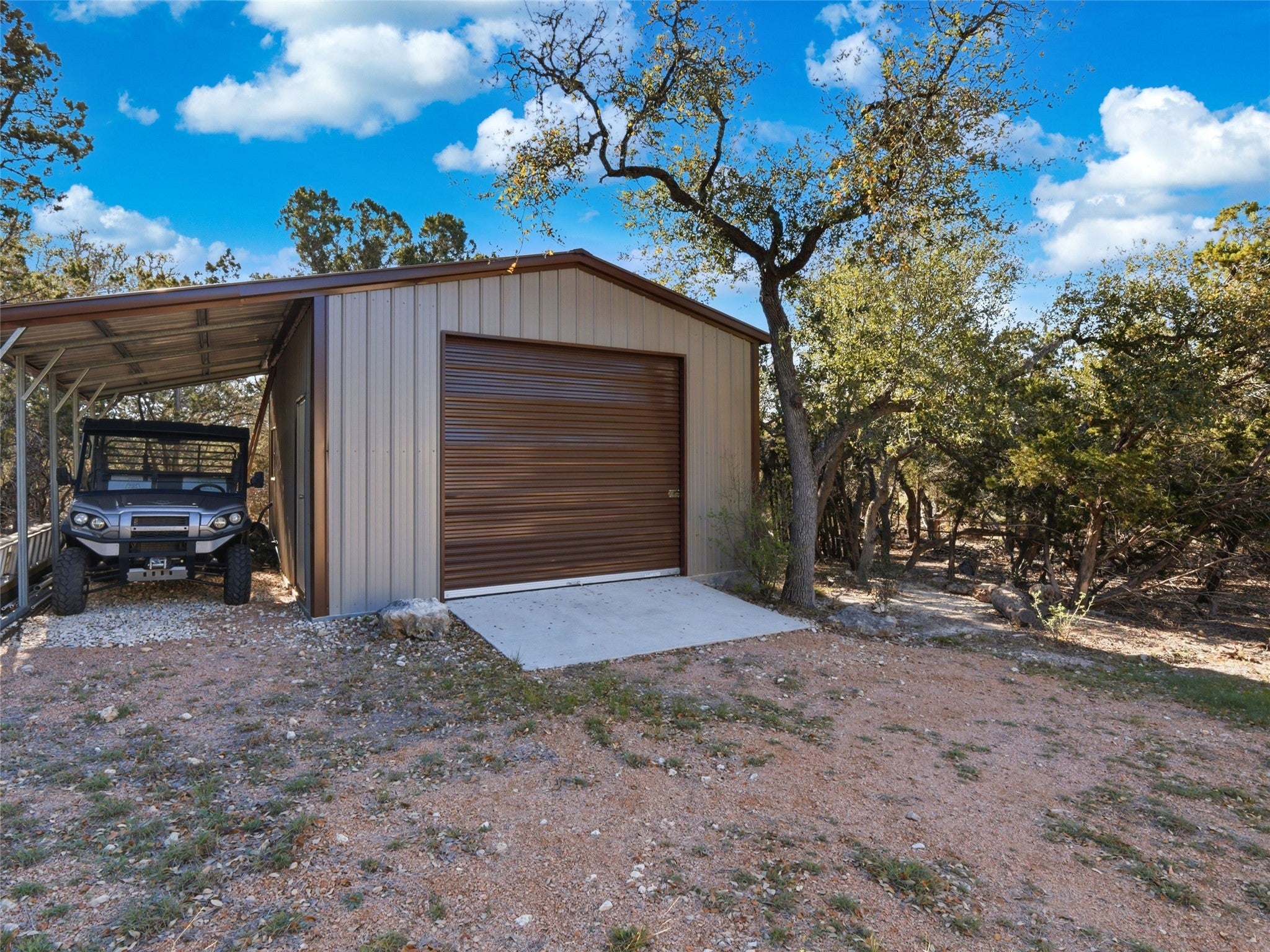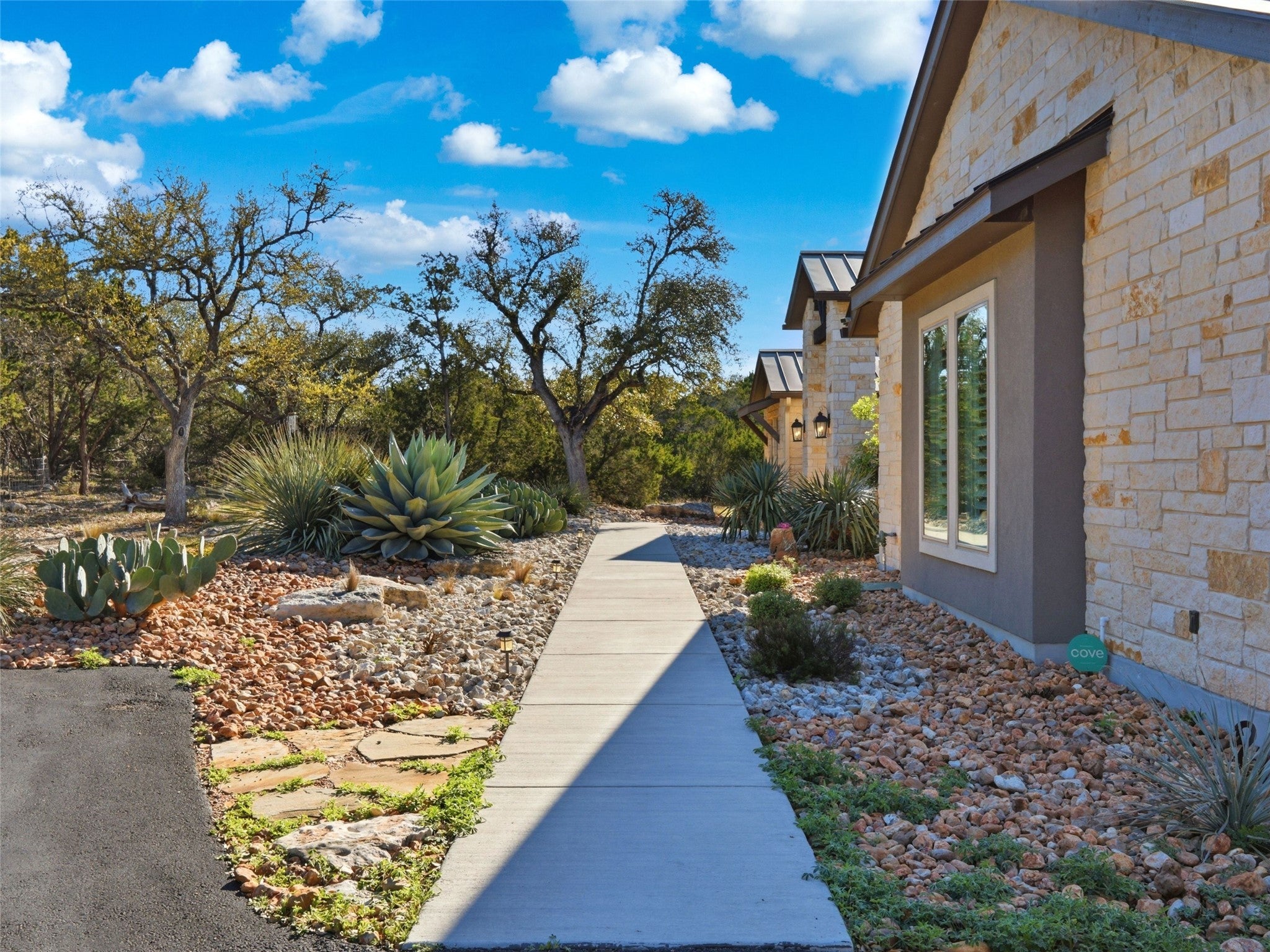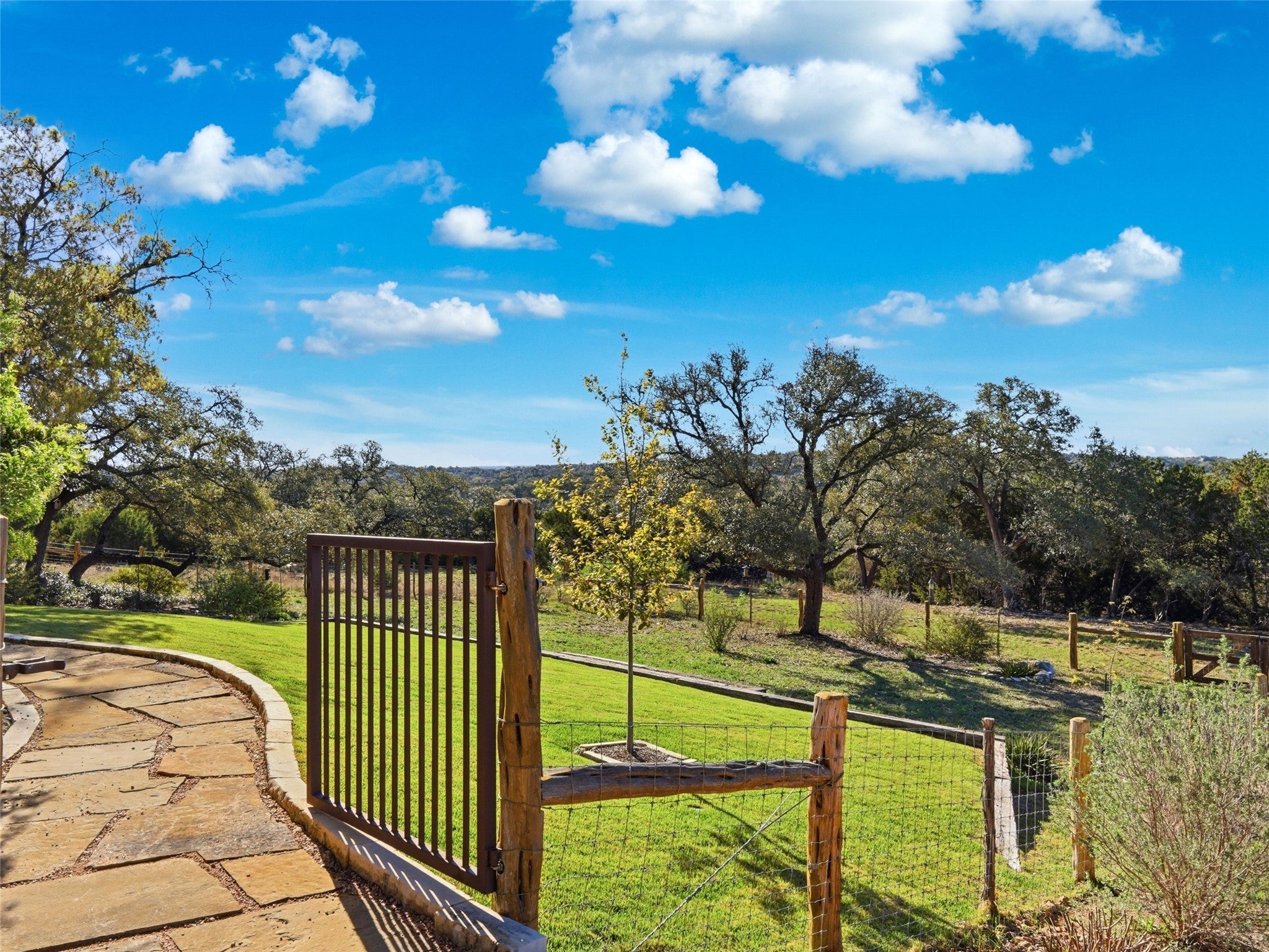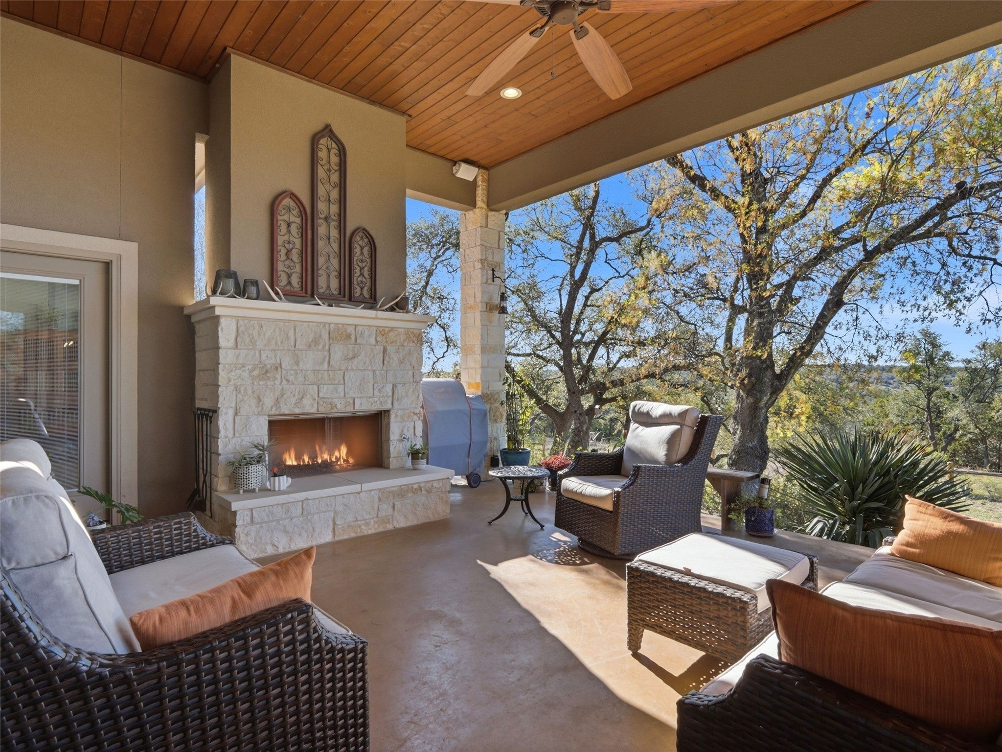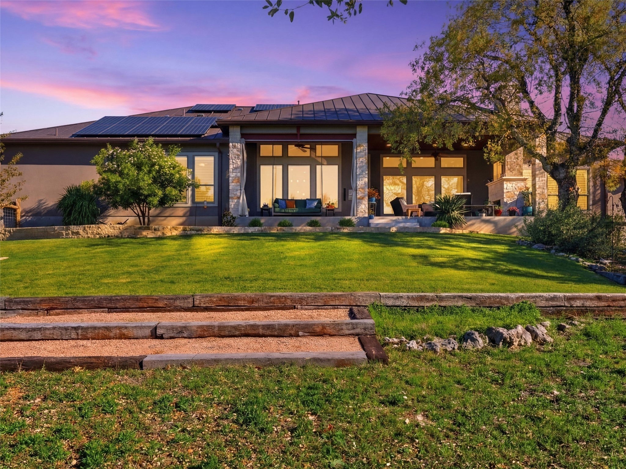 Perched along a scenic ridgeline and nestled privately within 5 serene acres, this custom-built Hill Country retreat offers breathtaking views, abundant wildlife, and exceptional privacy. The home showcases beautiful finishes throughout, including quartz countertops and plantation shutters, while expansive windows fill the interior with natural light and frame the surrounding Hill Country landscape. The spacious covered back patio with outdoor fireplace extends the living space outdoors - an ideal setting for morning coffee as the sun rises over the hills, relaxed evenings by the fire, and gatherings with friends while watching deer and native wildlife. The professionally xeriscaped grounds feature native plants that complement the natural setting while providing low-maintenance beauty. Additional features include a 3 car garage with one bay configured as a workshop, a detached 20 x 26 detached building with carport, fenced backyard, standing seam metal roof, solar panels and a 26 kw generator for efficiency and peace of mind. Properties offering this level of privacy, views, and thoughtful design are rare - come and experience the beauty and tranquility of Hill Country living for yourself.