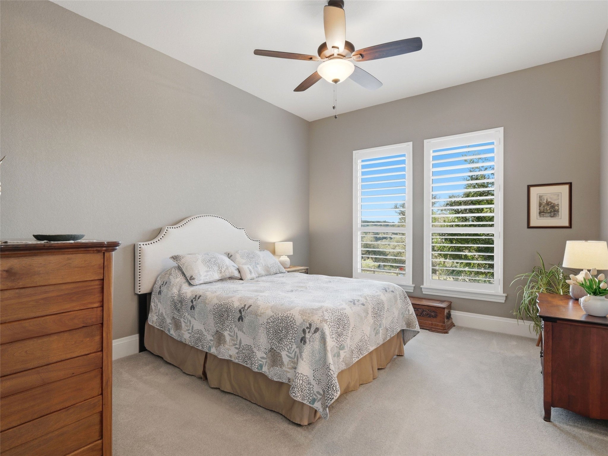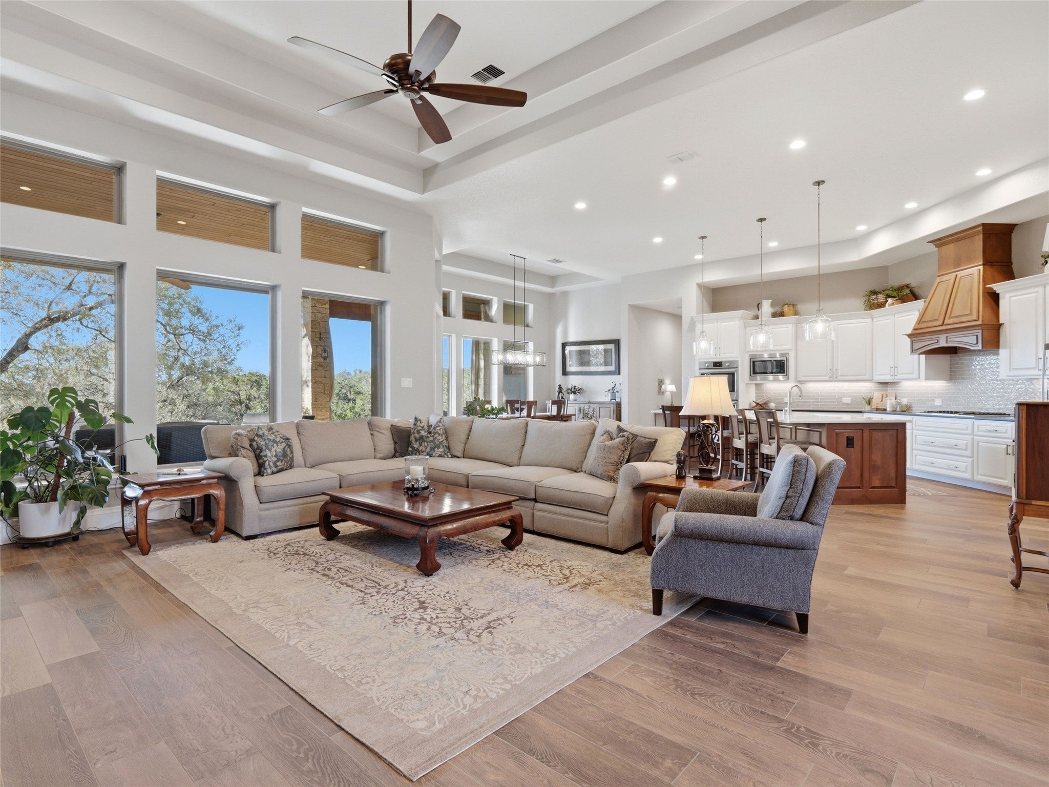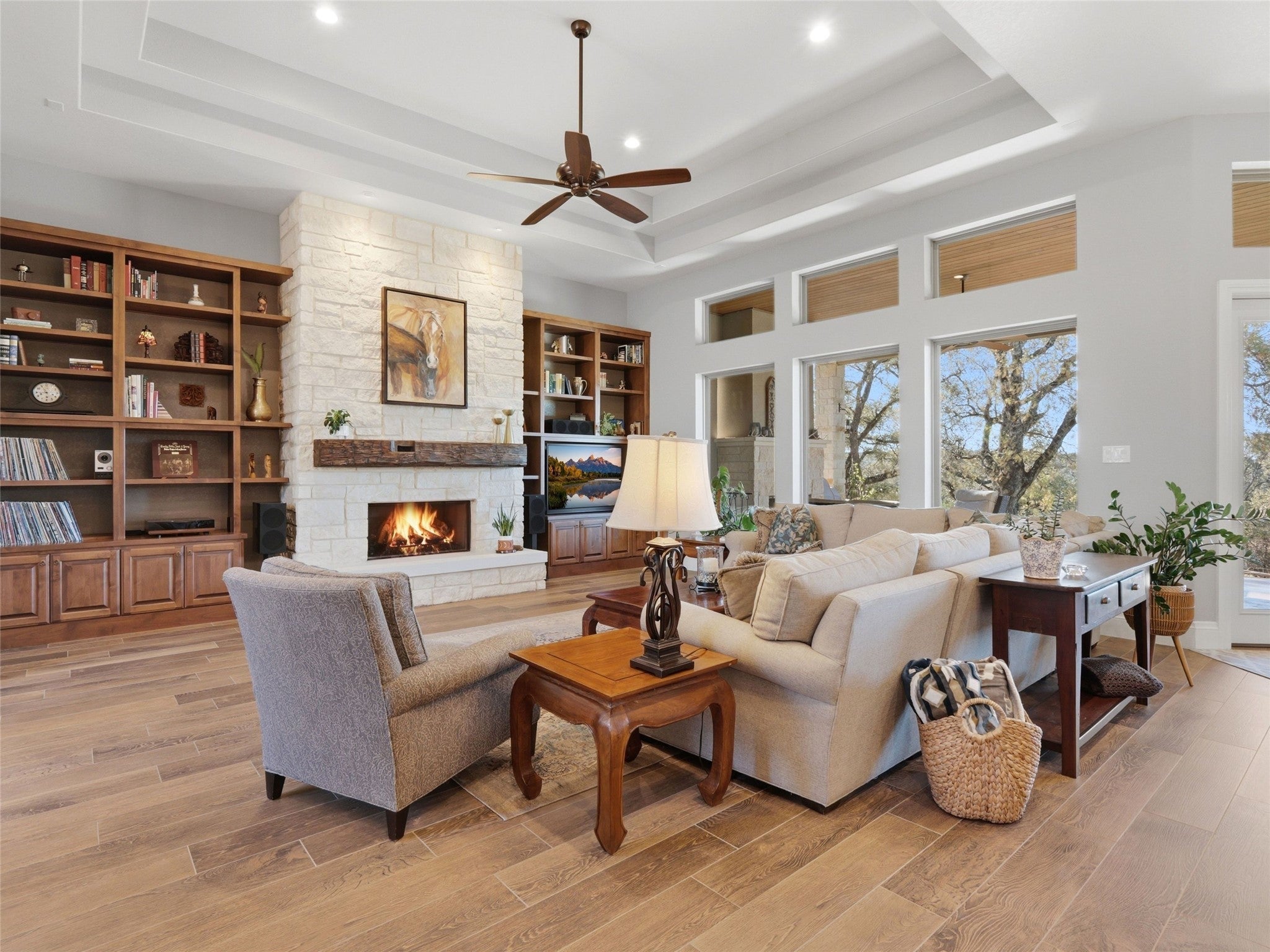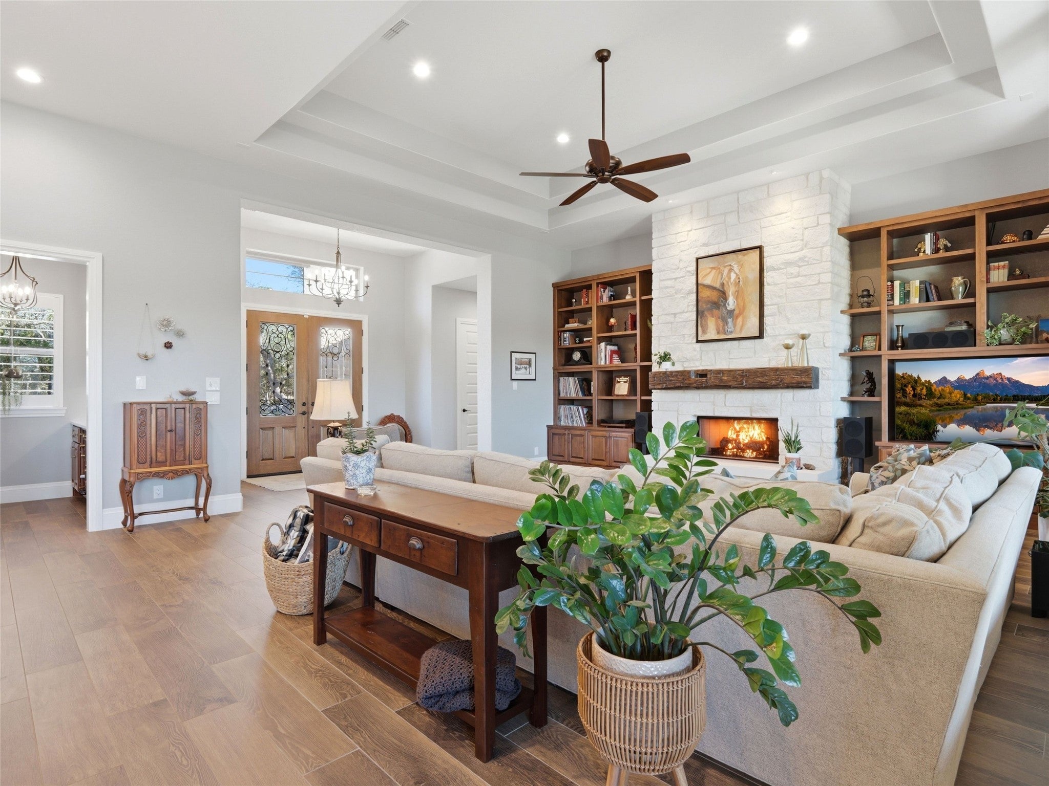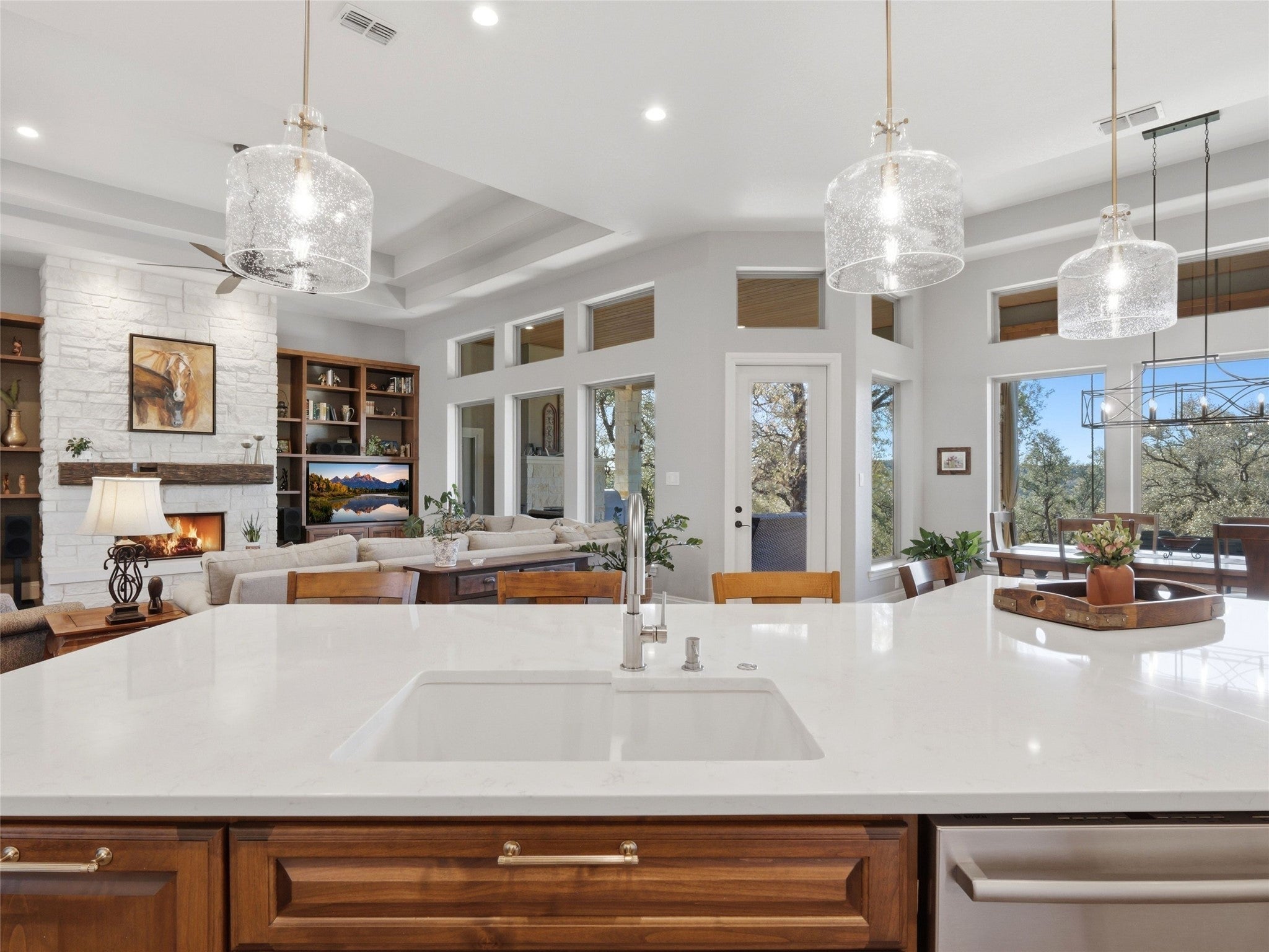 Perched along a scenic ridgeline and nestled privately within 5 serene acres, this custom-built Hill Country retreat offers breathtaking views, abundant wildlife, and exceptional privacy. The home showcases beautiful finishes throughout, including quartz countertops and plantation shutters, while expansive windows fill the interior with natural light and frame the surrounding Hill Country landscape. The spacious covered back patio with outdoor fireplace extends the living space outdoors - an ideal setting for morning coffee as the sun rises over the hills, relaxed evenings by the fire, and gatherings with friends while watching deer and native wildlife. The professionally xeriscaped grounds feature native plants that complement the natural setting while providing low-maintenance beauty. Additional features include a 3 car garage with one bay configured as a workshop, a detached 20 x 26 detached building with carport, fenced backyard, standing seam metal roof, solar panels and a 26 kw generator for efficiency and peace of mind. Properties offering this level of privacy, views, and thoughtful design are rare - come and experience the beauty and tranquility of Hill Country living for yourself.