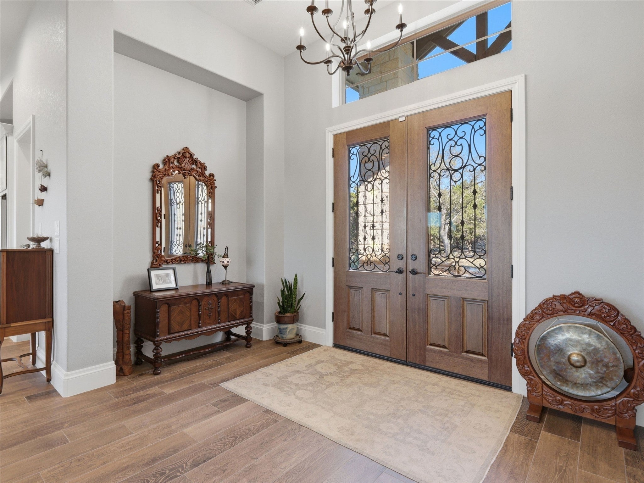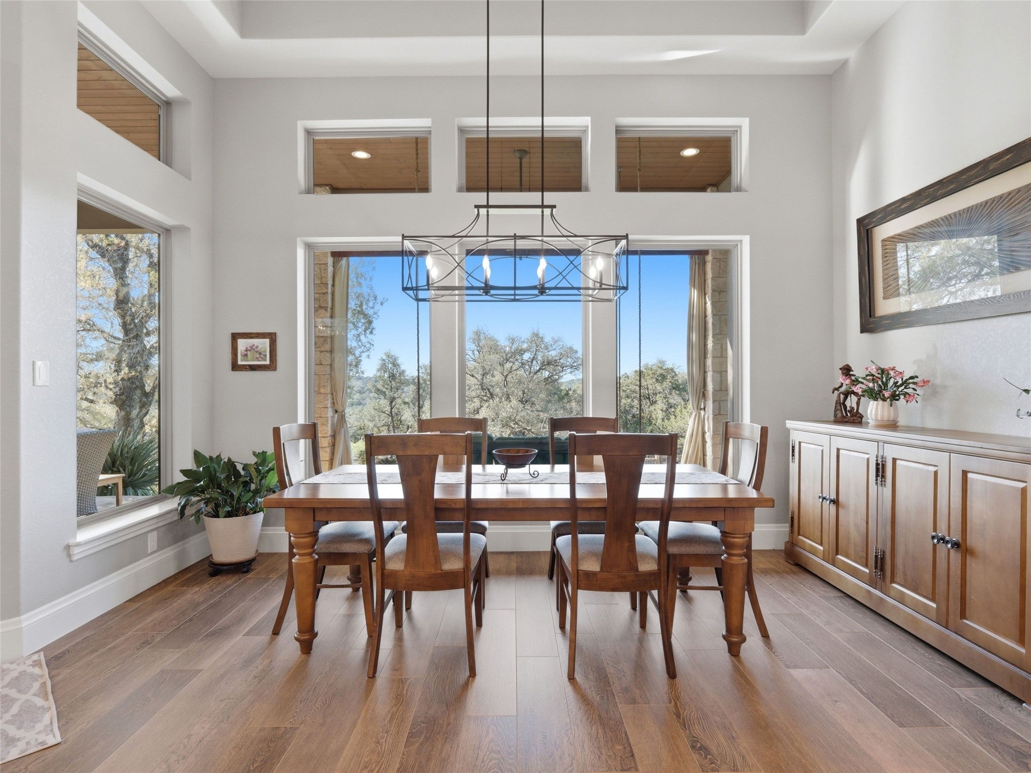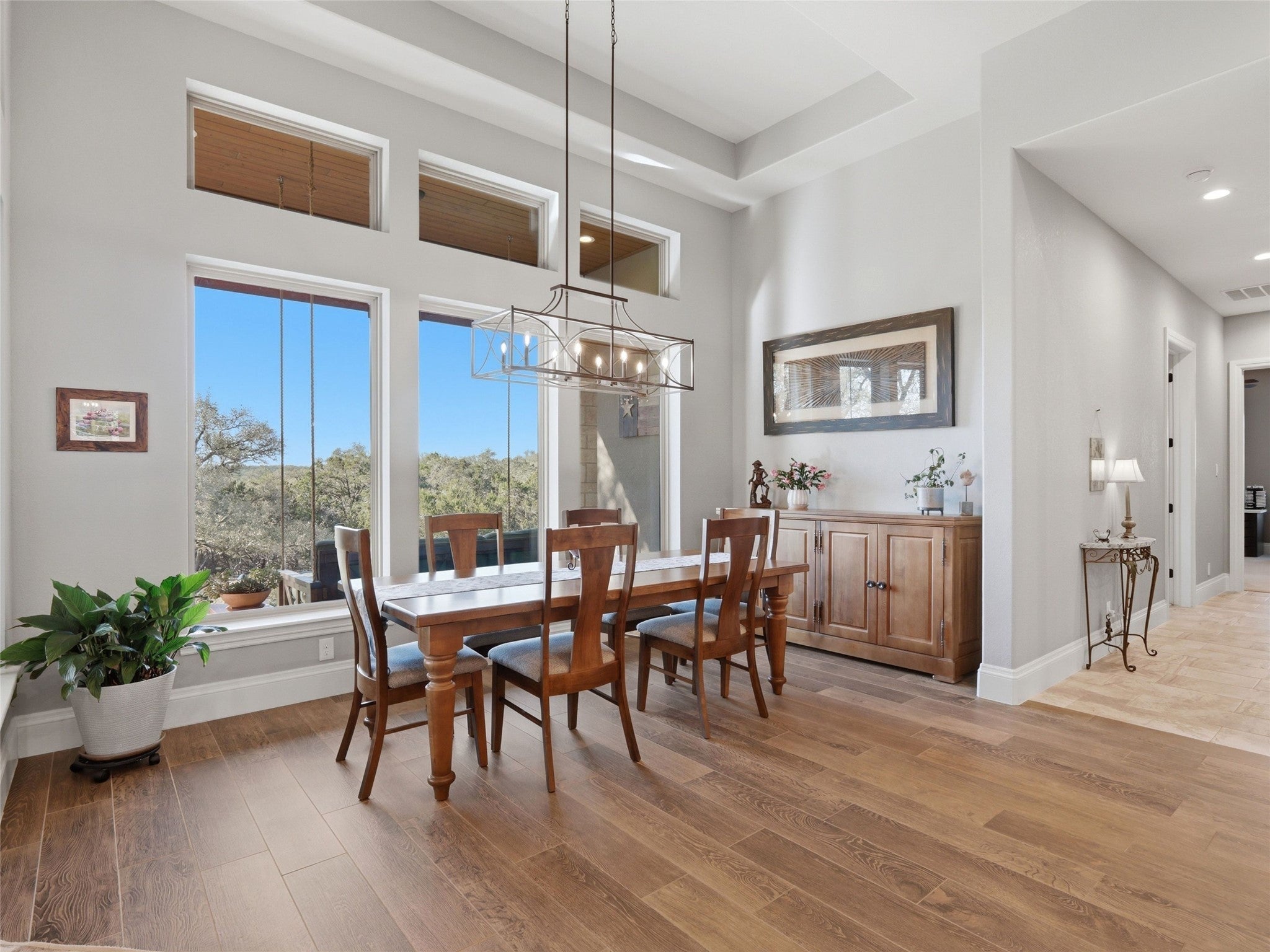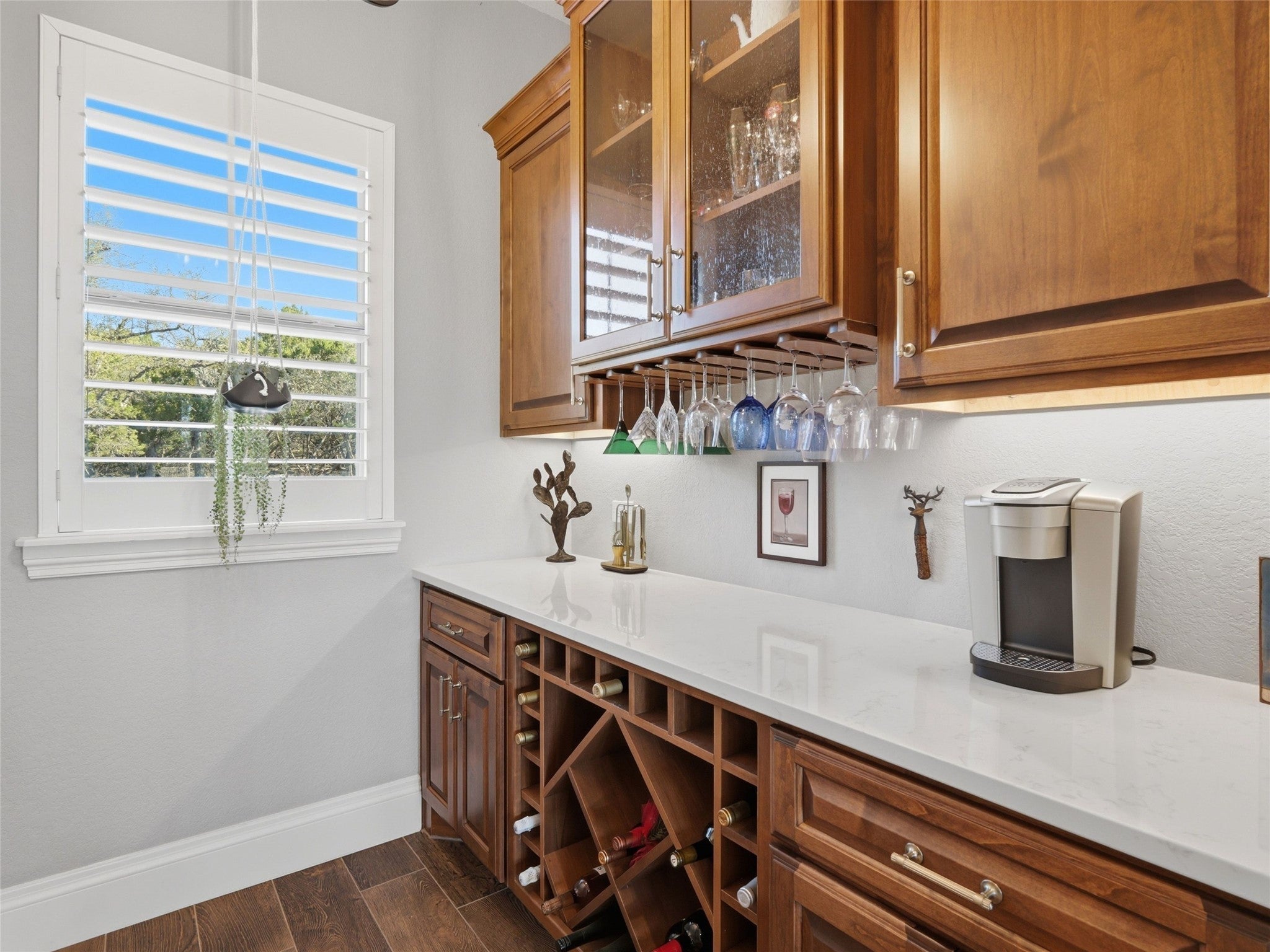 Perched along a scenic ridgeline and nestled privately within 5 serene acres, this custom-built Hill Country retreat offers breathtaking views, abundant wildlife, and exceptional privacy. The home showcases beautiful finishes throughout, including quartz countertops and plantation shutters, while expansive windows fill the interior with natural light and frame the surrounding Hill Country landscape. The spacious covered back patio with outdoor fireplace extends the living space outdoors - an ideal setting for morning coffee as the sun rises over the hills, relaxed evenings by the fire, and gatherings with friends while watching deer and native wildlife. The professionally xeriscaped grounds feature native plants that complement the natural setting while providing low-maintenance beauty. Additional features include a 3 car garage with one bay configured as a workshop, a detached 20 x 26 detached building with carport, fenced backyard, standing seam metal roof, solar panels and a 26 kw generator for efficiency and peace of mind. Properties offering this level of privacy, views, and thoughtful design are rare - come and experience the beauty and tranquility of Hill Country living for yourself.