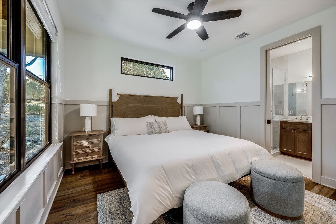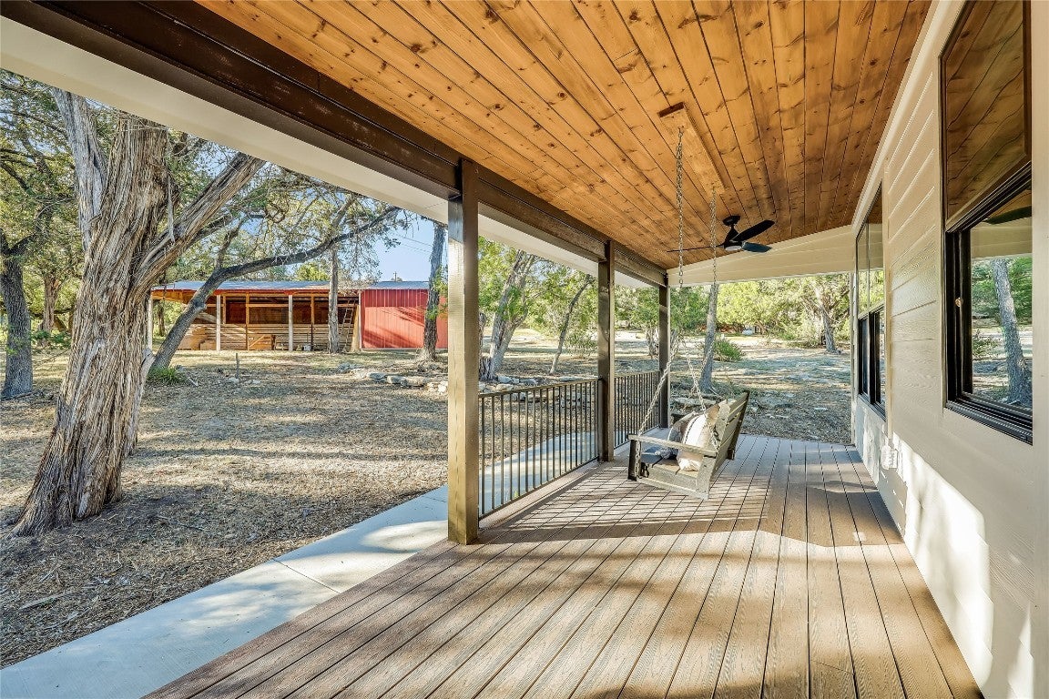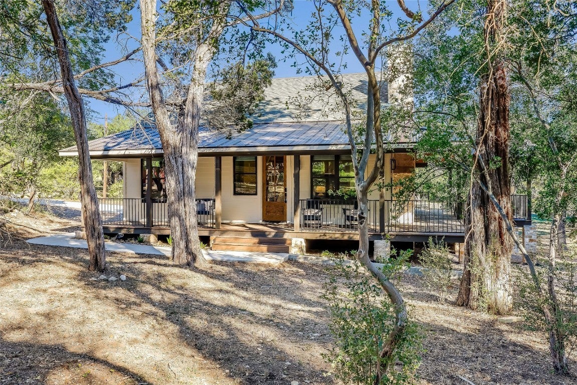 Embrace the rustic charm and natural beauty of this exquisite farmhouse style retreat, fully renovated in 2023 with over $600K invested in the renovation! A horse lover's dream- according to city records this is the only property in the city of Lago Vista that allows horses (buyer to verify). The 3.6 acres is enveloped in a canopy of mature trees, with a wet weather creek situated on the back side of the property. A spacious wrap around porch summons friends and family to relax and relish in the natural surroundings. Upon entering, enjoy the open concept floor plan, allowing for ease of entertainment and a cohesive gathering space. Each of the 4 bedrooms includes its own private bath. The primary bedroom is located on the main level, leading into an alluring en suite with a shower and soaking tub combination. A second bedroom is conveniently located on the main level, as well. The thoughtfully designed kitchen, with a generous island, opens directly into the dining area boasting of views of the outdoor surroundings. A wall of glass sliders allows for natural light to flood the home, and leads directly onto the enormous covered porch for added indoor/outdoor enjoyment. The beautiful detail of the custom wood ceiling on the covered porch elevates the design. Just off of the dining room is a sunroom bidding you to enjoy your morning coffee with stunning views outside another wall of sliding glass doors! Around every corner, the custom elements and attention to design details draw you into distinctive, endearing spaces! Upstairs are 2 addtional bedrooms and attached bathrooms. STR's are allowed on this property. Owning this home includes membership to the Lago Vista Property Owner's Association, allowing exclusive access to 9 private waterfront parks, basketball court, boat ramps, campground, disc golf course, fishing well, fitness center, hiking trail, marinas, parks, pavilions, pool, athletic field, tennis courts, pickle ball courts, playgrounds and more!