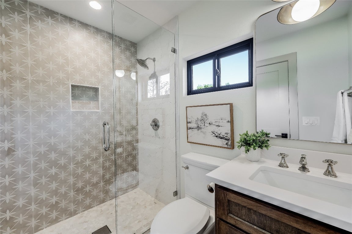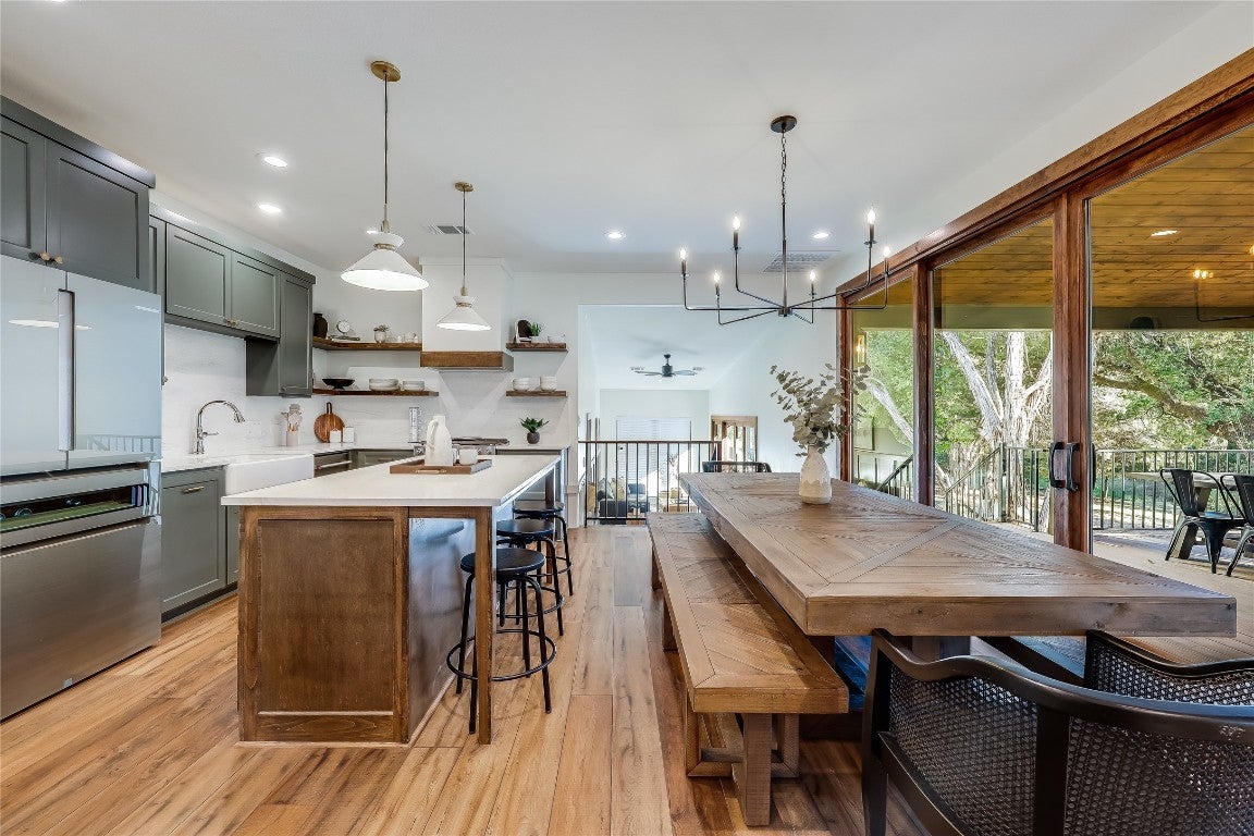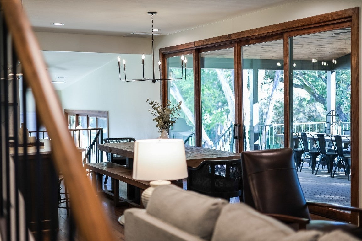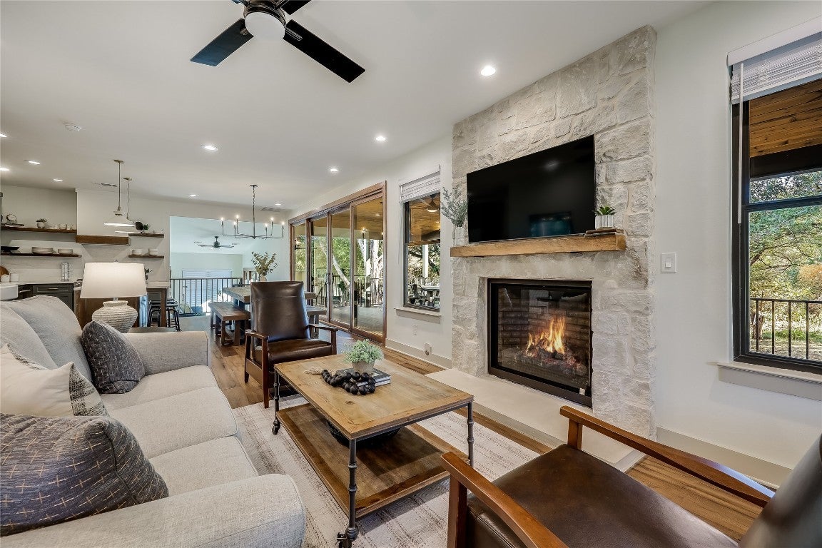 Embrace the rustic charm and natural beauty of this exquisite farmhouse style retreat, fully renovated in 2023 with over $600K invested in the renovation! A horse lover's dream- according to city records this is the only property in the city of Lago Vista that allows horses (buyer to verify). The 3.6 acres is enveloped in a canopy of mature trees, with a wet weather creek situated on the back side of the property. A spacious wrap around porch summons friends and family to relax and relish in the natural surroundings. Upon entering, enjoy the open concept floor plan, allowing for ease of entertainment and a cohesive gathering space. Each of the 4 bedrooms includes its own private bath. The primary bedroom is located on the main level, leading into an alluring en suite with a shower and soaking tub combination. A second bedroom is conveniently located on the main level, as well. The thoughtfully designed kitchen, with a generous island, opens directly into the dining area boasting of views of the outdoor surroundings. A wall of glass sliders allows for natural light to flood the home, and leads directly onto the enormous covered porch for added indoor/outdoor enjoyment. The beautiful detail of the custom wood ceiling on the covered porch elevates the design. Just off of the dining room is a sunroom bidding you to enjoy your morning coffee with stunning views outside another wall of sliding glass doors! Around every corner, the custom elements and attention to design details draw you into distinctive, endearing spaces! Upstairs are 2 addtional bedrooms and attached bathrooms. STR's are allowed on this property. Owning this home includes membership to the Lago Vista Property Owner's Association, allowing exclusive access to 9 private waterfront parks, basketball court, boat ramps, campground, disc golf course, fishing well, fitness center, hiking trail, marinas, parks, pavilions, pool, athletic field, tennis courts, pickle ball courts, playgrounds and more!