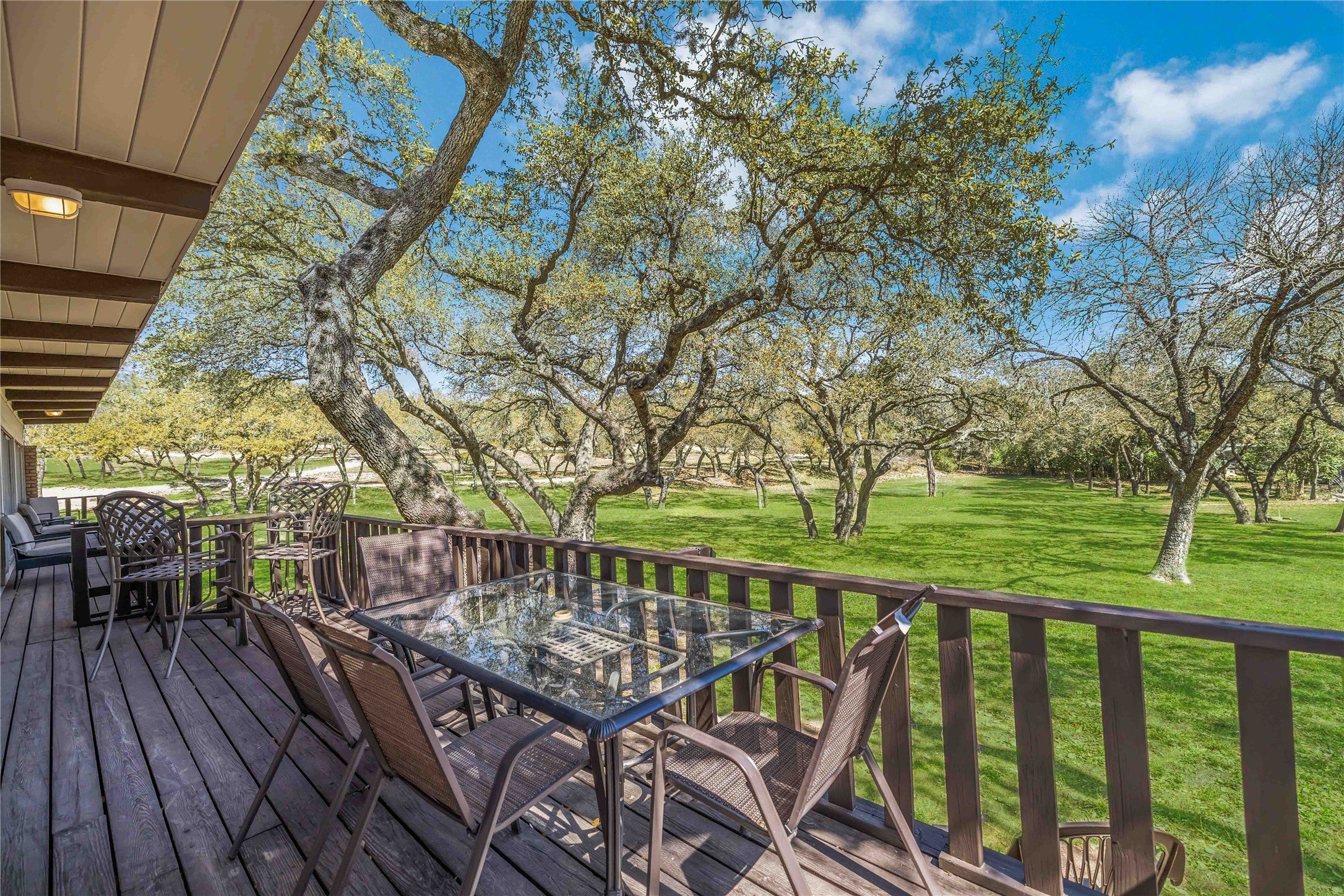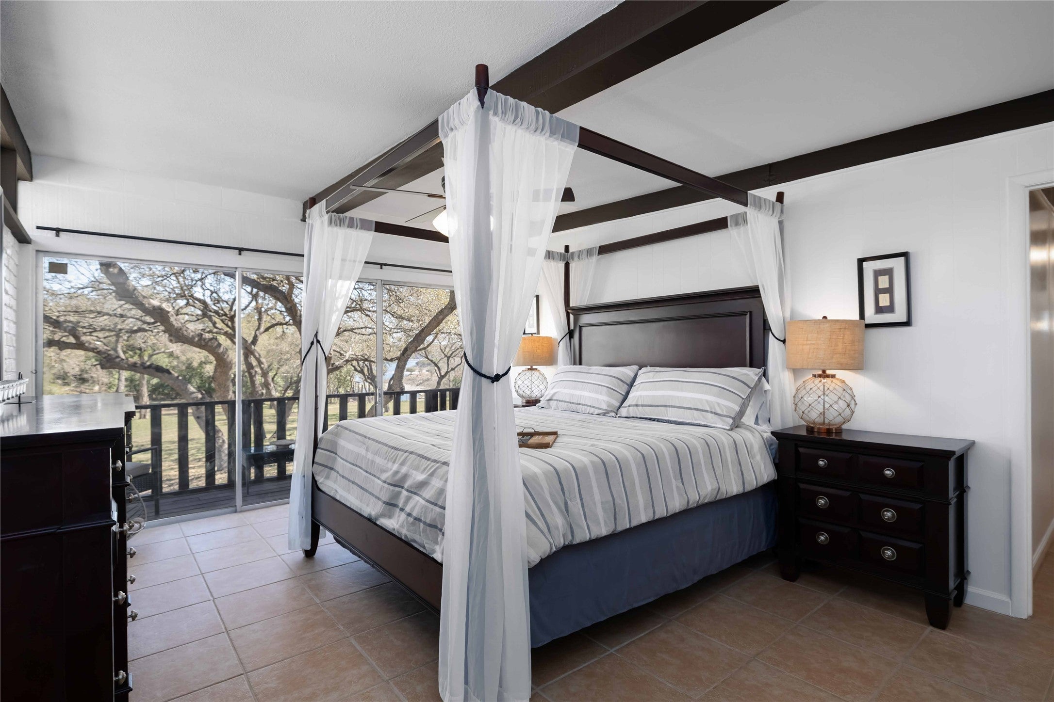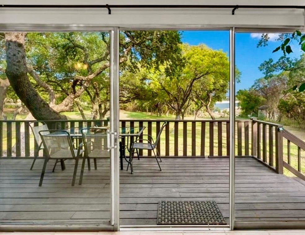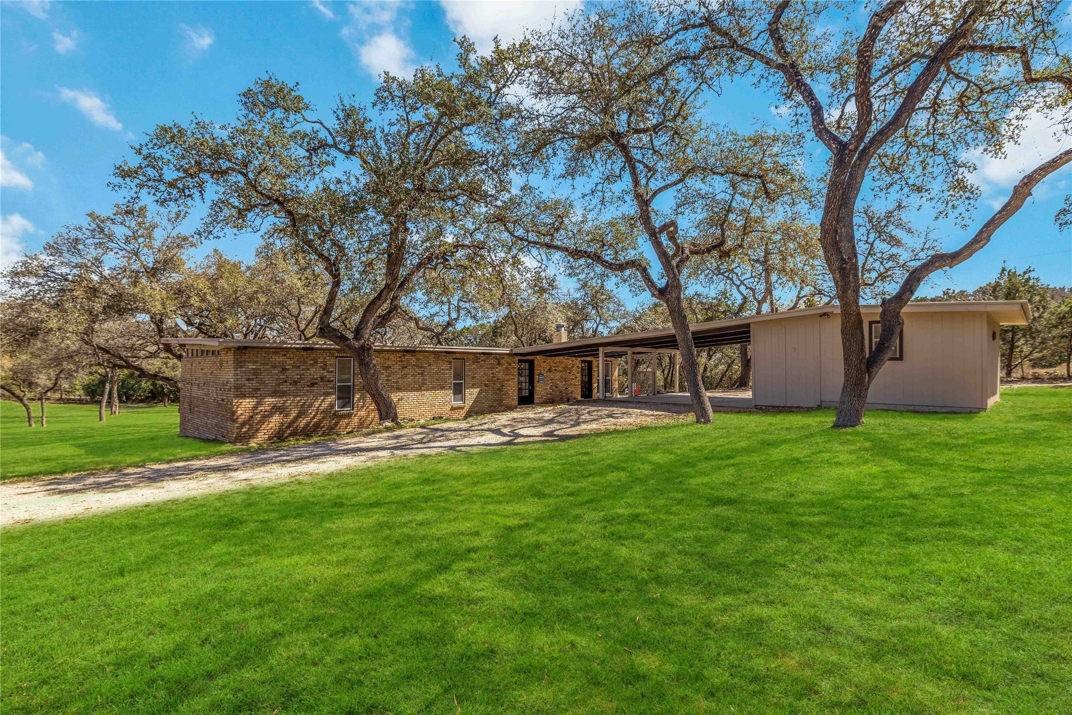 This unique, fully renovated Mid-Century Modern gem comes furnished and is move-in ready! All appliances and washer/dryer convey. Also included are outdoor patio/deck seating, fire pit, fire pit seating, upgraded tether ball set, and a multitude of outdoor game equipment. This exceptional waterfront 4.36-acre property nestled amidst the tranquil surroundings of Lake Travis offers a rare blend of serenity and style. Boasting breathtaking views of the lake and the picturesque sunsets, this home is the ultimate retreat for those seeking peace and natural beauty. Wake up to stunning views of the lake every morning, which can be enjoyed from every room. Step inside to discover a thoughtfully designed interior providing the perfect balance of comfort and functionality. The open concept living area is bathed in natural light, creating a warm and inviting ambiance, which will be enjoyed while cooking or simply relaxing by the fireplace. The kitchen is ideal for entertaining guests. Along the entire back side of the home is a deck with outdoor furniture, perfect for watching the sunsets with your favorite beverage. The floor plan itself invites the serine outdoor views inside from every single room. A newly graveled expansive private walking trail provides the perfect setting for leisurely strolls with pets or horses or simply outdoor enjoyment. This stunning lakefront home is conveniently located near golf courses, schools, restaurants, entertainment, churches and hiking trails. The unrestricted, unincorporated large lot offers ample possibilities, including adding a private boat dock, adding an additional home or two, adding an ADU, or subdividing into multiple waterfront lots. The possibilities are endless! Hurry, this one won't last due to the under $1MM price point!