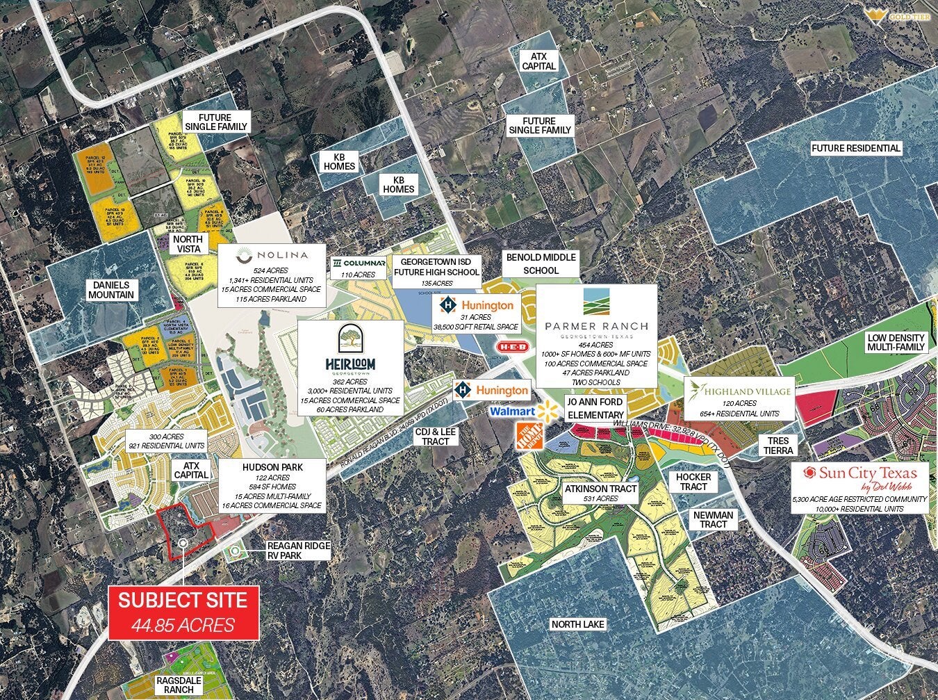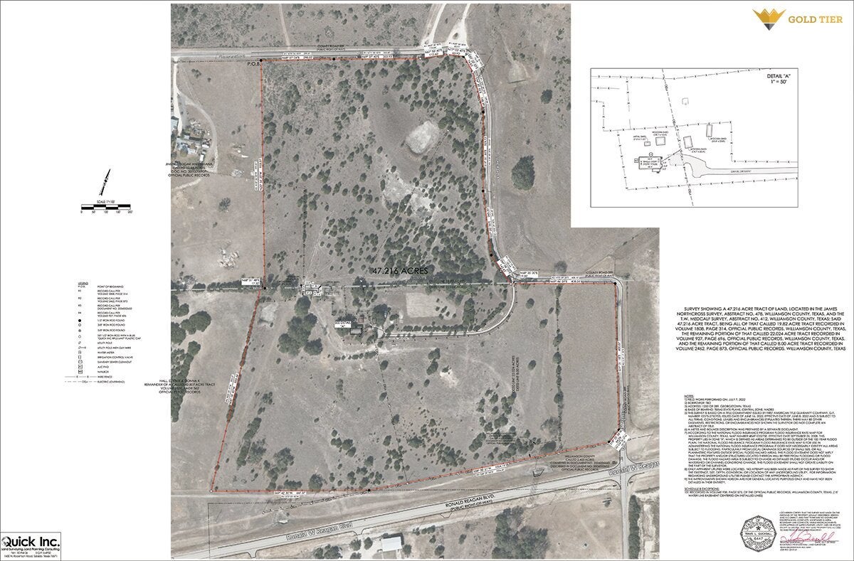 Gold Tier Real Estate is proud to present ~ 44.85 acres on Ronald Reagan Boulevard, located just down the street from a newly constructed H.E.B. grocery store. The surrounding area is experiencing rapid growth, with major developments including Heirloom, Nolina, Rockin Wilco, North Vista, Hudson Park, and more. Walmart and Home Depot are also rumored to be entering the market in the near future. The property is located outside of city limits and not within any ETJ, and is therefore subject only to Williamson County jurisdiction, allowing for no zoning restrictions. The site is relatively level and offers significant frontage along Ronald Reagan Boulevard. A 30 inch water line from the City of Georgetown runs along the frontage, and there are plans for a future wastewater line through annexation via the neighboring MUD. The seller is willing to subdivide the property to accommodate buyer needs. Pricing will vary depending on the size and location of the tract. **Broker makes no representations or warranties as to the accuracy of the information provided. Buyer to independently verify all information.**
