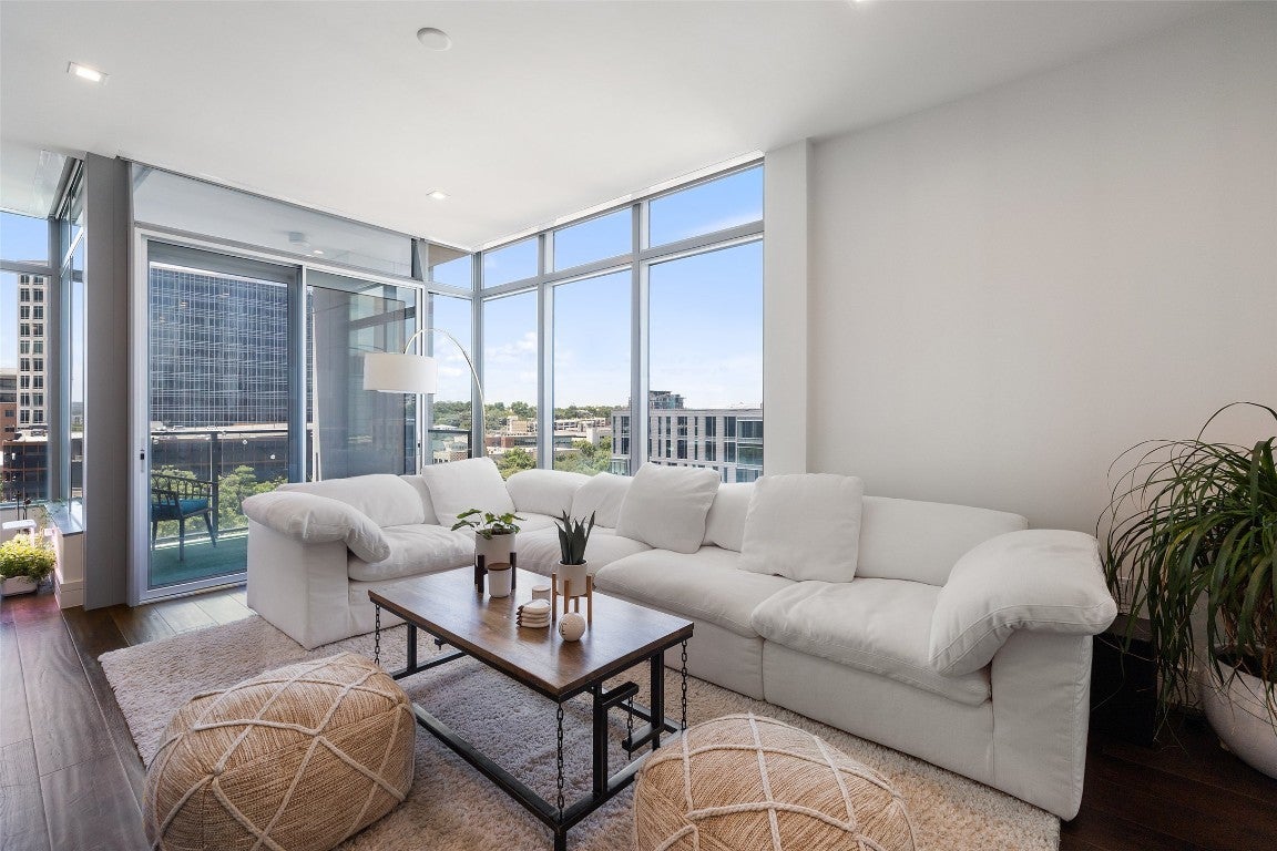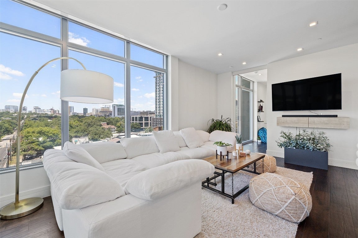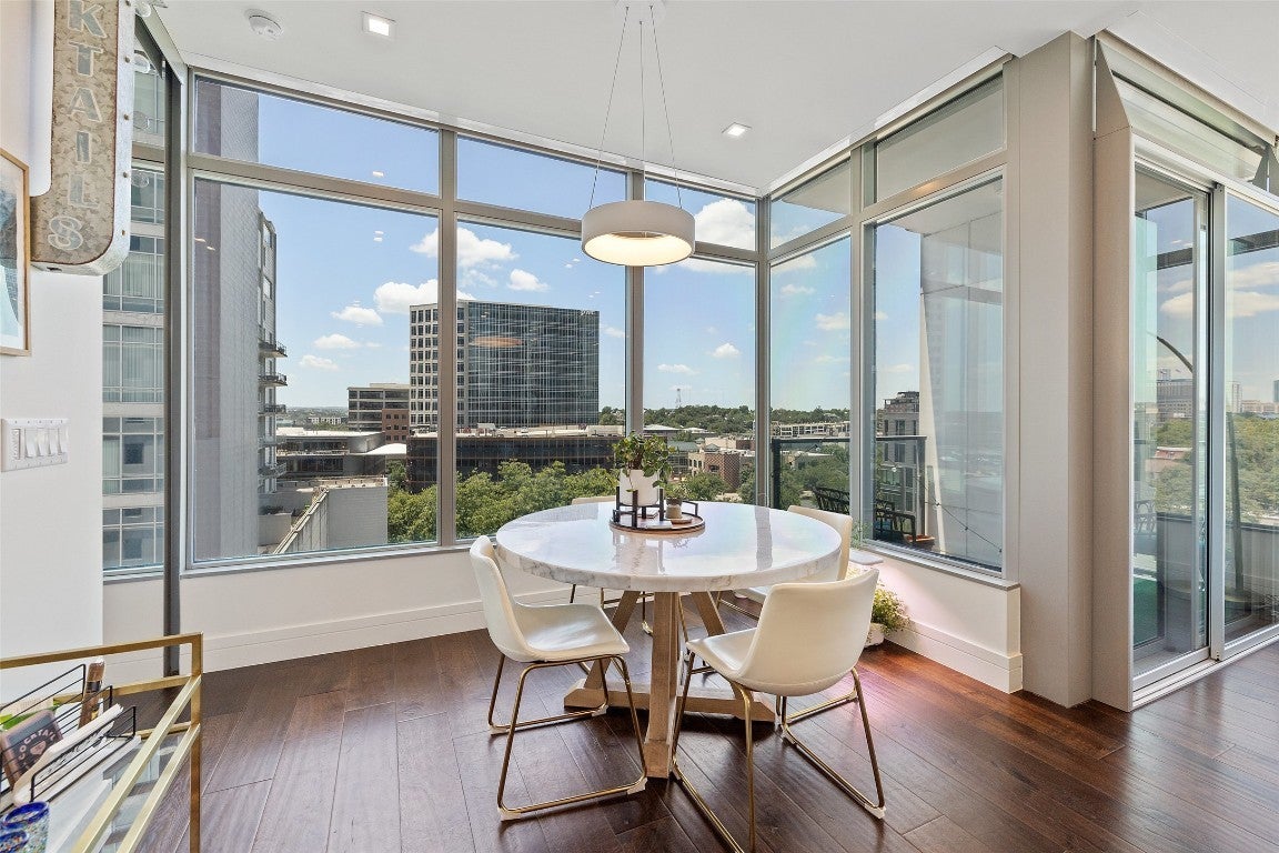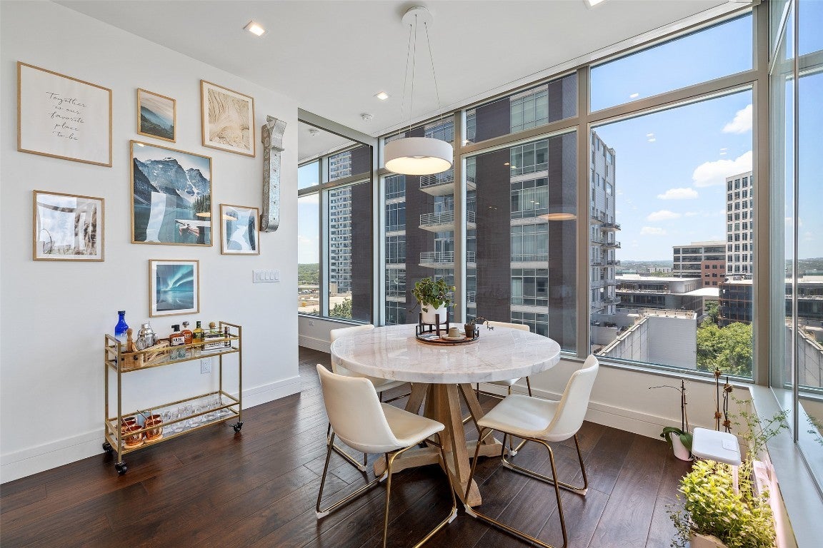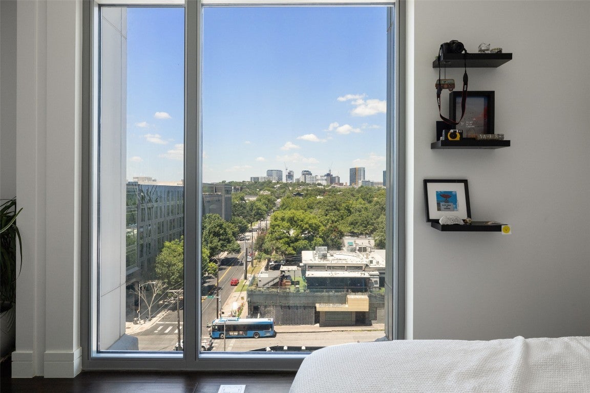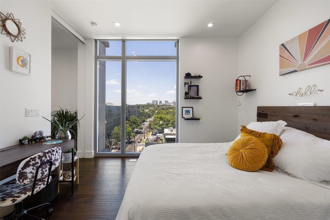 This stunning upscale 8th-floor condo boasts a majestic open plan with floor-to-ceiling windows offering breathtaking city and hill country views. Experience the allure of downtown Austin from this spacious two-bedroom, two-bathroom corner residence. The open and inviting living area seamlessly flows into a large corner kitchen, ideal for entertaining. Floor-to-ceiling glass windows flood the space with natural light. This residence is exquisitely finished with top-end Miele kitchen appliances, elegant hardwood floors, and luxurious bathrooms featuring marble floors. The owner's suite boasts a spa-like ensuite bathroom and a custom walk-in closet. The home is outfitted with the latest technology, including smart blinds, lights, and a thermostat ready for automation. With only 154 residences across 39 floors and no adjoining hotel, you will enjoy heightened privacy and exclusive access to over 20,000 sq ft of resident amenity space designed by Michael Hsu. Amenities include multiple lounges, a catering kitchen, an air-conditioned pet park with wash stations, a fitness center and yoga studio, guest suites, and a sky deck with a resort-style pool and outdoor lounge. The unique triangular shape of this recognizable tower, designed to preserve Austin's capitol view corridors, allows for unmatched viewing angles and panoramic vistas from each residence. The location is unbeatable. Walk, bike, or scoot to nearby Trader Joe's, Whole Foods Market, the Seaholm development, the new Central Austin Library, ACL Moody Theater, Republic Square Park, Lady Bird Lake Hike and Bike Trail, and countless restaurants, bars, and shops. Among luxury residential offerings in downtown Austin, Fifth & West Residences stands alone