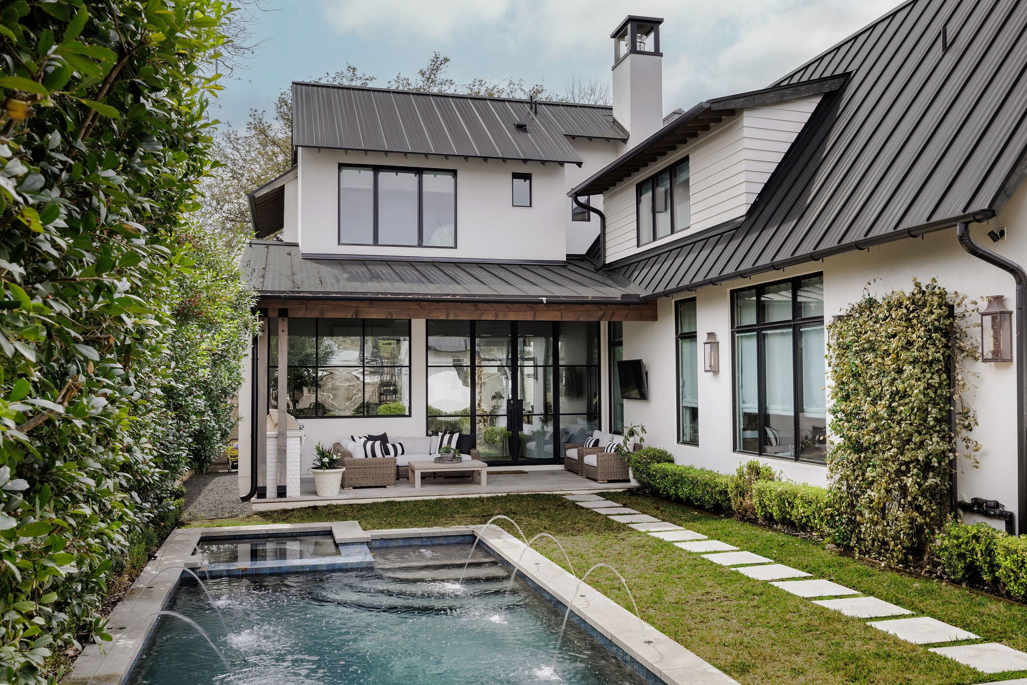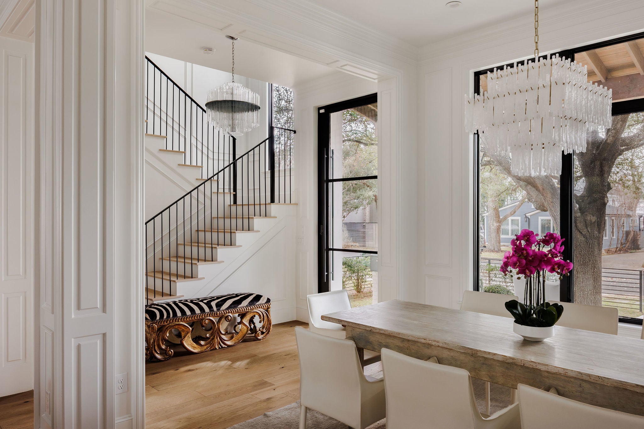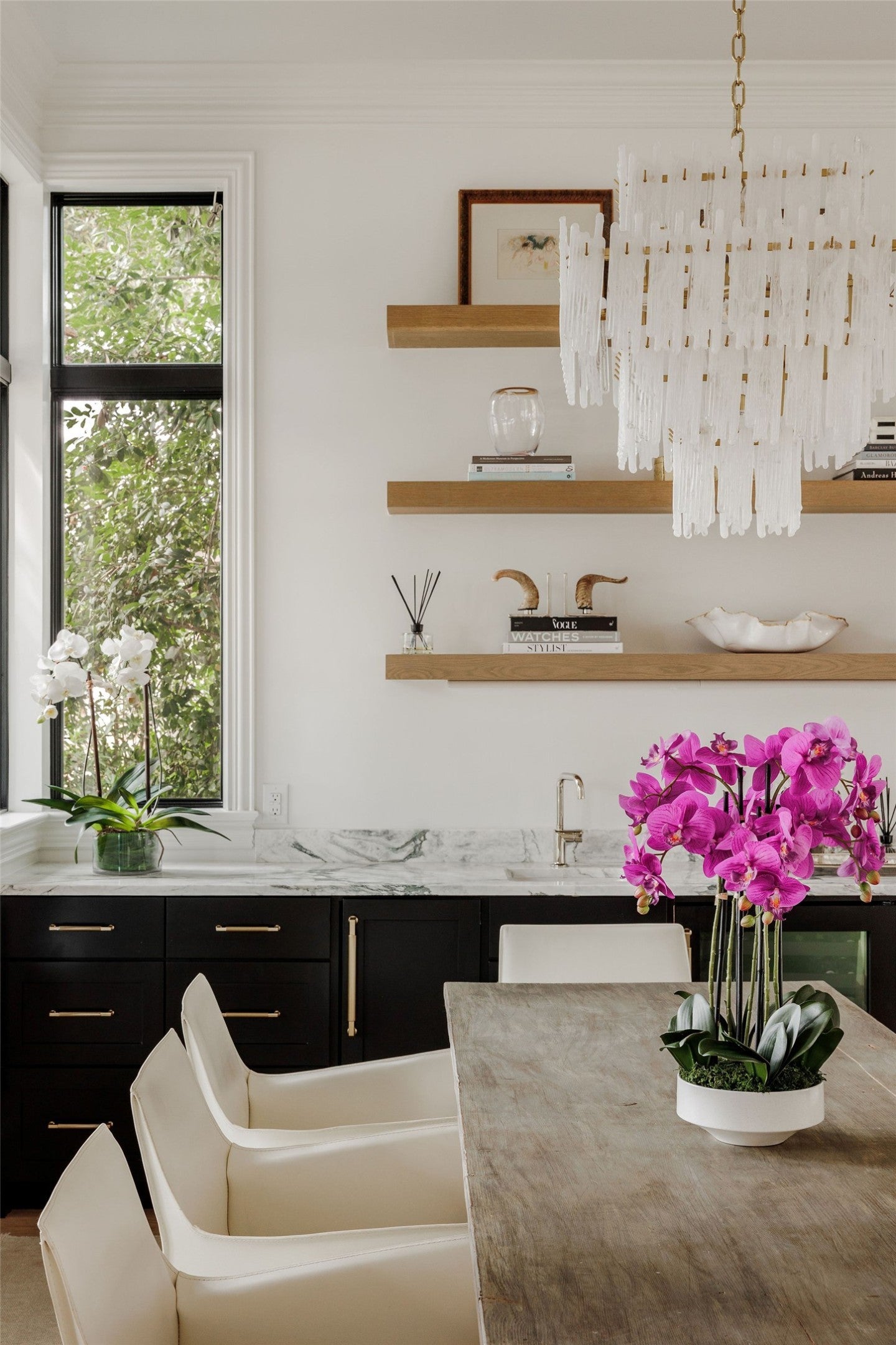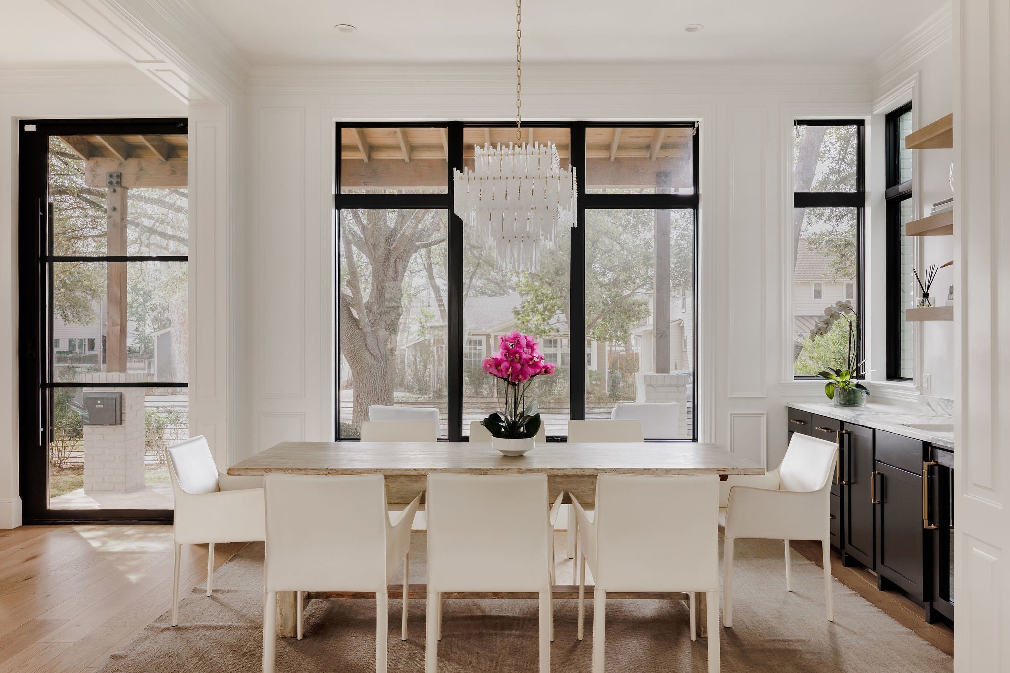 Completed in 2023 by Nalle Custom Homes, this 5-bedroom, 5.5-bath residence blends timeless craftsmanship with elevated modern design. Thoughtfully curated throughout, it features custom trim and molding, wide-plank white oak floors, and striking designer lighting for a refined yet welcoming feel. The main level offers a serene first-floor primary suite with custom millwork and a spa-like bath wrapped in Calacatta marble, along with a beautifully appointed powder bath. At the heart of the home, the chef’s kitchen showcases inset custom cabinetry, marble countertops, and an oversized island with natural wood accents. A paneled Sub-Zero refrigerator and Wolf range with pot filler anchor the space, while open shelving and statement lighting add warmth. A custom steel pantry door reveals an oversized pantry with a coffee station and Sub-Zero wine column. Just off the kitchen, the dining bar area is designed for effortless entertaining, complete with a beverage refrigerator and Scotsman sonic ice maker. Upstairs includes three bedrooms—two en-suite and one with a hall bath—plus a versatile secondary living space. All bathrooms and laundry areas are finished in natural marble with high-end Rohl and Kohler fixtures, reinforcing the home’s cohesive luxury. Outdoor living is equally impressive, with a private backyard featuring a pool, spa, built-in grill, and double-drawer refrigerator for seamless indoor-outdoor enjoyment. A detached two-car garage with alley access and a custom sliding electric gate includes a private 1-bedroom, 1-bath apartment with its own laundry and mini kitchen—ideal for guests, extended family, or rental income. Ideally located in Central Austin, the home is walkable to Postino, Tiny Boxwoods, and Bryker Woods Elementary, offering luxury living in a prime location.