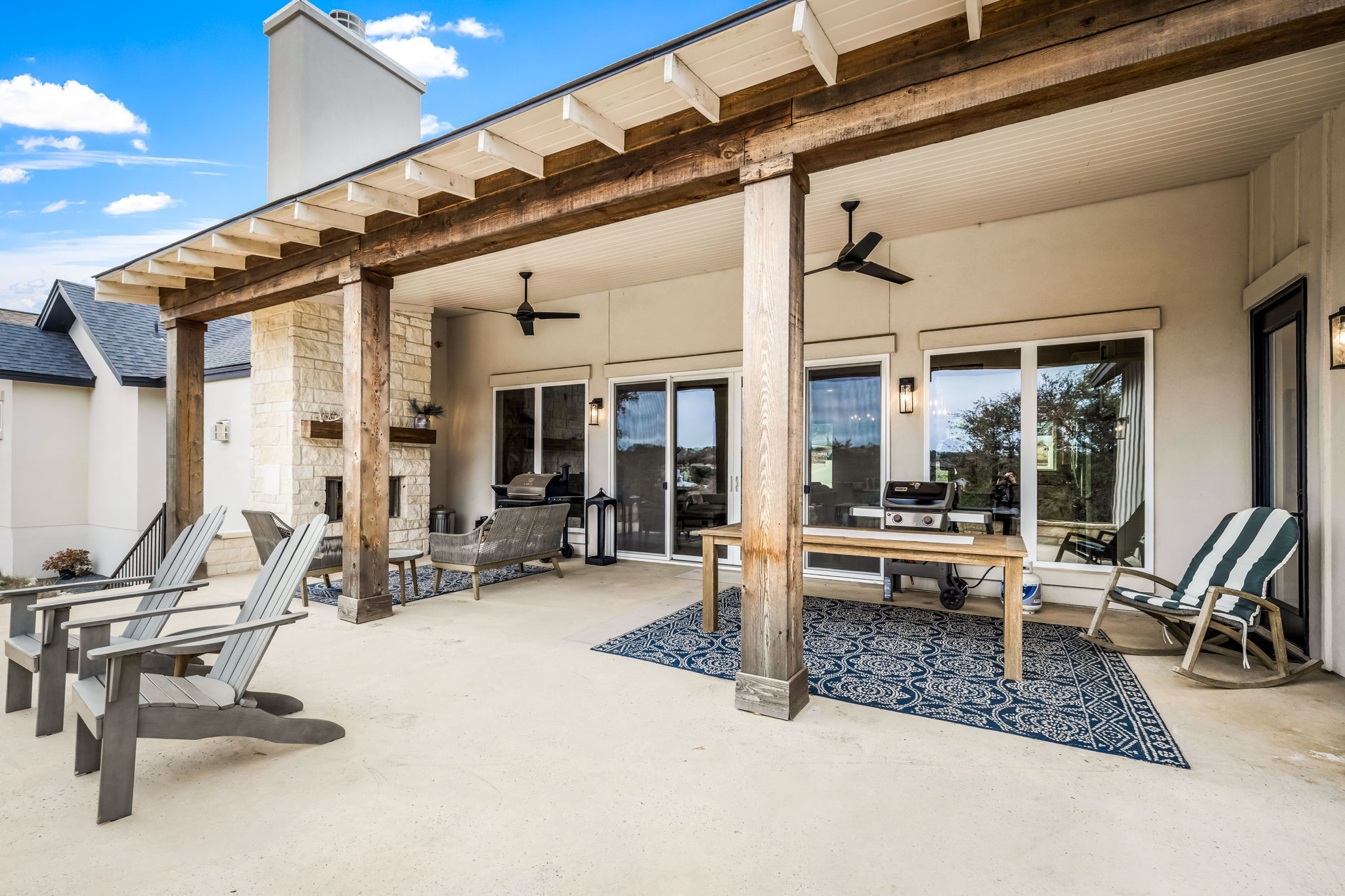 This fully custom Casadomaine residence embodies refined Texas Hill Country luxury, perfectly positioned on a private 1.39-acre homesite with sweeping views, a greenbelt backdrop, and mature native trees. Designed as an elegant single-story home, it offers four bedrooms, three full baths, and a thoughtfully curated layout that balances architectural beauty with effortless livability. White oak flooring, beamed ceilings, and abundant natural light create a warm yet sophisticated atmosphere throughout. At the heart of the home is a chef-caliber kitchen designed for both everyday living and elevated entertaining, featuring Michael Edwards Signature Series cabinetry, premium JennAir appliances, gas cooking, and striking leathered granite countertops. Generous prep space and seamless flow into the living areas make it ideal for gatherings large or small. Adjacent living spaces are anchored by an inviting indoor fireplace, creating a welcoming focal point for evenings at home. Built with foam insulation for enhanced energy efficiency and year-round comfort, the home offers all bedrooms on the main level along with a dedicated media room for movie nights, game days, or relaxed entertaining. Every detail reflects thoughtful craftsmanship and intentional design. Outdoor living is equally impressive, with expansive Hill Country views and a serene greenbelt setting that ensures privacy. A beautifully appointed outdoor living area with a fireplace creates a natural extension of the interior, perfect for hosting guests or unwinding at sunset. Located within the prestigious Vintage Oaks community, residents enjoy resort-style pools, fitness facilities, sports courts, miles of hiking and biking trails, and a vibrant social calendar. This exceptional custom home delivers a rare blend of luxury finishes, energy efficiency, privacy, and breathtaking views—offering an elevated yet inviting lifestyle in one of New Braunfels’ most sought-after communities.
