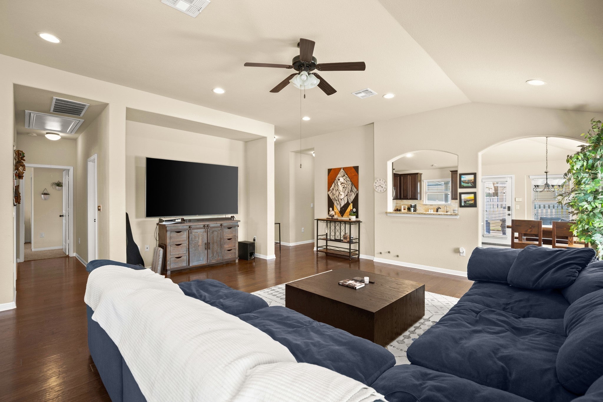 FOR LEASE – Easygoing, single-story living in Pflugerville’s Highland Park. Set on a sprawling corner lot, this home pairs a private, fenced backyard with alley-access garage convenience. Inside, the layout flows effortlessly: three generously sized bedrooms, two full baths, a bright, open living space, and an eat-in kitchen that actually invites you to linger. High ceilings, recessed lighting, hardwood floors, and ceiling fans keep things airy and comfortable throughout. The kitchen connects seamlessly to the living area with arched openings and bar seating - perfect for casual hangouts or hosting friends. You’ll find granite counters, stainless appliances, ample cabinetry, pantry storage, and a spacious dining area. Step out back to a covered patio ready for grilling or unwinding. The primary suite is tucked away for privacy, offering a roomy retreat with dual vanities, garden tub, separate shower, and walk-in closet. Secondary bedrooms are well-sized with soft carpeting and tall ceilings. Laundry is in-home, and all appliances are included. Out back, enjoy a perfectly sized fence-in yard with a classic white picket touch and plenty of space to relax or play. Major bonus with lawn mowing service provided by landlords along with on-going weed and feed to support healthy lawn! Highland Park residents have access to a community pool, playground, sports courts, and miles of sidewalks and trails - all within reach of top Pflugerville schools. Available now - come take a tour today! **Pets Negotiable, limited number, limited size, subject to landlord approval with a $350 deposit per pet and a one time, non-refundable $350 pet fee.**