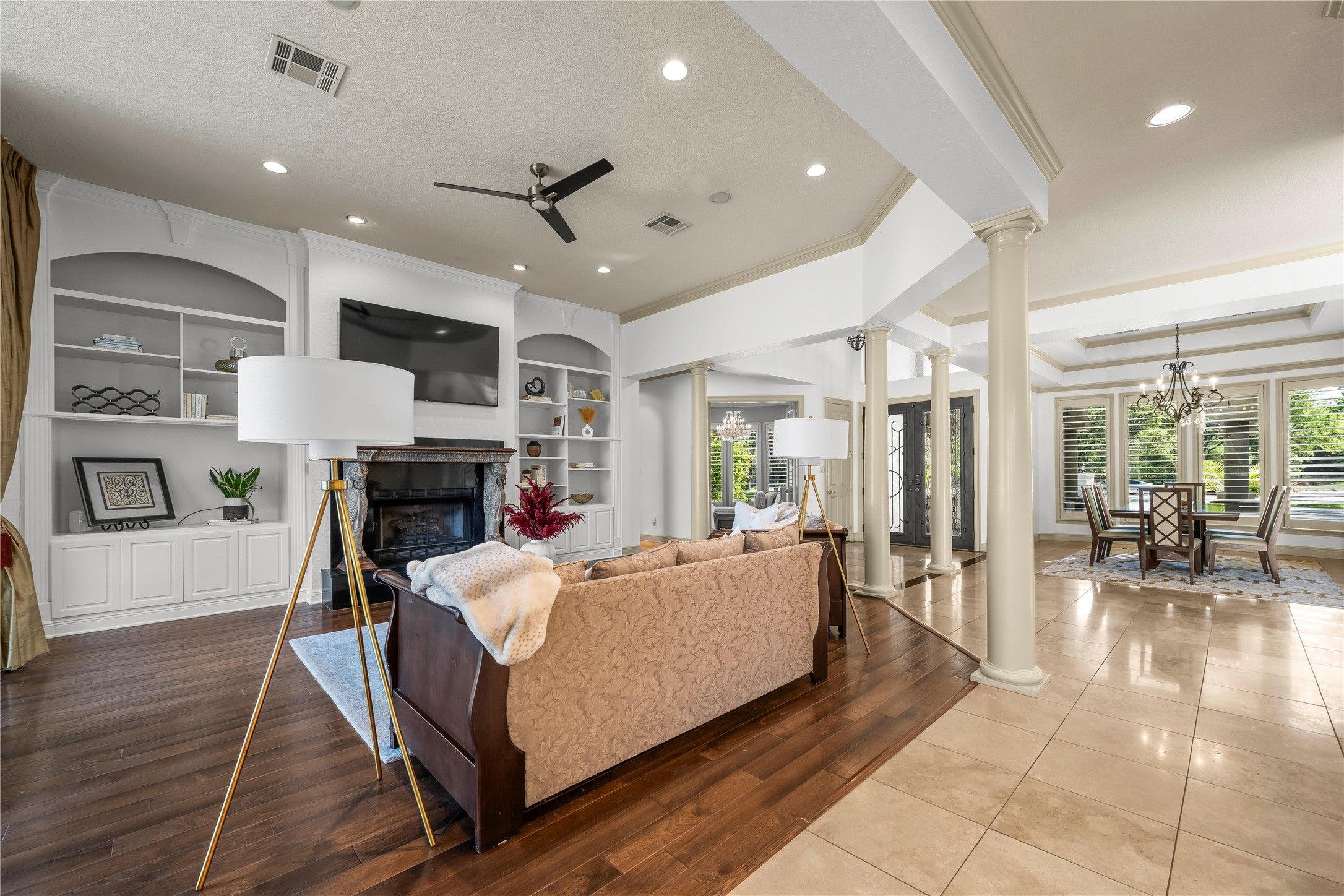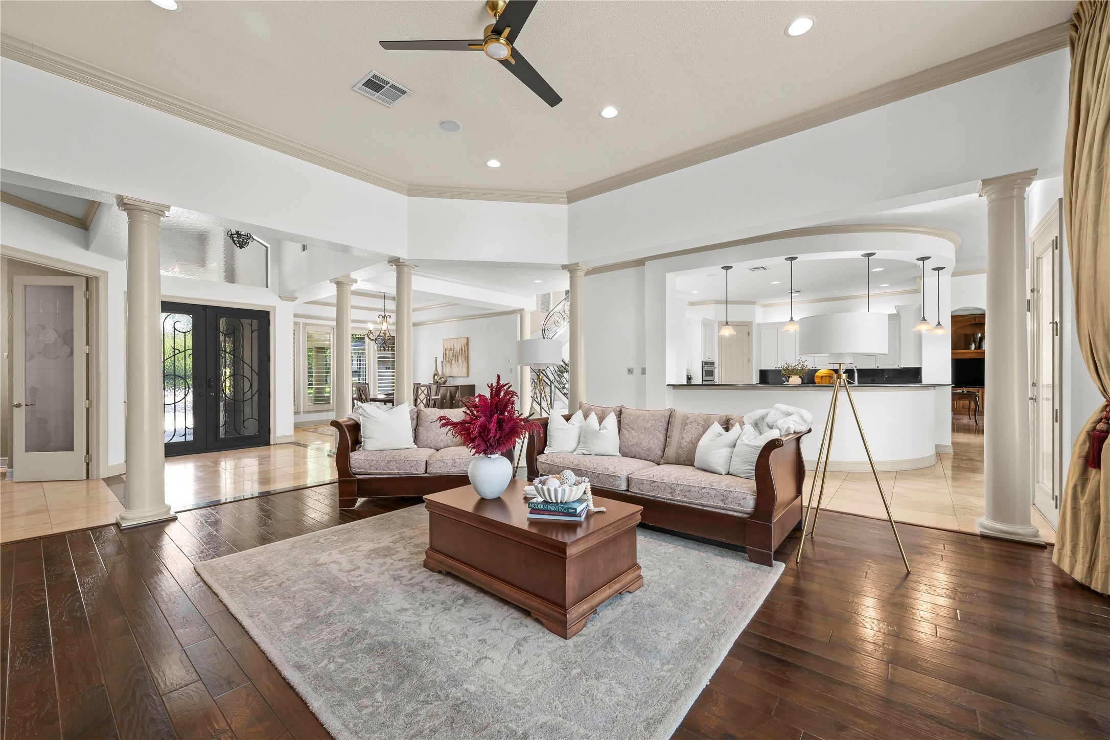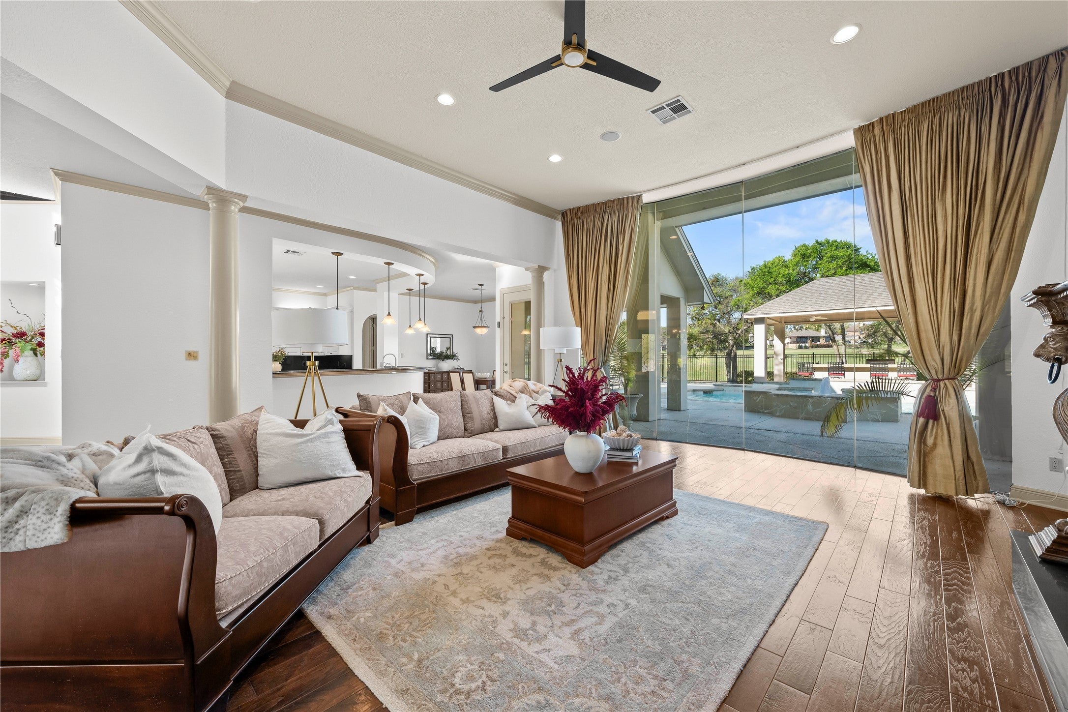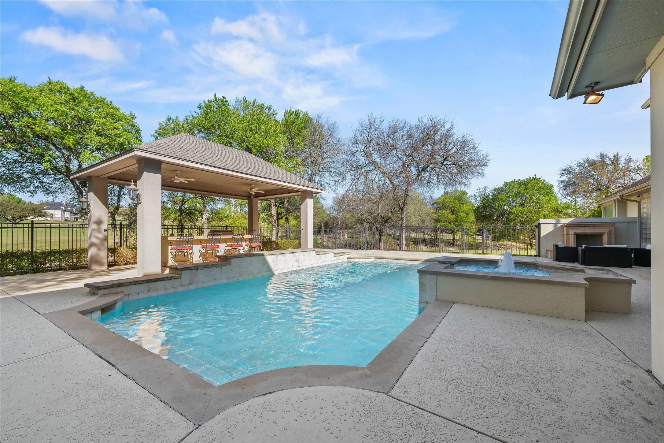 Step into refined luxury with this stunning, one-of-a-kind estate offering over 5,000 square feet of thoughtfully designed living space, perfectly positioned on a premier golf course lot. Nestled on a private, sprawling one-acre setting, this exceptional residence blends elegance, comfort, and exclusivity. Featuring 4 spacious bedrooms and 4.5 beautifully appointed bathrooms, every inch of this custom home showcases high-end craftsmanship and timeless design. Multiple living areas provide flexibility for both grand entertaining and intimate gatherings, while expansive windows frame breathtaking golf course views and fill the home with natural light. This fully integrated smart home elevates everyday living with a whole-home automated music system controllable by app, Lutron lighting throughout the front yard, main living spaces, and backyard—operable from anywhere in the world—Nest thermostat and front door lock with remote access, and top-of-the-line surround sound. The gourmet kitchen opens seamlessly to the main living areas, while the luxurious primary suite offers a spa-like retreat featuring heated floors and a steam sauna. Guest bath also includes spa-inspired upgrades. Additional highlights include an instant and tankless water heater, new roof, updated insulation, new water softener, and kitchen water filtration system. Enjoy a separate workout/game room in the garage, a resurfaced pool deck, new pool motors, and new fencing. Step outside to your private backyard oasis complete with a sparkling pool, generous patio space, and lush landscaping—perfect for relaxing or entertaining in total privacy