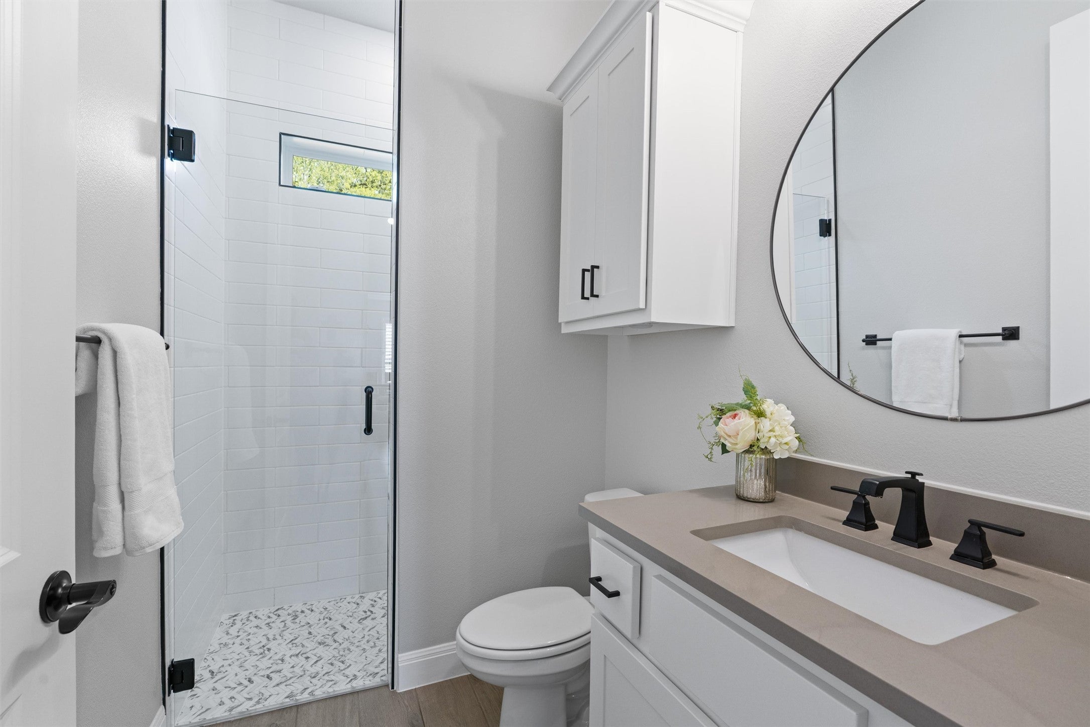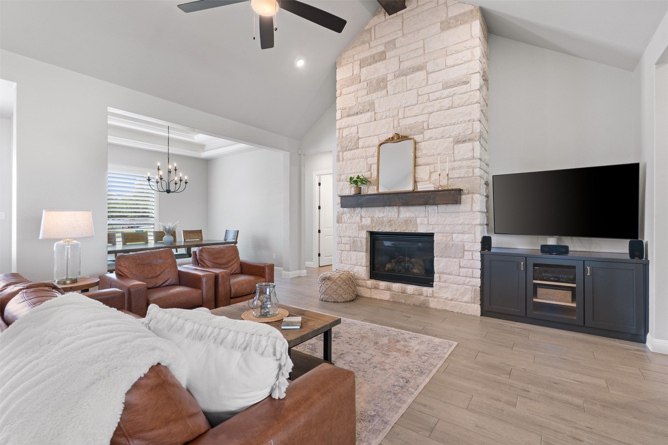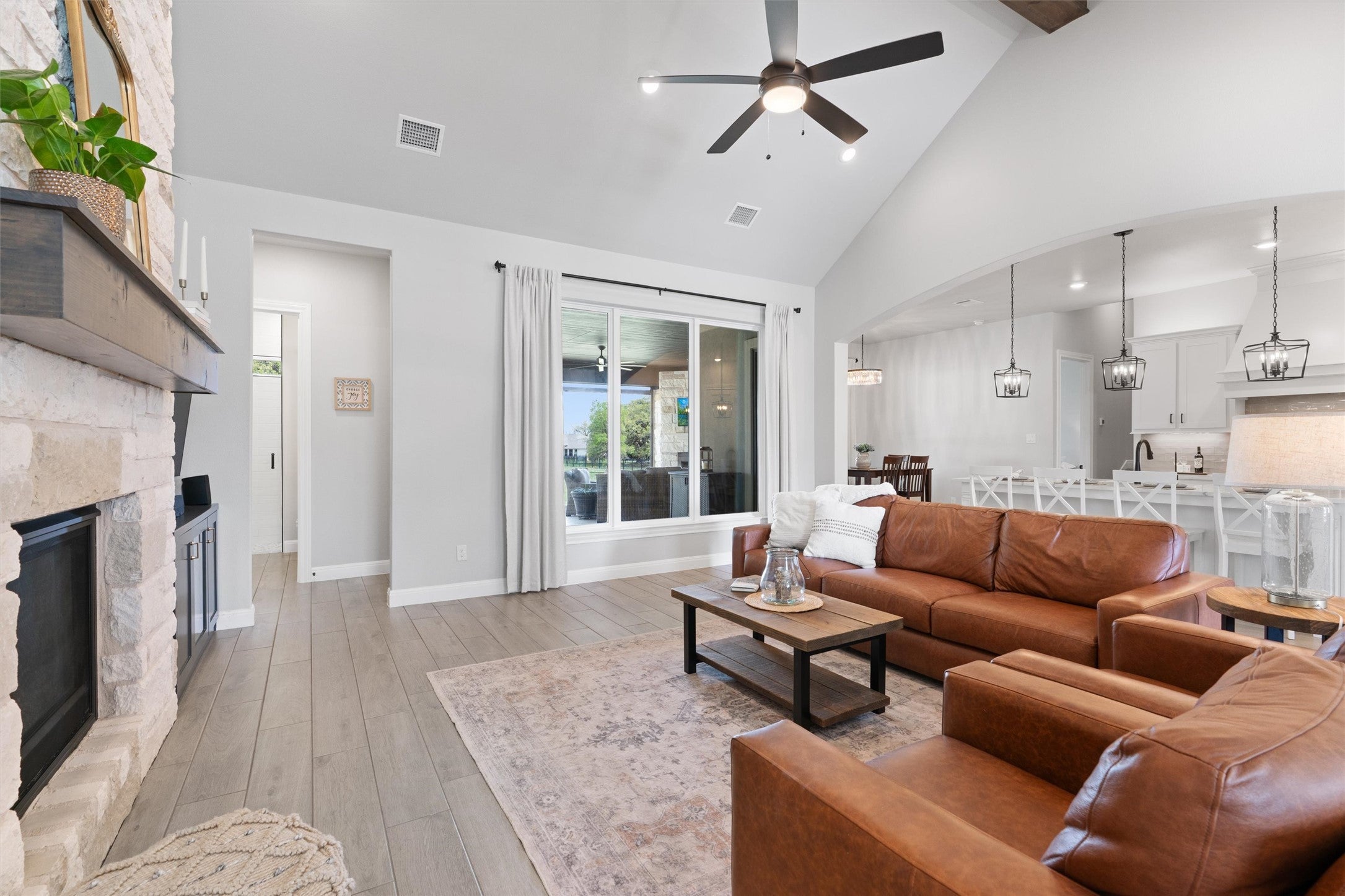 Nestled on 1.24 scenic acres, this stunning Hill Country estate exudes timeless elegance and practical design. Every detail has been thoughtfully crafted for a seamless connection between indoor and outdoor living. Designed to live like a single-story home, all bedrooms are thoughtfully located on the main level while a spacious bonus room accompanied by a full bath awaits upstairs. Stepping through the entry you're greeted by French doors to your right revealing a home office, while to your left, a formal dining room is crowned by a stunning tray ceiling. Further in, the open-concept living room steals the show with soaring ceilings and a striking stone fireplace that commands attention. The heart of the home is a gourmet kitchen featuring pristine white cabinetry, quartz counters, and built-in appliances, including a gas range and double ovens. The owner’s retreat features private patio access and a spa-inspired ensuite with dual vanities, a soaking tub, and a luxurious rain shower. Three additional bedrooms are complemented by two full baths, one with a walk-in shower and the other with a tub/shower combo. While the interior is undeniably captivating, the outdoor spaces elevate this home to another level. The oversized covered patio is perfect for entertaining with a built-in grill, sink, and ample counter space. An outdoor fireplace invites you to relax while enjoying the Hill Country views, and automatic screens provide flexibility for year-round enjoyment. Situated in a thriving master-planned community, you’ll enjoy the rare combination of peaceful acreage living and modern convenience. Sports courts, scenic trails, parks, and a host of nearby amenities, including Historic DT Georgetown, and Benold Middle School are all minutes away. This home perfectly captures the essence of what makes the greater Austin area so special—stunning natural beauty and unmatched convenience. Discover the best of Hill Country living at 210 Miranda Way. New HEB is 2 minutes away.