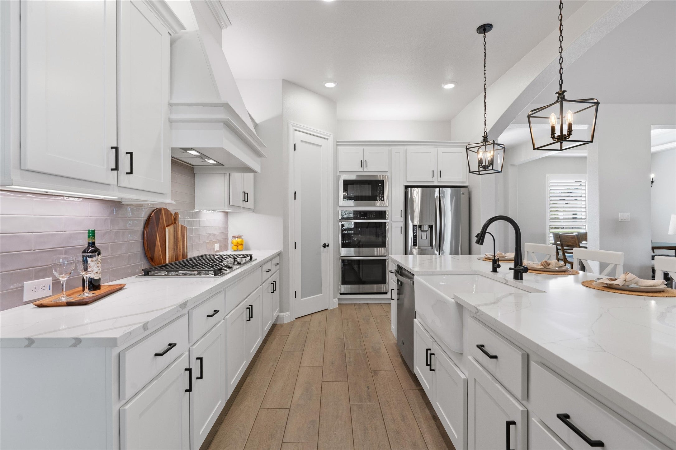 - Built-In Gas Range, Built-In Oven, Double Oven, Dishwasher, Exhaust Fan, Disposal, Gas Water Heater, Microwave, Range Hood, Water Softener Owned, Stainless Steel Appliance(s)